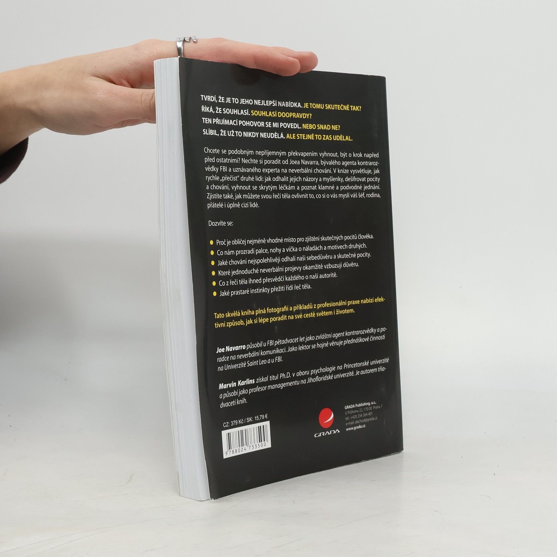 Tvrdí, že je to jeho nejlepší nabídka. Je tomu ale skutečně tak? Říká, že souhlasí. Opravdu? Slibuje, že už to nikdy neudělá. Ale stejně to zase udělal... Chcete se podobným nepříjemným překvapením vyhnout, být o krok napřed před ostatními? Nechte si poradit od Joea Navarra, bývalého agenta kontrarozvědky FBI a uznávaného experta na neverbální chování. V knize vysvětluje, jak rychle "přečíst" druhé lidi: jak odhalit jejich názory a myšlenky, dešifrovat pocity a chování, vyhnout se skrytým léčkám a poznat klamné a podvodné jednání. Dozvíte se například, proč je tvář nejméně spolehlivá oblast pro odhalení skutečných pocitů druhého člověka, co o našich náladách a motivech vyzradí palce, nohy nebo oční víčka, jaké chování prozrazuje naši sebedůvěru a pocity nebo s jakou neverbální komunikací podpoříte vzájemnou důvěru a svou autoritu. Zjistíte také, jak můžete svou řečí těla ovlivnit to, co si o vás myslí váš šéf, rodina, přátelé i úplně cizí lidé.