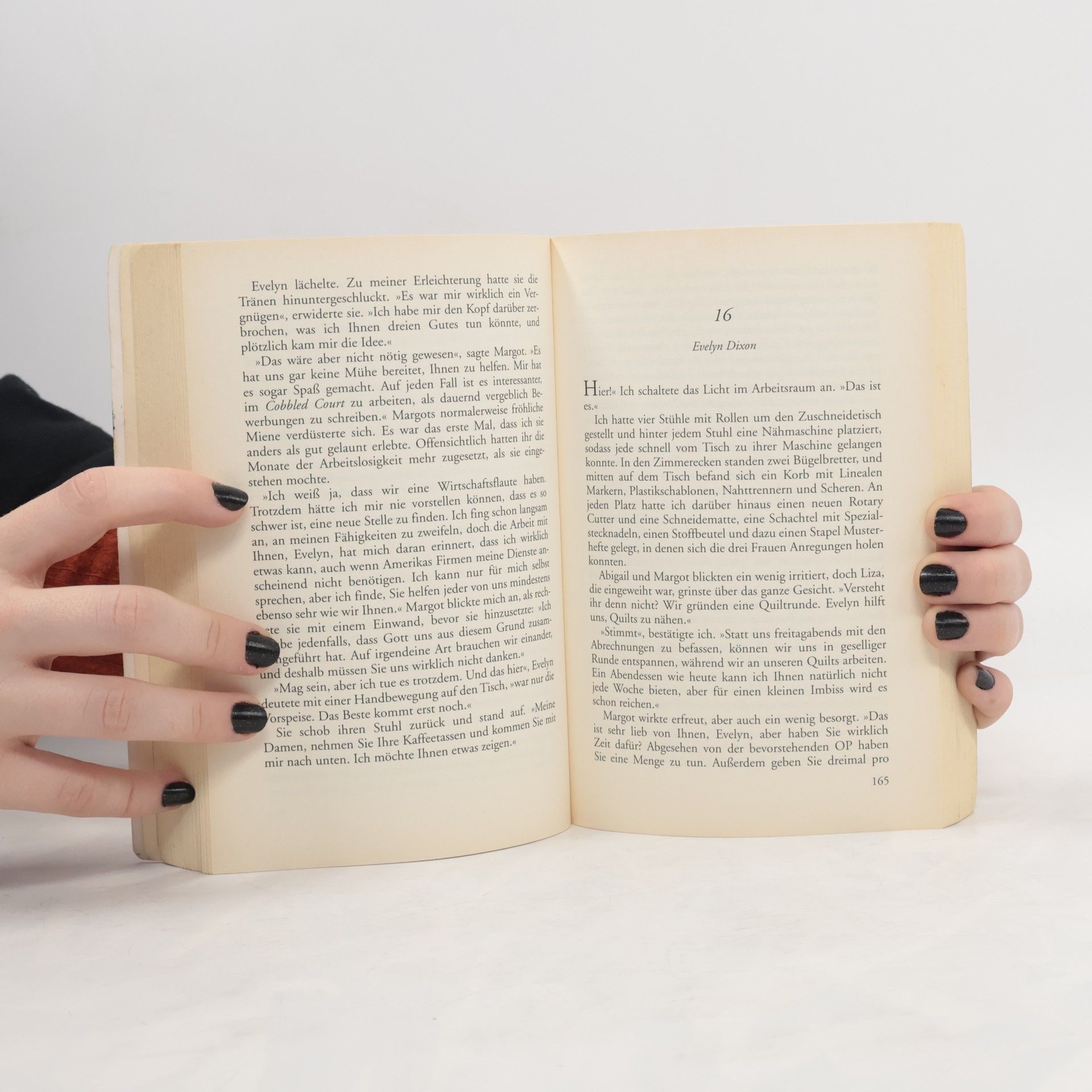 Die Scheidung von ihrem Mann war ein endloses Knäuel von Scherereien. Jetzt nimmt Evelyn den verloren geglaubten Faden ihres Lebens wieder auf: Mit ihrem eigenen Quilt-Laden macht sie sich selbstständig. Bald finden sich zu ihren Handarbeitskursen sehr unterschiedliche Frauen ein. Zwischen Evelyn, Abigail, Liza und Margot entspinnt sich ein dichtes Netz der Freundschaft - auch in schwerer Zeit...