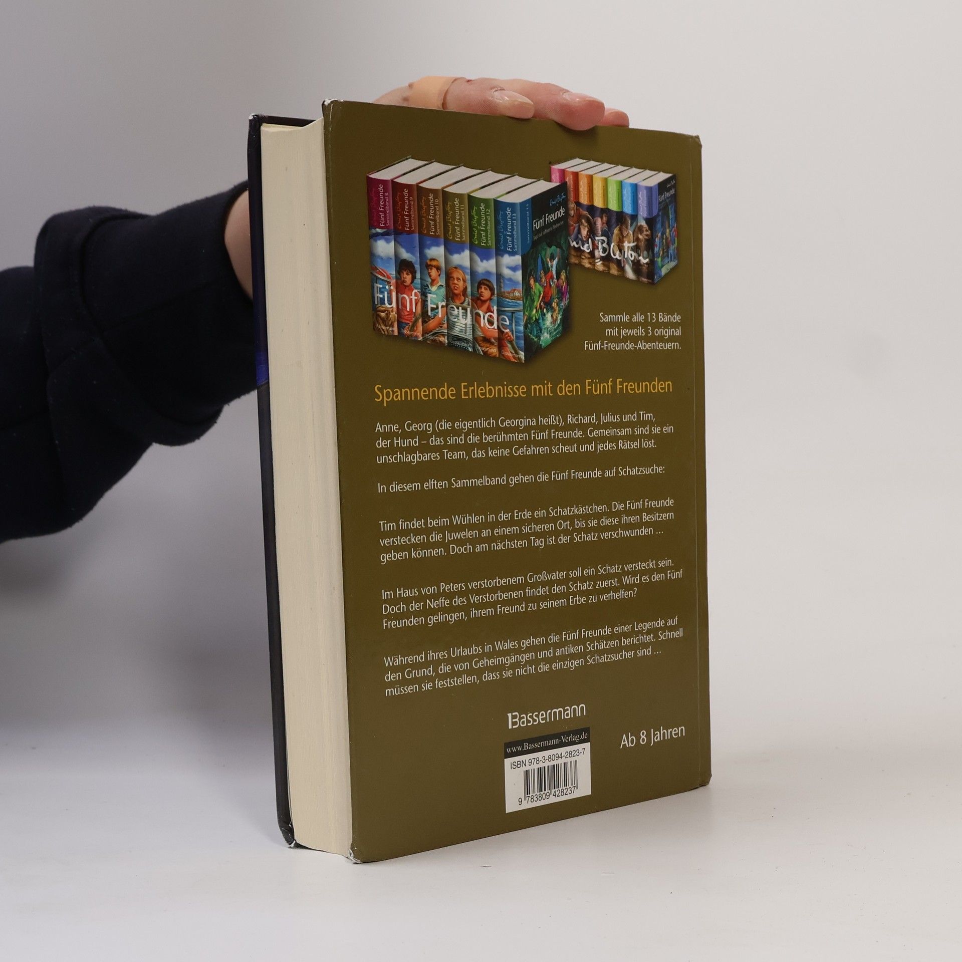 Spannung pur mit den Fünf Freunden Seit über 50 Jahren fiebern Kinder mit, wenn die Fünf Freunde Anne, Georg (die eigentlich Georgina heißt), Richard, Julius und der Hund Tim in alten Gemäuern, dunklen Höhlen oder unterirdischen Gängen verborgene Schätze aufspüren oder sich gegen finstere Gestalten behaupten. In diesem elften Sammelband gehen die Fünf Freunde auf Schatzsuche. Für die kleinen Leser Spannung pur: „Fünf Freunde und die geheimnisvolle Schatztruhe“, „Fünf Freunde und die seltsame Erbschaft“ und „Fünf Freunde suchen den verschollenen Goldschatz“.
