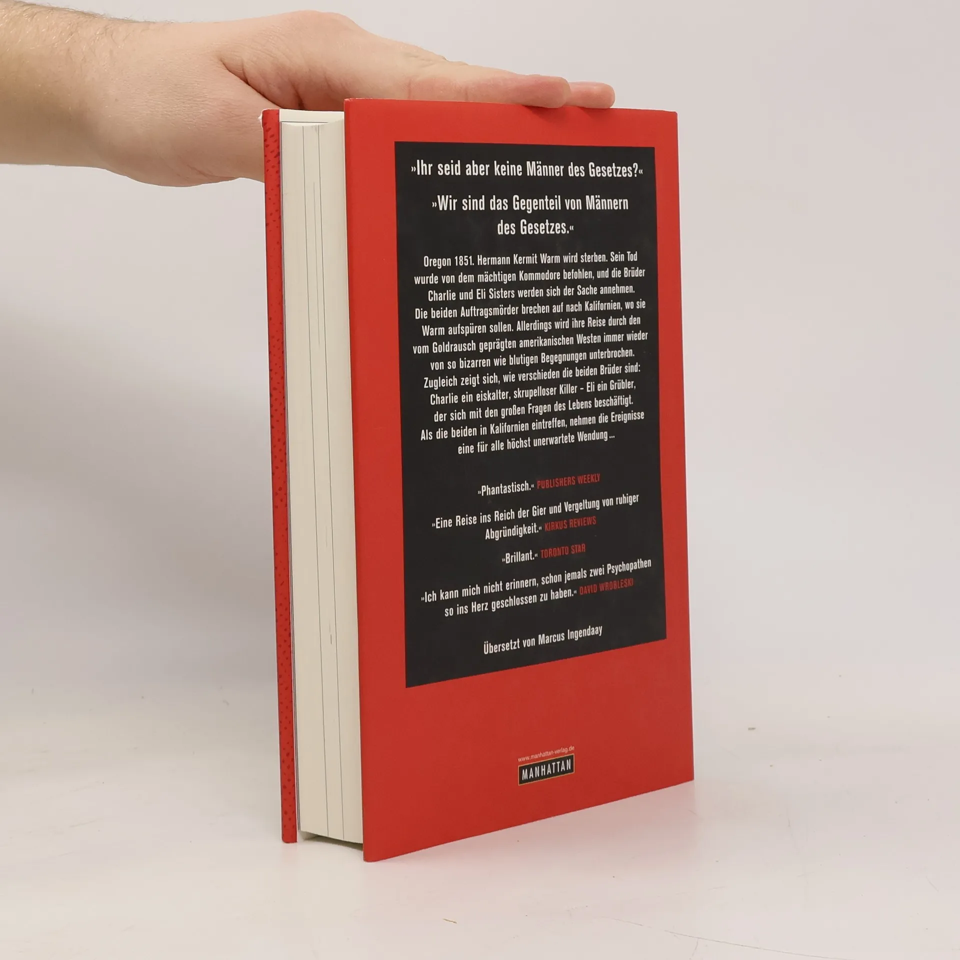 Ein tragikomischer Roman über zwei Auftragsmörder und ihre blutige, bizarre Reise durch Amerikas Westen im Jahre 1851 Hermann Kermit Warm wird sterben. Sein Tod wurde von dem geheimnisvollen und mächtigen Kommodore befohlen, und die Brüder Charlie und Eli Sisters werden den Auftrag ausführen. Die beiden machen sich auf den Weg von Oregon nach Kalifornien, wo sie Warm aufspüren sollen. Ihre Reise durch den vom Goldrausch geprägten amerikanischen Westen wird allerdings immer wieder von bizarren und blutigen Begegnungen unterbrochen. Zugleich zeigt sich, wie verschieden die beiden Brüder sind: Charlie ein eiskalter, skrupelloser Killer – Eli ein Grübler, der sich mit geradezu existenziellen Fragen beschäftigt. Er beginnt an seinem Beruf zu zweifeln – und an seinem Partner. Doch als die beiden schließlich in Kalifornien eintreffen, nehmen die Ereignisse eine höchst unerwartete Wendung …