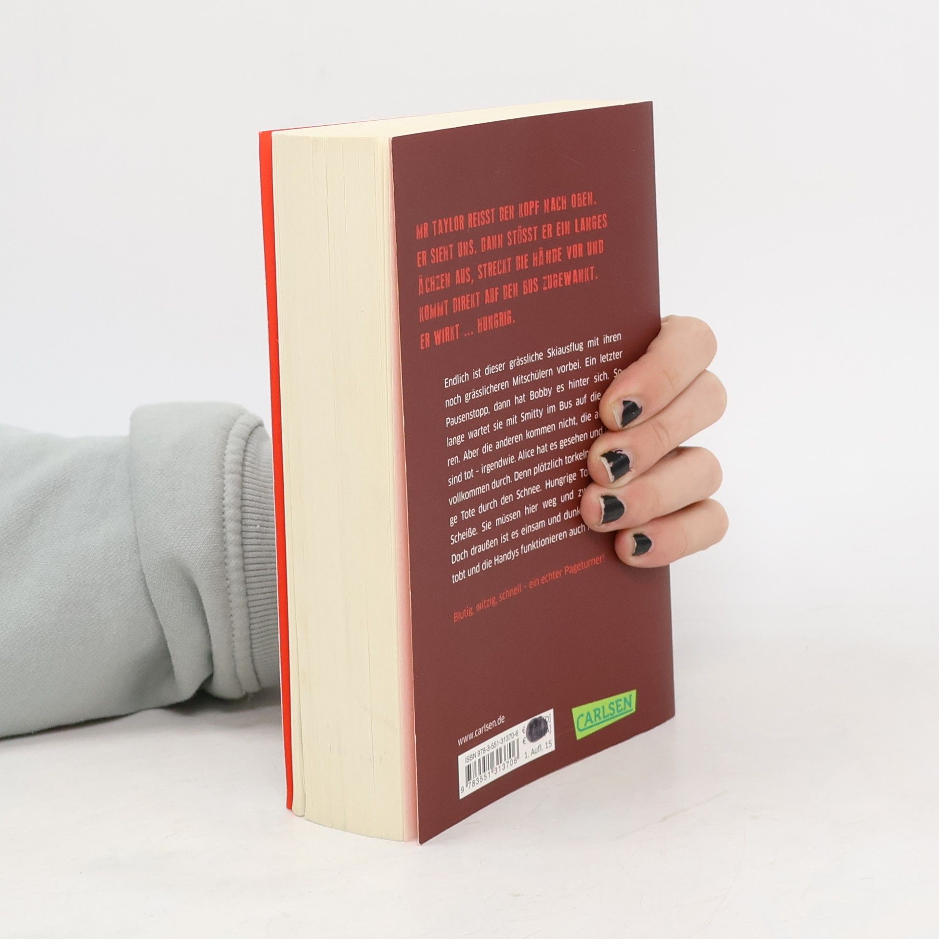 Noch ein letzter Pausenstopp, dann hat Bobby es geschafft. Dann ist der grässliche Skiausflug mit den noch grässlicheren Mitschülern vorbei. Genervt wartet sie mit Smitty im Bus auf die anderen. Aber die anderen kommen nicht, die anderen sind tot – Alice hat es gesehen und dreht vollkommen durch. Schöne Scheiße. Sie müssen hier weg und zwar schnell! Denn plötzlich wanken diese Toten auf den Bus zu und sie sehen verdammt hungrig aus. Doch draußen ist es dunkel, der Schneesturm tobt und die Handys funktionieren auch nicht …