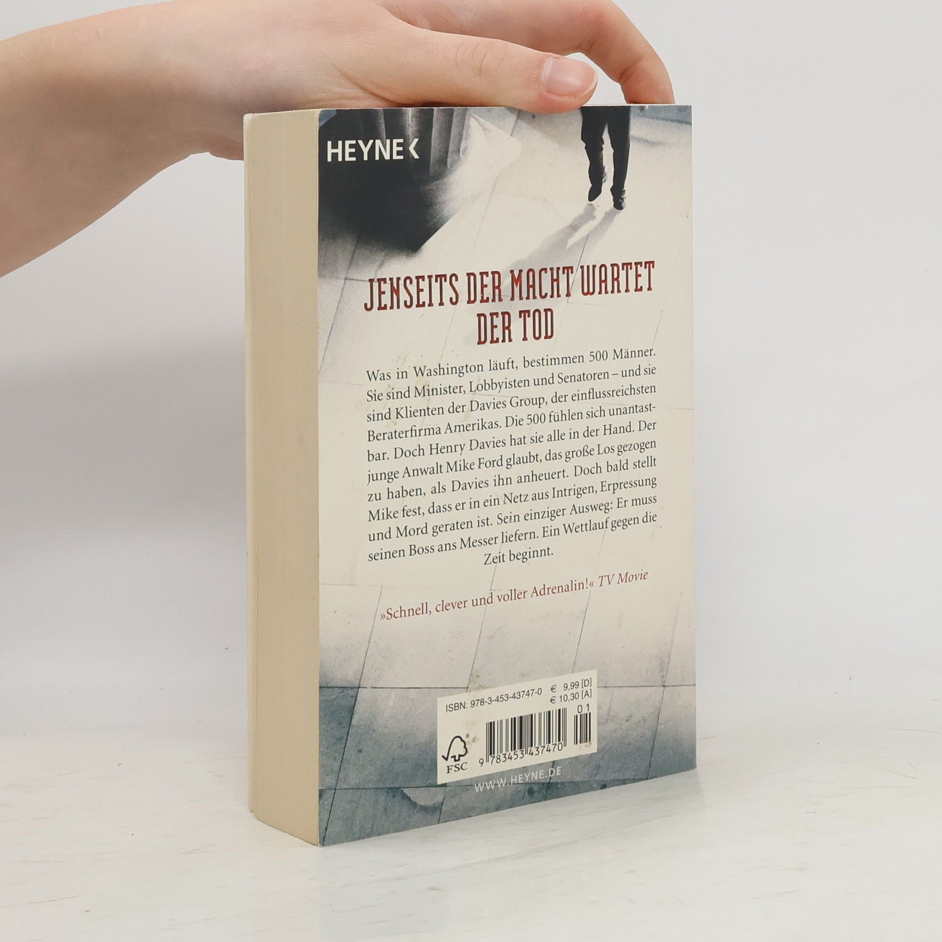 Jenseits der Macht ... wartet der TodWas in Washington läuft, bestimmen 500 Männer. Sie sind Minister, Lobbyisten und Senatoren – und die Klienten der Davies Group, der einflussreichsten Beraterfirma der Hauptstadt. Sie fühlen sich unantastbar. Doch Henry Davies hat sie alle in der Hand. Der junge Anwalt Mike Ford glaubt das große Los gezogen zu haben, als Davies ihn anheuert. Doch bald stellt Mike fest, dass er in ein Netz aus Intrigen, Erpressung und Mord geraten ist. Sein einziger Ausweg: Er muss seinen Boss ans Messer liefern, bevor der bemerkt, dass seine Machenschaften aufgeflogen sind. Ein Wettlauf gegen die Zeit beginnt.