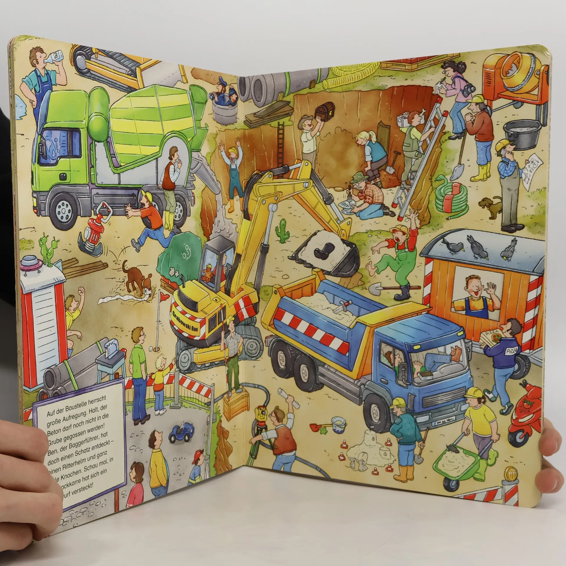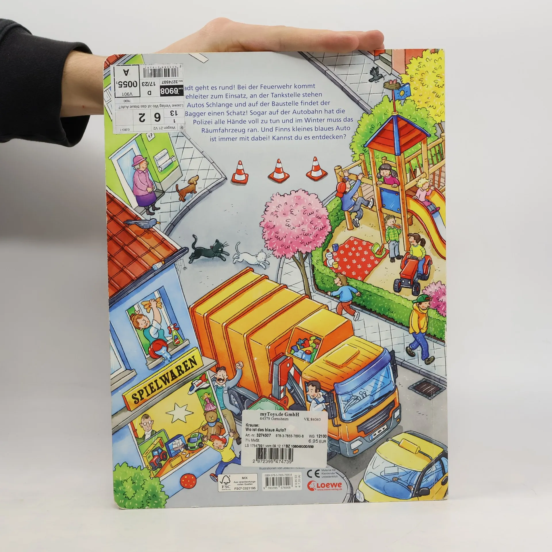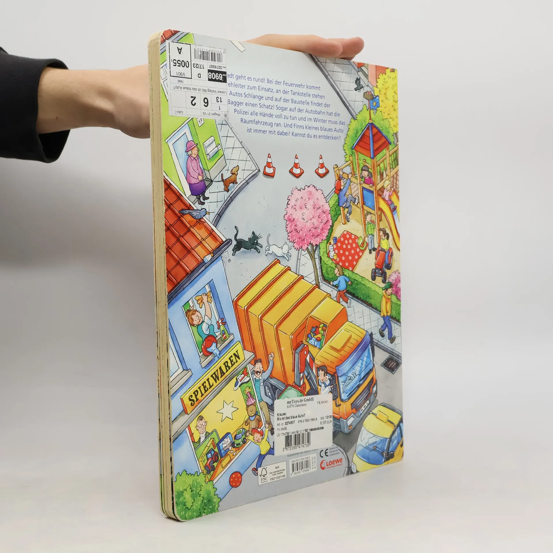 In der Stadt geht es rund! Bei der Feuerwehr kommt die Drehleiter zum Einsatz, an der Tankstelle stehen die Autos Schlange und auf der Baustelle findet der Bagger einen Schatz! Sogar auf der Autobahn hat die Polizei alle Hände voll zu tun und im Winter muss das Räumfahrzeug ran. Und Finns kleines blaues Auto ist immer mit dabei! Kannst du es entdecken?