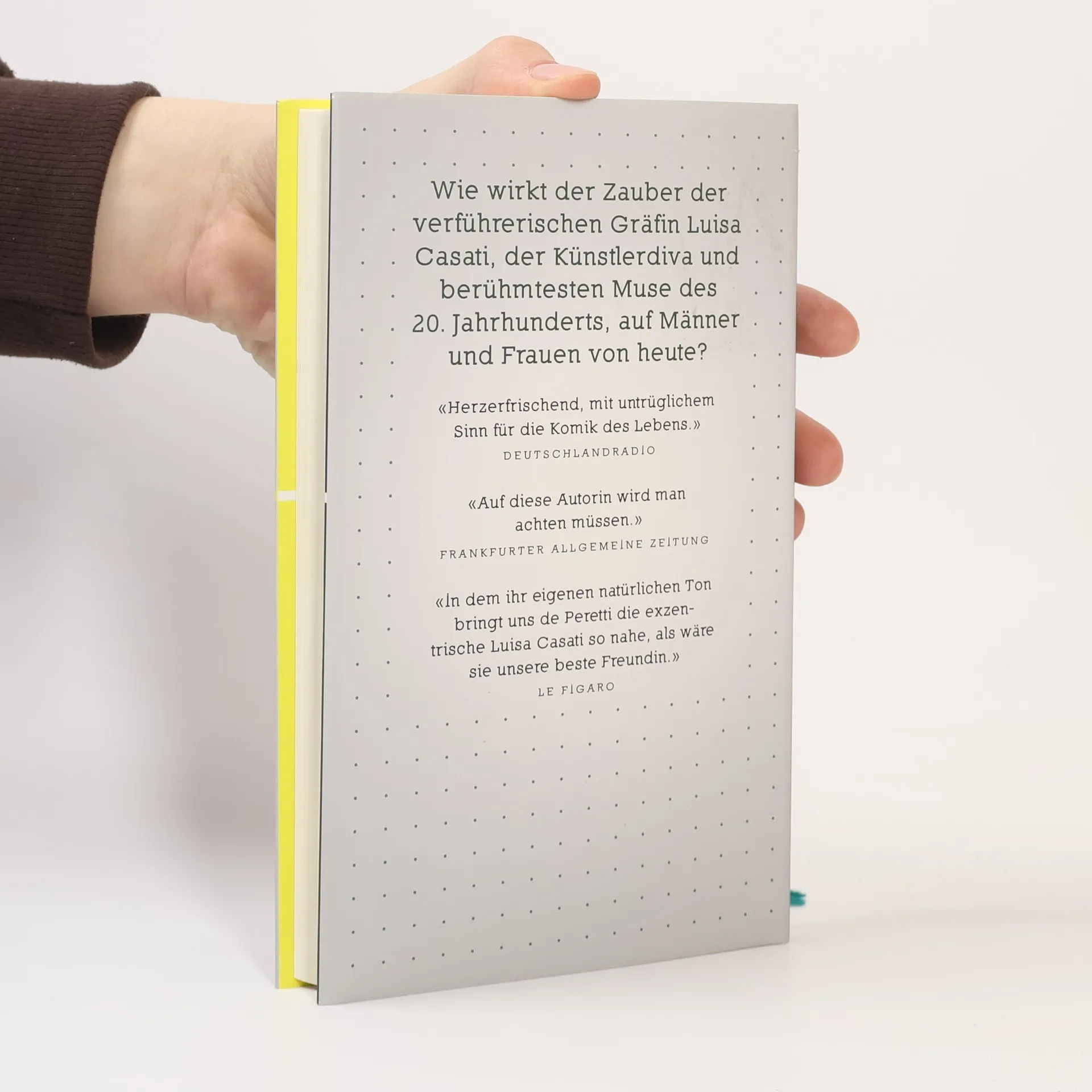 Eine junge Frau blickt auf ihren Ehealltag und in ihren Kleiderschrank und vergleicht ihre bescheidene Existenz mit dem extravaganten Lebensstil der verführerischen Gräfin Casati. Luisa Casati, die italienische Künstlerdiva, die Geliebte Gabriele d’Annunzios, gilt nach der Madonna und Kleopatra als die meistporträtierte Frau der Kunstgeschichte. Über hundert Künstler haben sie gemalt und fotografiert – von Giacomo Balla bis Andy Warhol. Die Ich-Erzählerin in Camille de Perettis bezauberndem Roman ist wie elektrisiert von der berühmten Muse: So oft wurde sie dargestellt, Coco Chanel, Christian Dior und Karl Lagerfeld haben Kollektionen nach ihr benannt – und wie wenig weiß man heute über sie! Luisa Casatis Auftritte waren provokant, ihre Feste legendär. Um den Hals trug sie eine lebende Boa und die Bissspuren ihres Geliebten. Sie lebte auf Capri, in Paris, London und Venedig – im Palazzo Casati in Venedig ist das Guggenheim Museum untergebracht. Die Ich-Erzählerin hingegen trifft ihre Freunde in Fast-Food-Restaurants, liest nachts Nabokov und schreibt Geschichten in ihr Tagebuch. Wie unmondän! Selbstironisch und humorvoll, mit dem liebevollen und zugleich bitterbösen Blick in die Seele, den wir aus «Wir werden zusammen alt» kennen, schreibt Camille de Peretti über weibliche Heldenmythen und über Wünsche, Nöte und Sehnsüchte von Frauen.