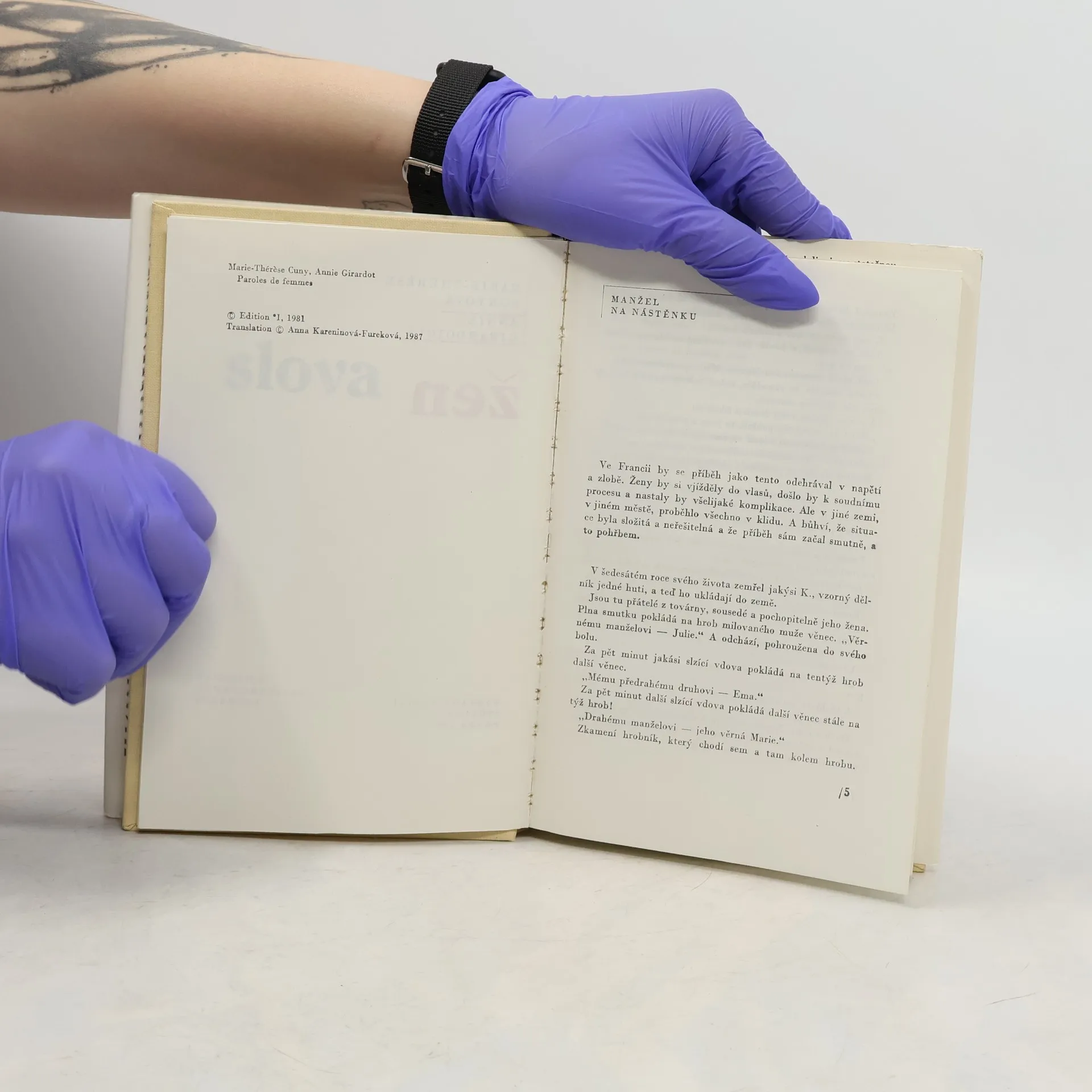 U nás dobře známá francouzská herečka Annie Girardotová četla svého času v rozhlase na stanici Europe 1 ráno co ráno po jednom příběhu žen své doby. Žen mladých, starých, svobodných i dlouhá léta vdaných, žen moderních i tradičních, které však mají jedno společné: ani jedna z nichnežije na úkor ostatních, ani jedna z nich není bohatě zajištěnou, znuděnou paničkou, jejíž jedinou činností je vymýšlet si problémy. Tyto ženy se musí potýkat s problémy skutečnými, ať už uvnitř rodiny, nebo spoločenskými, a každá z nich je řeší svým osobitým způsobem. Čtyřicet těchto příběhů pak Annie Girardotová za pomoci Marie Thérése Cunyové shromáždila v souboru Slova žen. Povídky mají čapkovské ladění, nelamentují, nedramatizují, snaží se porozumět lidem a v prostých věcech najít malá hrdinství i velké oběti.