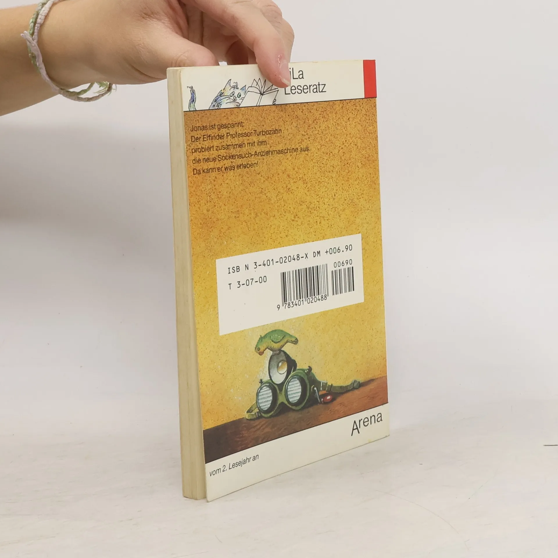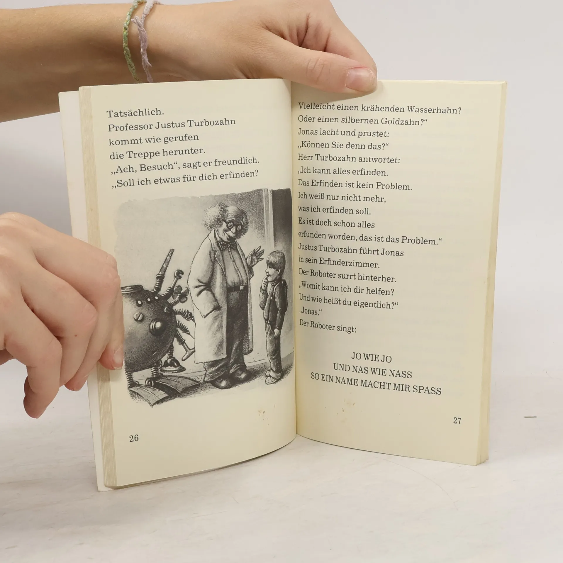 Jonas ist ein kleiner Morgenmuffel. Die Sonne blendet ihn beim Aufwachen und ständig muss er alle seine Kleider zusammensuchen. Da wäre eine Morgenbrille und eine Sockensuch- und Anziehmaschine schon etwas Schönes. Als Jonas den neuen Nachbarn, Erfinder und Professor Justus Turbozahn kennenlernt, werden seine Träume Wirklichkeit. Beim Ausprobieren der Sockensuch-Anziehmaschine passiert jedoch Unvorhergesehenes. (Quelle: Verzeichnis ZKL)