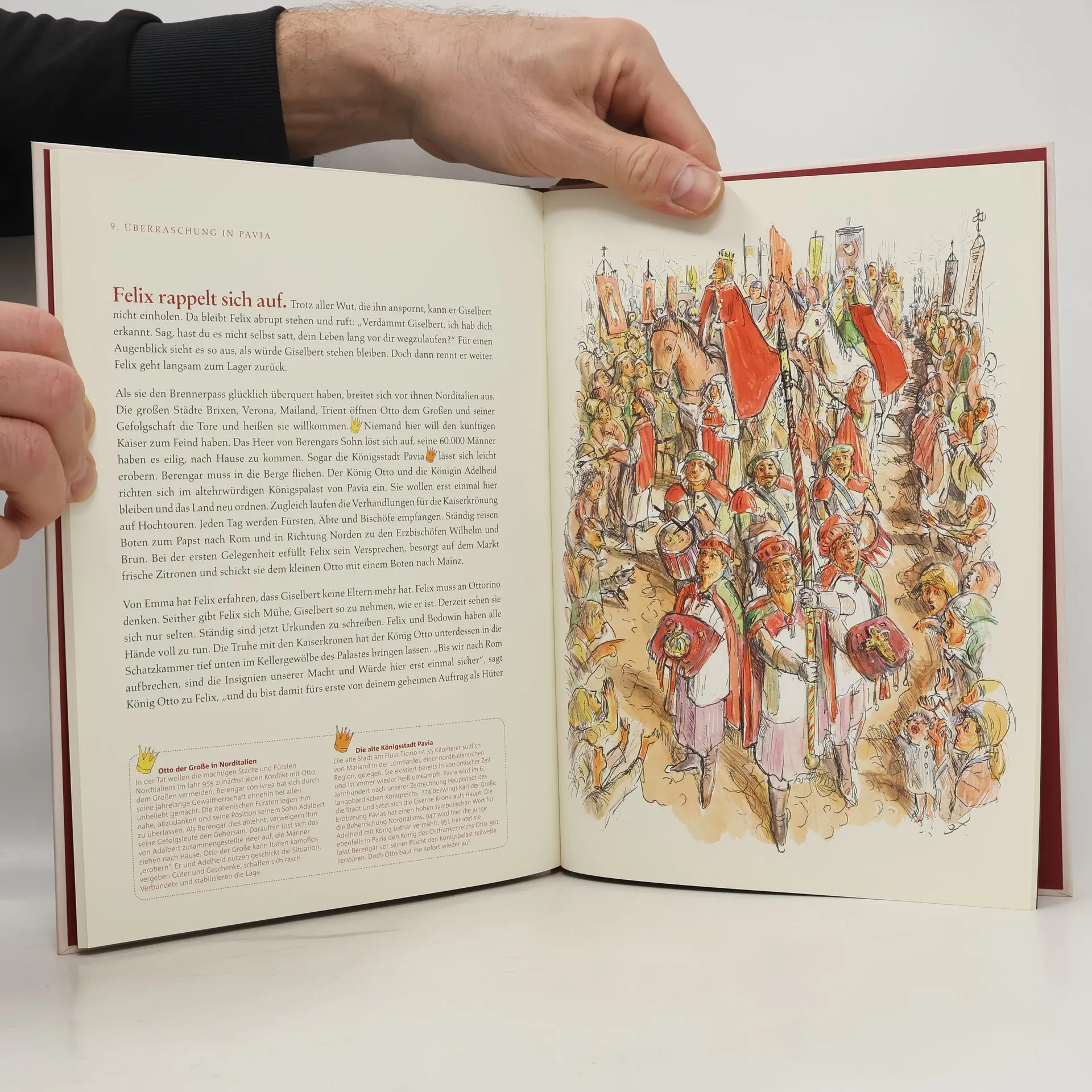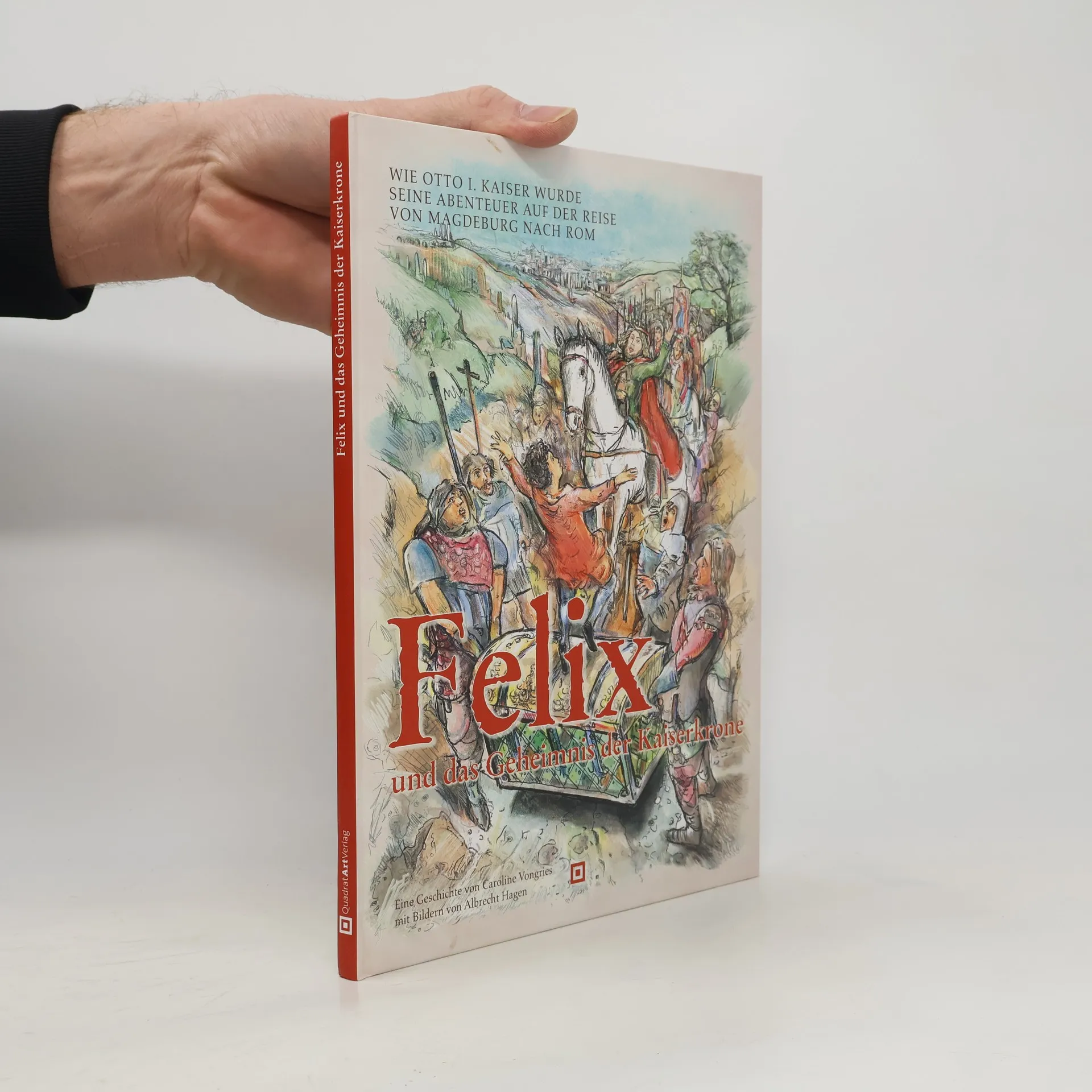 »Felix und das Geheimnis der Kaiserkrone« lädt zu einer Entdeckungsreise in die mittelalterliche Vergangenheit ein. Es geht fast 1100 Jahre zurück ins 10. Jahrhundert! Magdeburg war die Lieblingsresidenz Ottos des Großen. Felix ein Junge aus dem heutigen Magdeburg, landet unversehens vor den Füßen des Königs, der gerade nach Rom aufbricht, um sich dort zum Kaiser krönen zu lassen. Als Page Ottos des Großen erlebt Felix viele Abenteuer und erhält einen geheimnisvollen Auftrag. Es geht um die Kaiserkrone... Die historischen Fakten, auf der die Abenteuergeschichte basiert, hat die Autorin und Journalistin Caroline Vongries (Romanikpreis 2009) präzise recherchiert. Ganzseitige Illustrationen des Grafikers Albrecht Hagen lassen die Ereignisse auch optisch lebendig werden. Erklärende Darstellungen historischer Ereignisse ergänzen den Text, so dass auch der erwachsene Leser allerhand Wissenswertes in komprimierter Form erfährt.