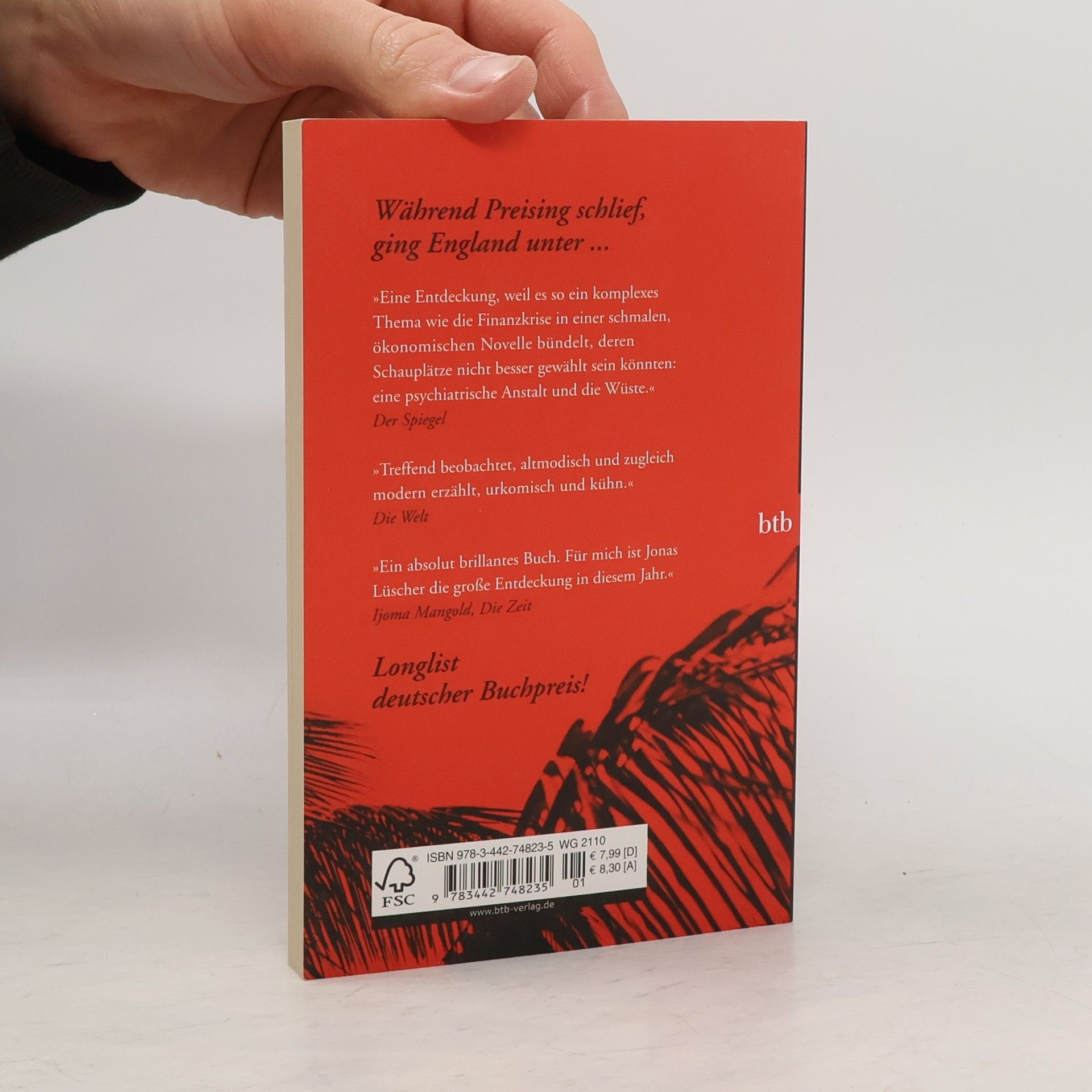 Während Preising schlief, ging England unter … Der Schweizer Fabrikerbe Preising wird in einem tunesischen Oasenresort zur Hochzeit reicher, junger Engländer aus der Londoner Finanzwelt eingeladen. Während die Festgesellschaft sich in ihren Betten noch von den Strapazen des ausschweifenden Festes erholt, verkündet England den Staatsbankrott. Und mit gesperrten Kreditkarten, in der Wüste gestrandet, plötzlich überschuldet und arbeitslos geworden, scheint es nur ein kurzer Schritt zurück in die Barbarei. Spannend, klug konstruiert, durchaus auch komisch, mit unvergesslichen Bildern und einer reichen, beweglichen Sprache erzählt, seziert dieses Buch menschliche Schwächen und zielt dabei mitten ins Herz der Gegenwart.