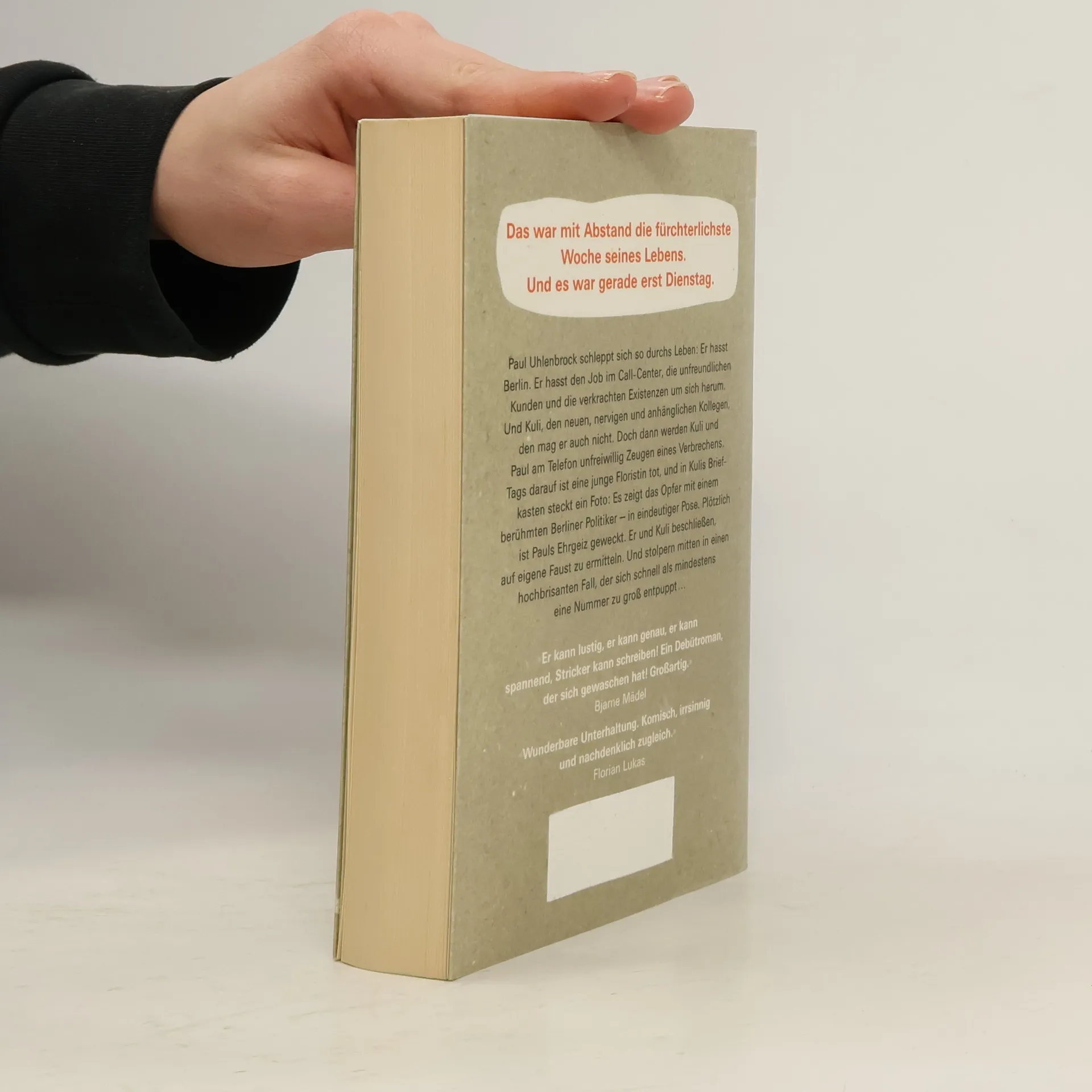 «Das war mit Abstand die fürchterlichste Woche seines Lebens. Und es war gerade erst Dienstag.» Paul Uhlenbrock schleppt sich so durchs Leben: Er hasst Berlin. Er hasst den Job im Call-Center, die unfreundlichen Kunden und die verkrachten Existenzen um sich herum. Und Kuli, den neuen, nervigen und anhänglichen Kollegen, den mag er auch nicht. Doch dann werden Kuli und Paul am Telefon unfreiwillig Zeugen eines Verbrechens. Tags darauf ist eine junge Floristin tot, und in Kulis Briefkasten steckt ein Foto: Es zeigt das Opfer mit einem berühmten Berliner Politiker - in eindeutiger Pose. Plötzlich ist Pauls Ehrgeiz geweckt. Er und Kuli beschließen, auf eigene Faust zu ermitteln. Und stolpern mitten in einen hochbrisanten Fall, der sich schnell als mindestens eine Nummer zu groß entpuppt …