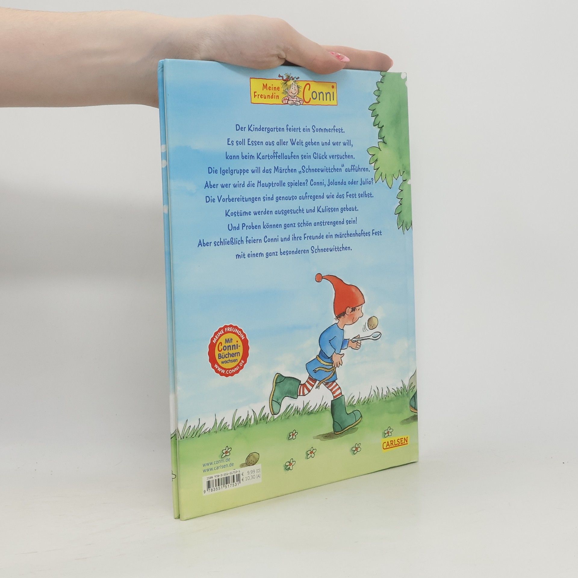 Der Kindergarten feiert ein Sommerfest. Es soll Essen aus aller Welt geben und wer will, kann beim Kartoffellaufen sein Glück versuchen. Die Igelgruppe will das Märchen „Schneewittchen“ aufführen. Aber wer wird Schneewittchen spielen? Conni, Jolanda oder Julia? Die Vorbereitungen sind genauso aufregend wie das Fest selbst. Kostüme werden ausgesucht und Kulissen gebaut. Und Proben können ganz schön anstrengend sein! Aber schließlich feiern Conni und ihre Freunde ein märchenhaftes Fest mit einem ganz besonderen Schneewittchen.