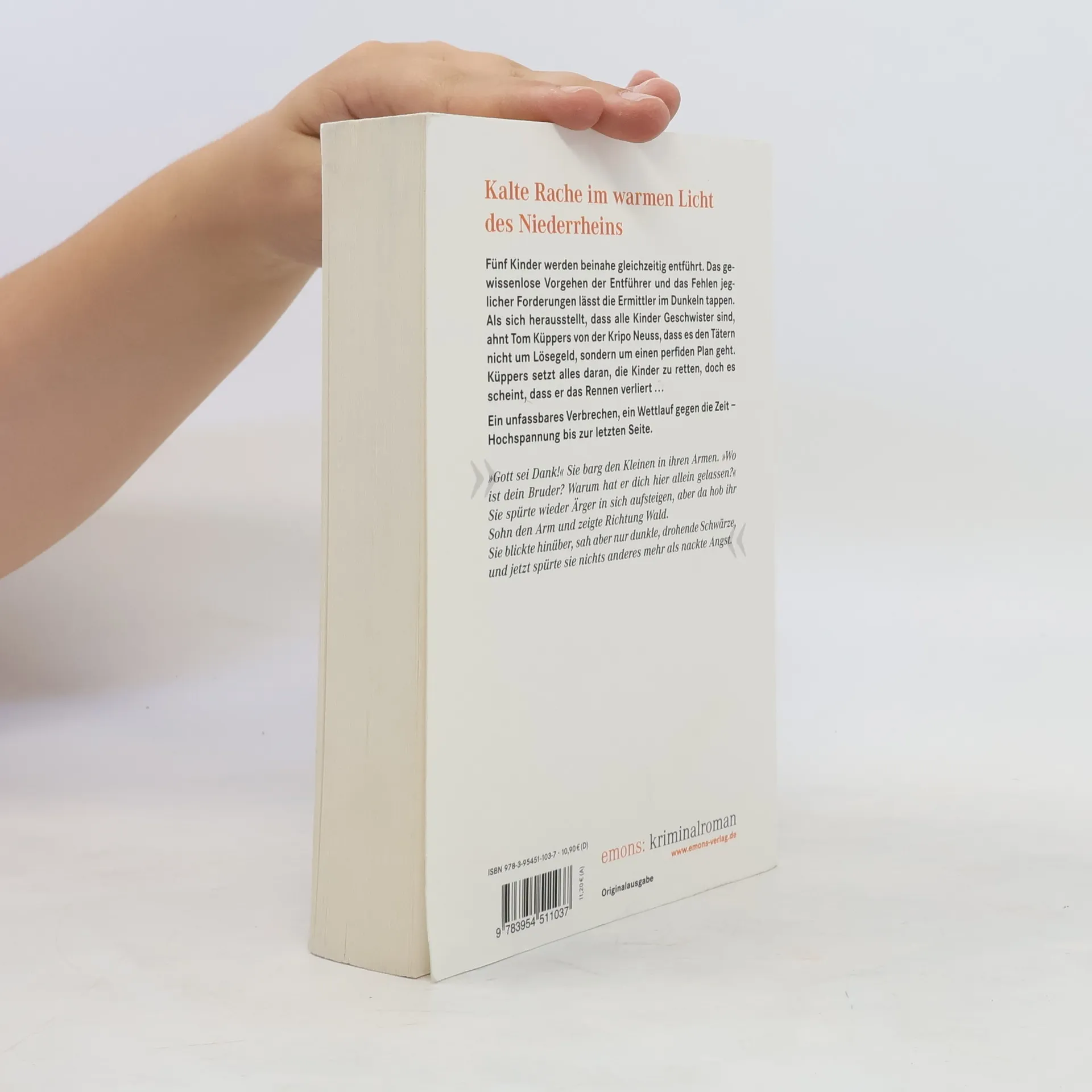 Fünf Kinder werden beinahe gleichzeitig entführt. Das gewissenlose Vorgehen der Entführer und das Fehlen jeglicher Forderungen lässt die Ermittler im Dunkeln tappen. Als sich herausstellt, dass alle Kinder Geschwister sind, ahnt Tom Küppers von der Kripo Neuss, dass es den Tätern nicht um Lösegeld, sondern um einen perfiden Plan geht. Küppers setzt alles daran, die Kinder zu retten, doch es scheint, dass er das Rennen verliert.