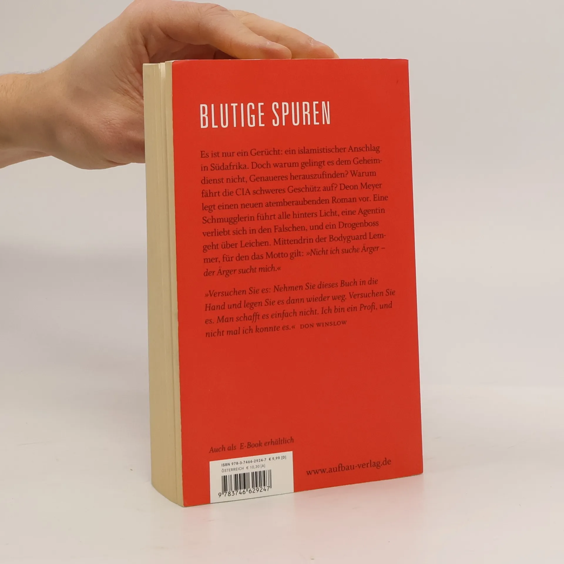 Blutige Spuren Es ist nur ein Gerücht: ein islamistischer Anschlag in Südafrika. Doch warum gelingt es dem Geheimdienst nicht, Genaueres herauszufinden? Warum fährt die CIA schweres Geschütz auf? Deon Meyer legt einen neuen atemberaubenden Roman vor. Eine Schmugglerin führt alle hinters Licht, eine Agentin verliebt sich in den Falschen, und ein Drogenboss geht über Leichen. Mittendrin der Bodyguard Lemmer, für den das Motto gilt: „Nicht ich suche Ärger – der Ärger sucht mich.“ „Versuchen Sie es: Nehmen Sie dieses Buch in die Hand und legen Sie es dann wieder weg. Versuchen Sie es. Man schafft es einfach nicht. Ich bin ein Profi, und nicht mal ich konnte es.“ Don Winslow