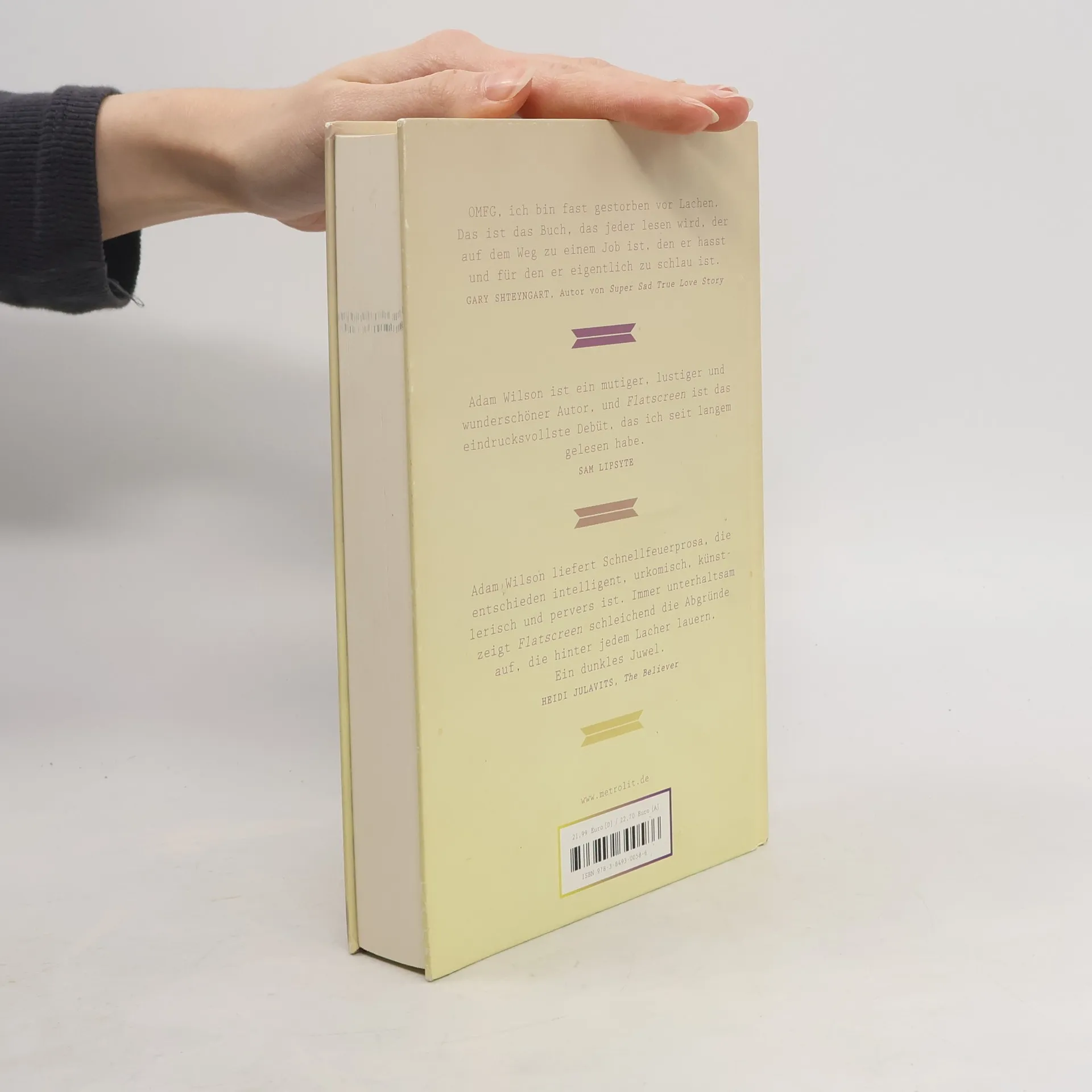 Eli ist ein unvergleichlicher Held, der das Lebensgefühl einer Jugend der Nuller Jahre verdichtet; pointiert, witzig, vulgär und erschütternd. Flatscreen wird als der Slacker-Roman aller Slacker-Romane gehandelt und hinterlässt ein gutes Gefühl: Gut, dass wir damals nicht einfach liegen geblieben sind. Oder: wir sind nicht die Einzigen sind, die damals liegen geblieben sind. „Adam Wilson lesen ist wie das erste Mal Sex Pistols hören.“ The Podfather „Wer auf witziger Unterhaltung im zeitgemäßen Look steht, der sollte sich unbedingt das aktuelle Werk von Adam Wilson zu Gemüte führen. [.]Mit einer gehörigen Portion an vulgärem Humor und Schlagfertigkeit hat er durchaus das Zeug, als Update der renommiertesten Slacker der vergangenen Jahre zu fungieren. [.]Schnappt euch dieses Werk!“ Zuckerkick „Ideenreich, abgedreht, ehrlich, überraschend und dabei sehr unterhaltsam.“ WDR 1Live „Adam Wilsons Debütroman Flatscreen ist kein klassischer coming-of-age-Roman, sondern “die Reifeprüfung„ des 21. Jahrhunderts. Mit entwaffnend ehrlicher Sprache schleudert er dem Leser die Sehnsüchte seines Protagonisten entgegen. Und an den Rändern der gutgelaunten Ausschweifungen blitzt existenzielle Traurigkeit auf.“ WDR 5