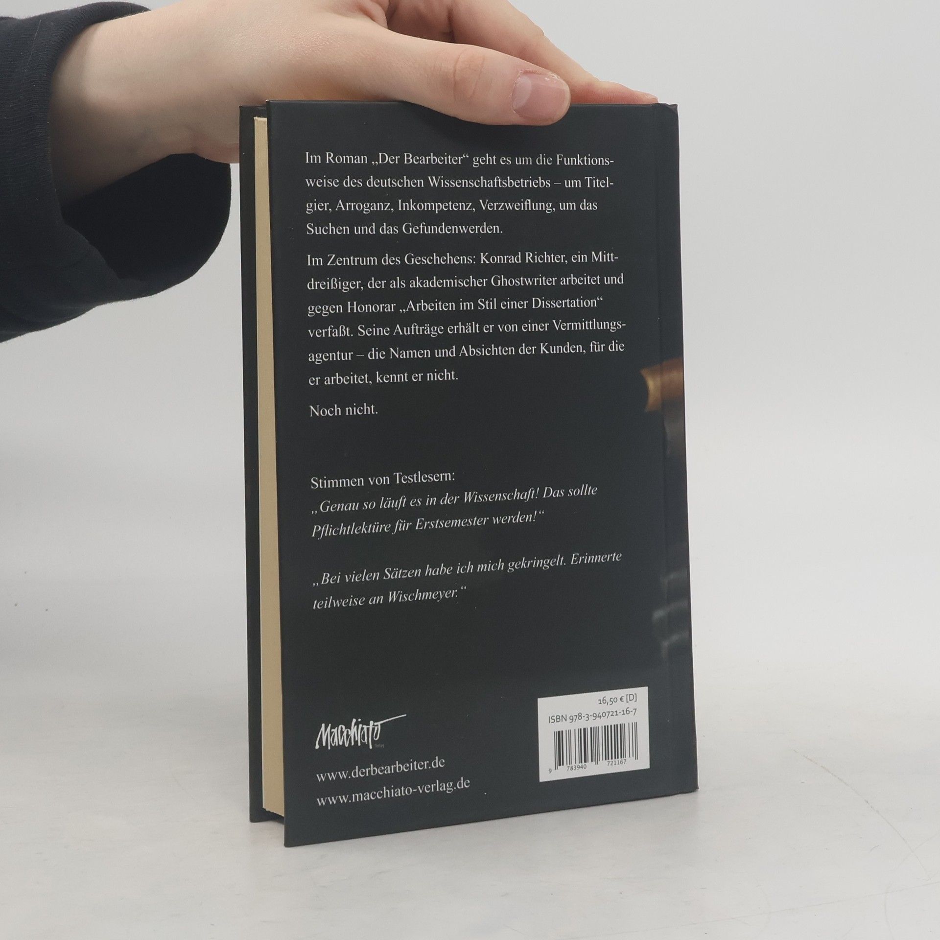 Es ist ein beschauliches, unaufgeregtes Leben, das Konrad Richter, Mitte 30, führt. Er sieht aus wie ein Student, lebt standesgemäß in einer WG, geht mit Appetit in die Mensa und mit Notebook in die Bibliothek, wo er kopiert und Bücher wälzt – Student ist er jedoch nicht. Er ist akademischer Ghostwriter und schreibt gegen Honorar wissenschaftliche Auftragstexte aller Art. Dabei lernt er seine Kunden nicht kennen, denn er bekommt die Anweisungen von der Vermittlungsagentur Dr. Winter. Wer seine Kunden sind, und was mit seinen Texten geschieht, interessiert ihn nicht – bis zu dem Zeitpunkt, an dem ein besonderer Auftrag eintrifft, der Konrads Leben verändern könnte… Es geht es um die haarsträubende Funktionsweise des deutschen Wissenschaftsbetriebs, um Titelgier, Arroganz, Inkompetenz, Verzweiflung, um das Suchen und das Gefundenwerden. Dabei liefert „Der Bearbeiter“ teils ironische, teils ernüchternde Einblicke in die Welt des schönen wissenschaftlichen Scheins, verliert jedoch nie das Leben und die Liebe aus den Augen.