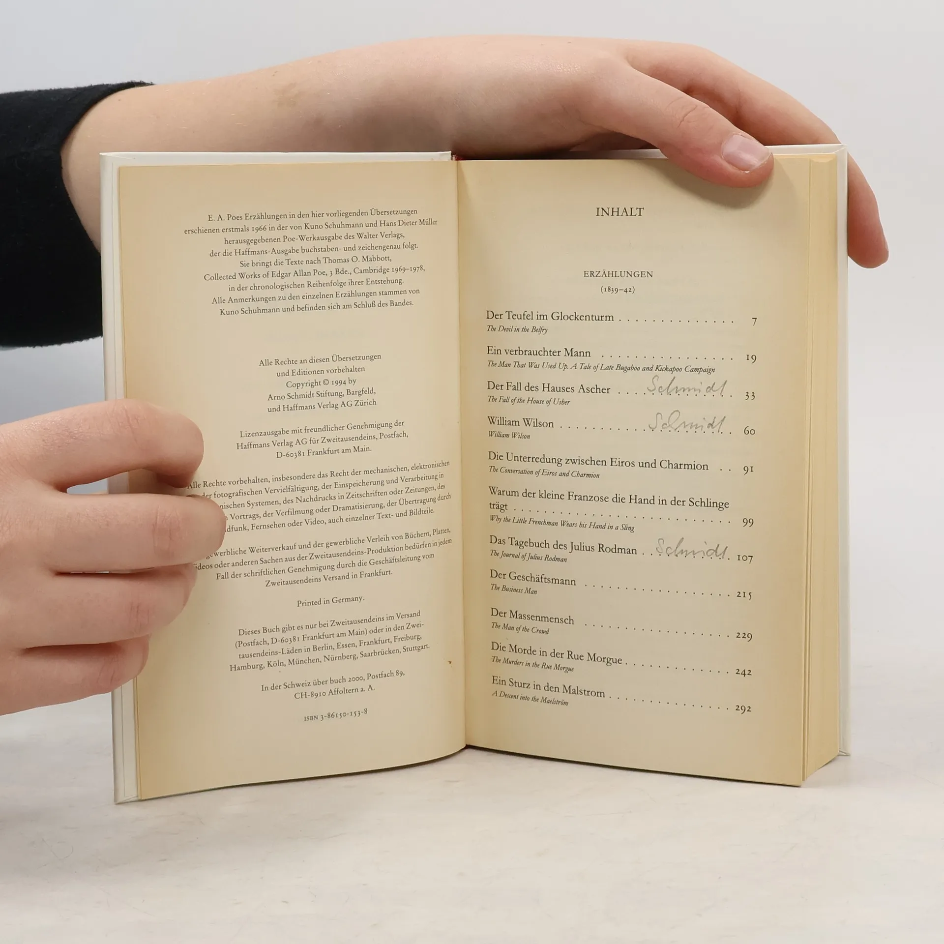 Haffmans, Zürich o.J. (c1994), hier als Lizenzausgabe für Zweitausendeins Versand, Frankfurt/M. Textidentisch mit der ersten Ausgabe der Neuübertragung durch Arno Schmidt, Hans Wollschläger u. a., Walter Verlag, Olten und Freiburg 1966-73; Gedichte zweisprachig (Original | Übertragung) Band 1 „König Pest“ – Erzählungen 1831–38, 359 S. Übersetzer: Arno Schmidt, Hans Wollschläger Band 2 „Der Fall des Hauses Ascher“ – Erzählungen 1839–42, 438 S. Übersetzer: Arno Schmidt, Hans Wollschläger Band 3 „Der schwarze Kater“ – Erzählungen 1843–49, 656 S. Übersetzer: Arno Schmidt, Hans Wollschläger, Kuno Schumann Band 4 „Arthur Gordon Pym“ – Roman, 278 S. Übersetzer: Arno Schmidt Band 5 „Der Rabe“ – Gedichte und Essays, 494 S. Übersetzer: Arno Schmidt, Hans Wollschläger, Friedrich Polakovics, Ursula Wernicke