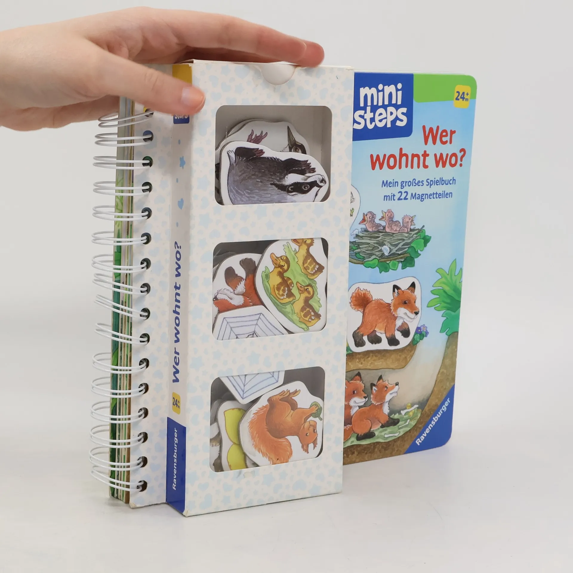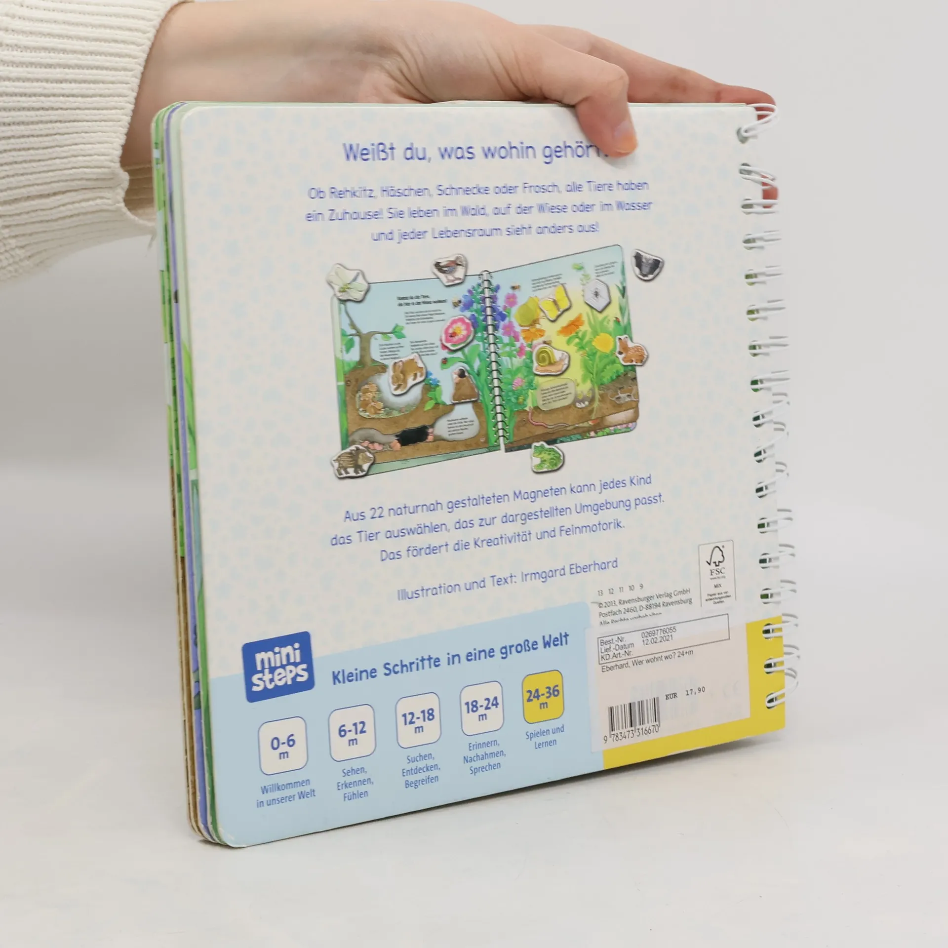 In diesem Spielbuch finden alle Tiere ein Zuhause. Die Igel haben es sich im Laub gemütlich gemacht, der Fuchs lebt mit seinen Kindern in einem Bau und die Vogelkinder warten im Nest auf Futter. Kinder ab 24 Monaten können aus 22 Magneten die passenden Tiere für verschiedene Lebensräume auswählen und auch Tiere mit ihren Kindern zusammenbringen. Kurze Texte geben Hinweise, wo welche Tiere wohnen. Die Buchseiten sind vollständig magnetisch, sodass die Magnetteile sowohl am richtigen Platz als auch frei platziert werden können. Dieses abwechslungsreiche Spiel fördert die Kreativität, schult die Feinmotorik und animiert zum Sprechenlernen. Babys und Kleinkinder wollen mit allen Sinnen die Welt entdecken. ministeps begleitet sie auf ihren ersten Schritten ins Leben. Die vielfältigen ministeps Bücher, Spiele und Spielsachen bieten optimale Sinnesanreize, fördern das Erkennen von Farben, Formen und Bildern, laden zum (Be-) Greifen ein und ermutigen zum Krabbeln und Sprechen. Alle Produkte sind von höchster Ravensburger Qualität, was sowohl die Kleinen als auch die Großen spüren. So haben Eltern die Sicherheit, ihren Kindern ideale Anreize zu bieten.