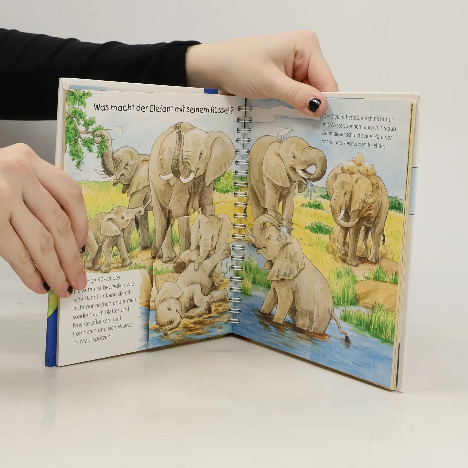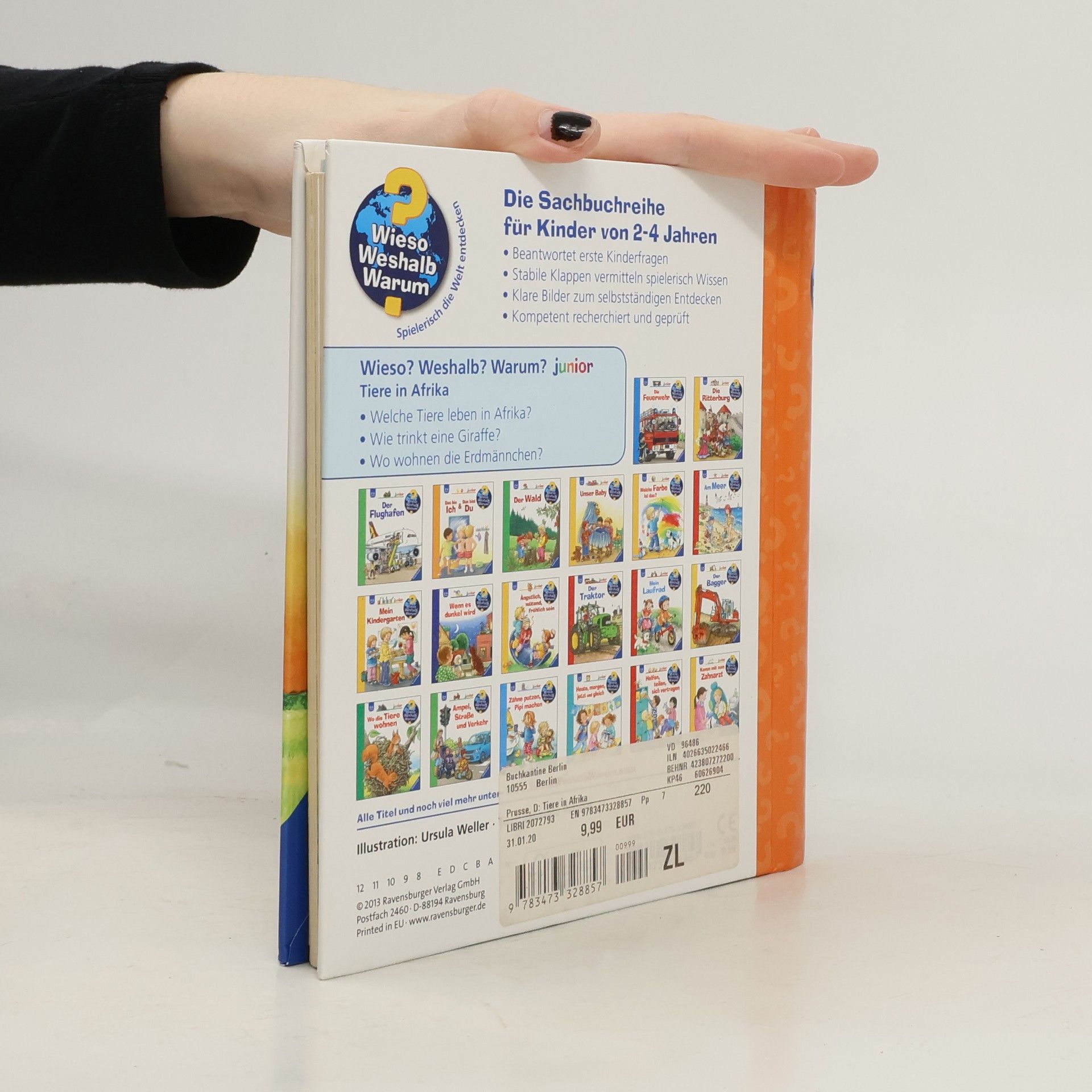 In diesem Buch ist tierisch was los: Wie trinkt eine Giraffe? Was kann der Elefant alles mit seinem Rüssel anstellen? Wie spielen Affen- und Löwenkinder? Und wo wohnen die Erdmännchen? Dank lustiger Klappen tauchen Kinder in die afrikanische Wildnis ein. Dabei beobachten sie ihre Lieblingstiere, die sie sonst nur aus dem Zoo kennen, in ihrem heimischen Lebensraum beim Fressen, Baden und Spielen. Ein lustiges Tier-Suchspiel verrät den Kindern zudem, was die Tiere Afrikas bei Nacht machen. Wieso? Weshalb? Warum? junior Die Sachbuchreihe für Kinder von 2–4 Jahren Jeden Tag entdecken Kinder etwas Neues – und haben viele Fragen. Wann kommt die Feuerwehr? Was machen die Tiere im Winter? Warum muss ich Zähne putzen? Die beliebte Sachbuchreihe Wieso? Weshalb? Warum? junior beantwortet die Fragen der Kinder auf Augenhöhe. Sie beleuchtet unterschiedlichste Themen aus ihrer Alltags- und Interessenswelt altersgerecht und mit viel Liebe zum Detail. Die Reihe ist speziell auf kleine Hände und die Bedürfnisse der Kleinsten angepasst. Klare und liebevolle Bilder, kurze Sachtexte sowie handliche Klappen, die Bewegungen veranschaulichen und überraschende und lustige Einblicke gewähren, ermöglichen Kindern, sich ihre Themen selbst zu erschließen. Der Spaß am eigenhändigen Entdecken, die liebevolle Umsetzung und die hochwertige Ausstattung garantieren langanhaltende Freude an jedem Buch.