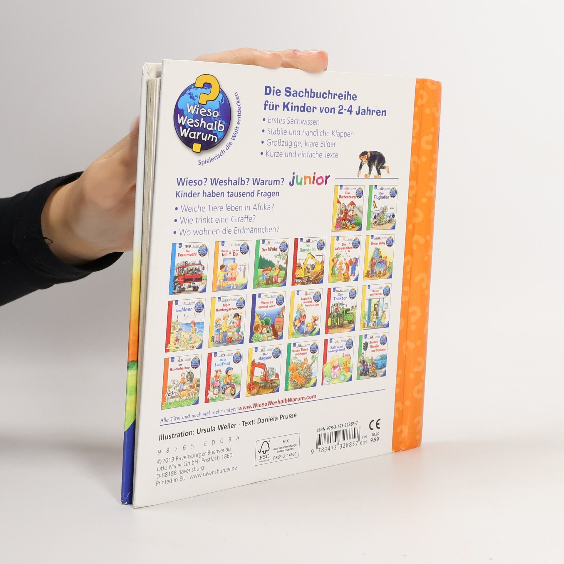 In diesem Buch ist tierisch was los: Wie trinkt eine Giraffe? Was kann der Elefant alles mit seinem Rüssel anstellen? Wie spielen Affen- und Löwenkinder? Und wo wohnen die Erdmännchen? Dank lustiger Klappen tauchen Kinder in die afrikanische Wildnis ein. Dabei beobachten sie ihre Lieblingstiere, die sie sonst nur aus dem Zoo kennen, in ihrem heimischen Lebensraum beim Fressen, Baden und Spielen. Ein lustiges Tier-Suchspiel verrät den Kindern zudem, was die Tiere Afrikas bei Nacht machen. Wieso? Weshalb? Warum? junior Die Sachbuchreihe für Kinder von 2–4 Jahren Jeden Tag entdecken Kinder etwas Neues – und haben viele Fragen. Wann kommt die Feuerwehr? Was machen die Tiere im Winter? Warum muss ich Zähne putzen? Die beliebte Sachbuchreihe Wieso? Weshalb? Warum? junior beantwortet die Fragen der Kinder auf Augenhöhe. Sie beleuchtet unterschiedlichste Themen aus ihrer Alltags- und Interessenswelt altersgerecht und mit viel Liebe zum Detail. Die Reihe ist speziell auf kleine Hände und die Bedürfnisse der Kleinsten angepasst. Klare und liebevolle Bilder, kurze Sachtexte sowie handliche Klappen, die Bewegungen veranschaulichen und überraschende und lustige Einblicke gewähren, ermöglichen Kindern, sich ihre Themen selbst zu erschließen. Der Spaß am eigenhändigen Entdecken, die liebevolle Umsetzung und die hochwertige Ausstattung garantieren langanhaltende Freude an jedem Buch.
