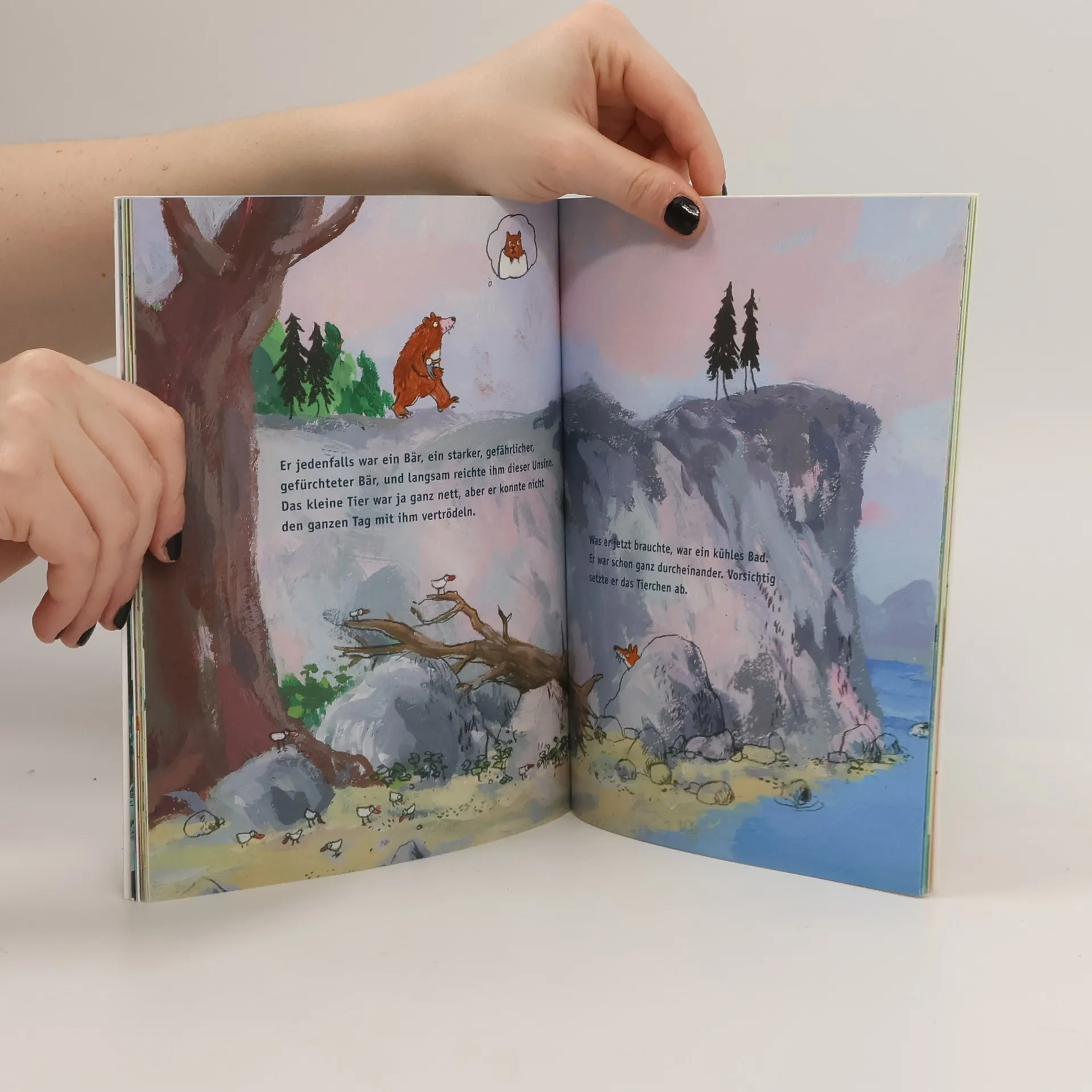»Ja, Mama«, sagte das kleine Tier. »Ich bin nicht deine Mama!«, sagte der Bär empört. »Wir sind völlig verschieden: Ich bin groß und stark, habe ein braunes Fell und fange gerne Lachse … und du bist – anders!« Wie soll der Bär dem Gänseküken bloß klarmachen, dass er nicht ihre Mama ist? Denn das Gänschen klettert, läuft und schwimmt wie ein Bär. Und dann setzt es sogar noch den Fuchs außer Gefecht. Ist es vielleicht doch ein Bär? Wie soll der Bär dem Gänseküken bloß klarmachen, dass er nicht ihre Mama ist? Denn das Gänschen klettert, läuft und schwimmt wie ein Bär. Und dann setzt es sogar noch den Fuchs außer Gefecht. Ist es vielleicht doch ein Bär?