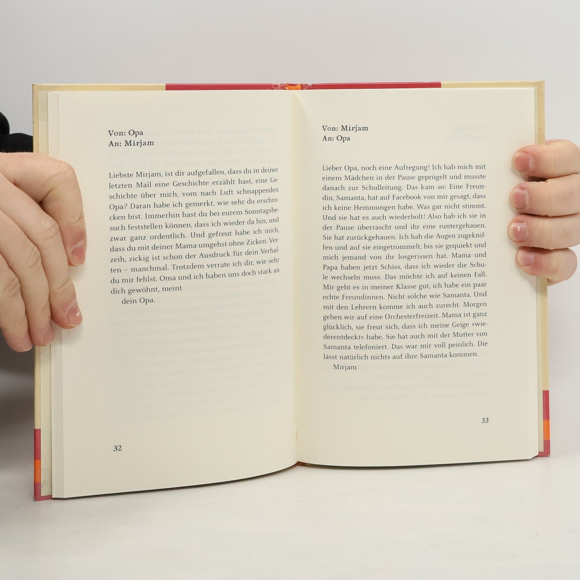 Eine Geschichte in E-Mails - zwischen Mirjam und ihrem etwas weisen Opa. Eine innige Geschichte von großer Nähe und Zugewandtheit: Im unvergleichlichen Härtling-Ton erzählt er leicht und klar von einer Freundschaft zwischen Großvater und Enkelin, die mit dem Tod nicht einfach aufhört. Mirjam ist 14 und berichtet ihrem beinahe 80-jährigen Opa von falschen (Facebook-) Freunden, dem Schulwechsel, der deswegen sein muss, und ermahnt ihn, sich nicht in ihre Angelegenheiten zu mischen. Der Opa antwortet - manchmal nicht sofort -, wie schwierig das mit dem Erinnern ist und erzählt, wie es für ihn damals, nach dem Krieg, war, die richtigen Freunde zu finden. Er gibt ihr Ratschläge, wie man mit Ängsten und mit Eltern umgeht, und versichert ihr, das Gästebett sei immer für sie gemacht. Mirjam erfährt von ihm, wie es ist, wenn man nicht mehr sicher auf den Beinen ist, und das Gefühl hat, alles sei vielleicht ein letztes Mal. Eines Tages antwortet Opa Mirjam nicht mehr ...