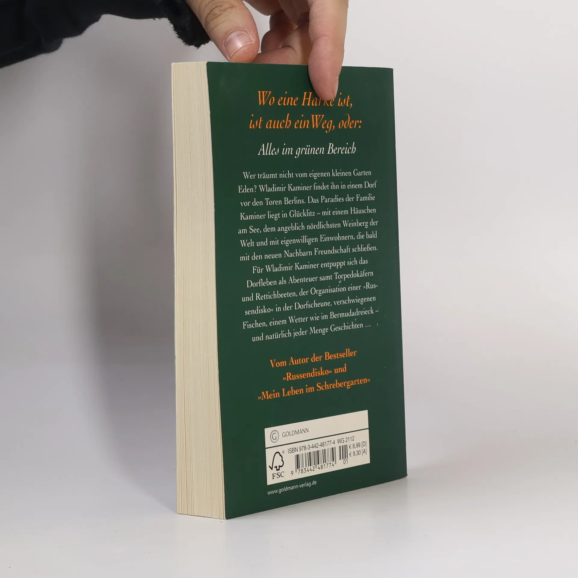 Wladimir Kaminer sucht das Grüne: Schrebergarten war gestern – nun lockt das Leben auf dem Land. Wer träumt nicht vom eigenen kleinen Garten Eden? Wladimir Kaminer findet ihn in einem Dorf vor den Toren Berlins. Den Schrebergarten hatte seine Familie aufgeben müssen, da man deren Freude an „spontaner Vegetation“ nicht recht teilen wollte. Nun liegt ihr Paradies in Glücklitz – mit einem Häuschen am See, dem angeblich nördlichsten Weinberg der Welt und mit eigenwilligen Einwohnern, die bald mit den neuen Nachbarn Freundschaft schließen. Für Wladimir Kaminer entpuppt sich das Dorfleben als Abenteuer samt Torpedokäfern und Rettichbeeten, der Organisation einer „Russendisko“ in der Dorfscheune, verschwiegenen Fischen, einem Wetter wie im Bermudadreieck – und natürlich jeder Menge Geschichten ...