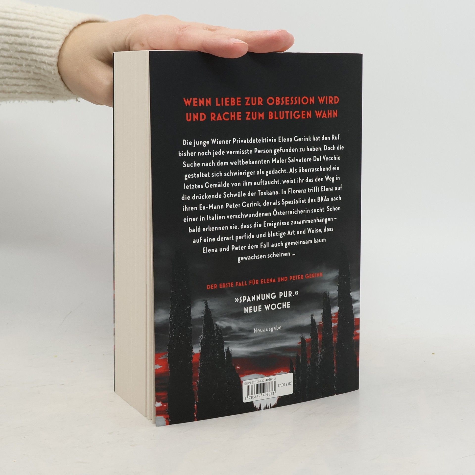 Wenn Liebe zur Obsession wird und Rache zum blutigen Wahn ... Die junge Wiener Privatdetektivin Elena Gerink hat den Ruf, bisher noch jede vermisste Person gefunden zu haben. Doch die Suche nach dem verschwundenen weltbekannten Maler Salvatore Del Vecchio gestaltet sich schwieriger als gedacht. Als überraschend ein letztes Gemälde von ihm auftaucht, weist ihr das den Weg in die drückende Schwüle der Toskana. In Florenz trifft Elena auf ihren Ex-Mann Peter Gerink, der als Spezialist des Bundeskriminalamts nach einer in Italien verschwundenen Österreicherin sucht. Schon bald erkennen sie, dass die Ereignisse zusammenhängen – auf eine derart perfide und blutige Art und Weise, dass Elena und Peter dem Fall auch gemeinsam kaum gewachsen scheinen ...