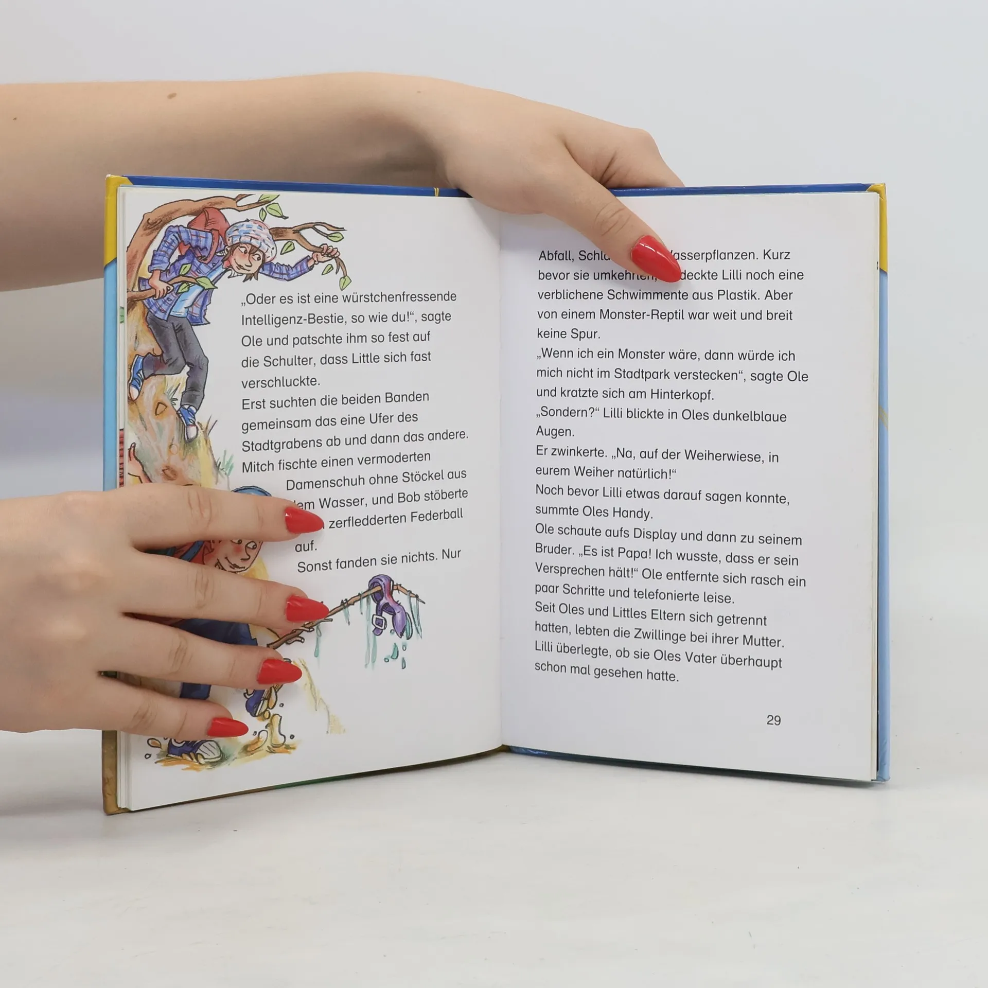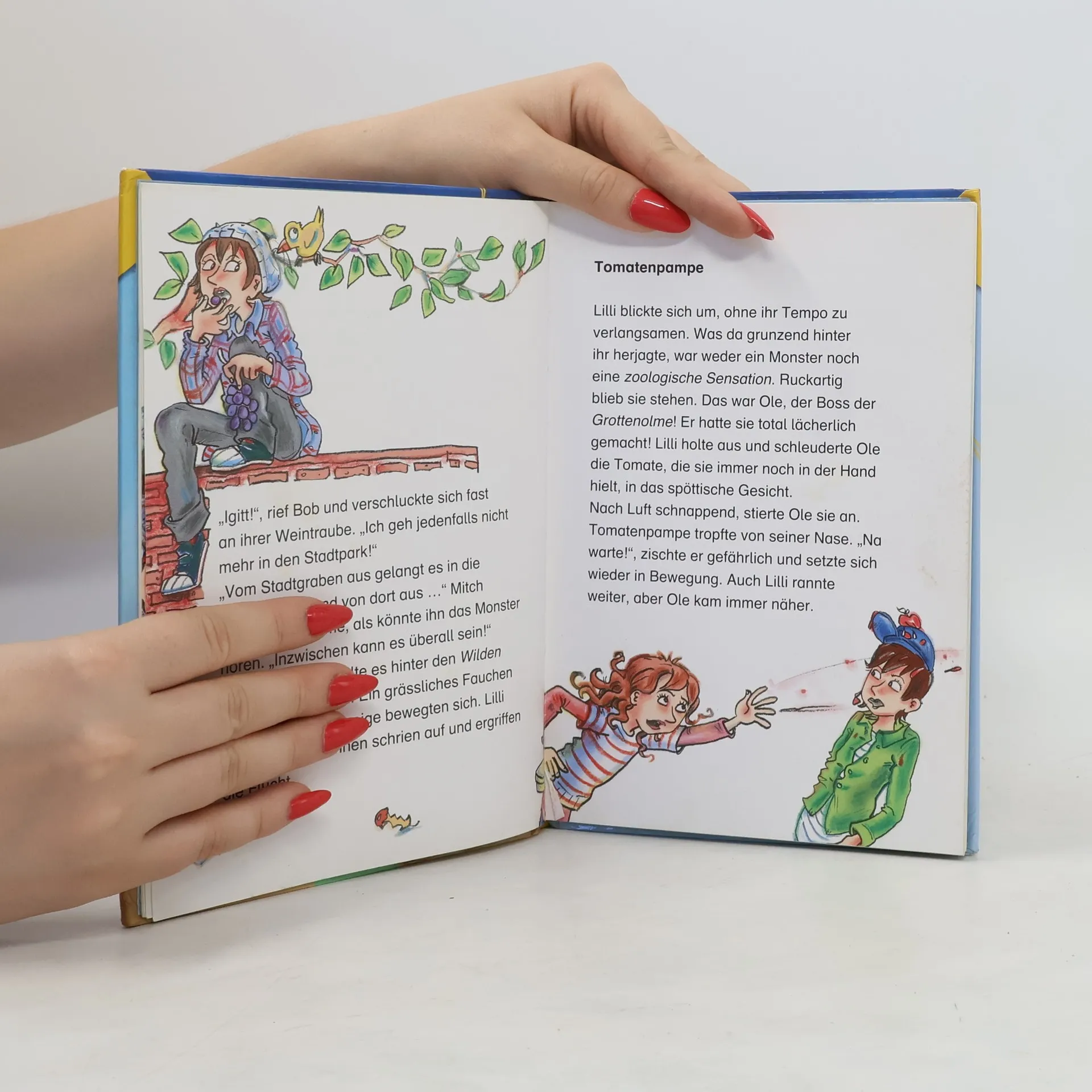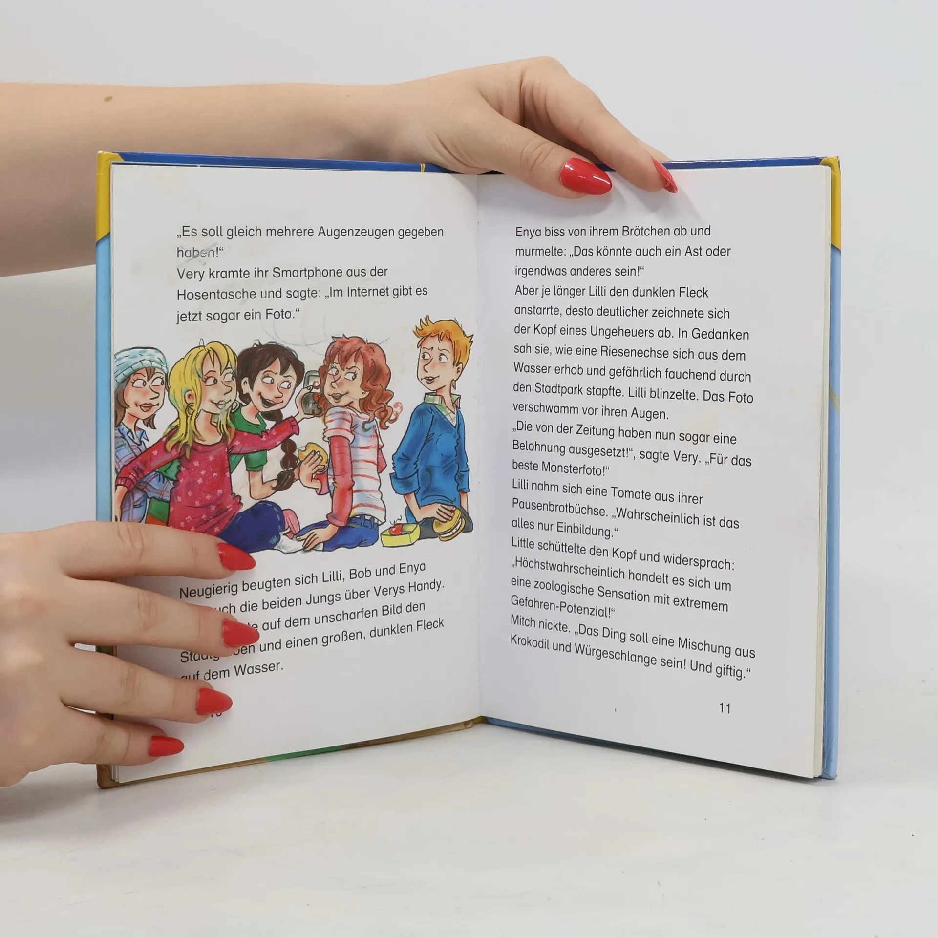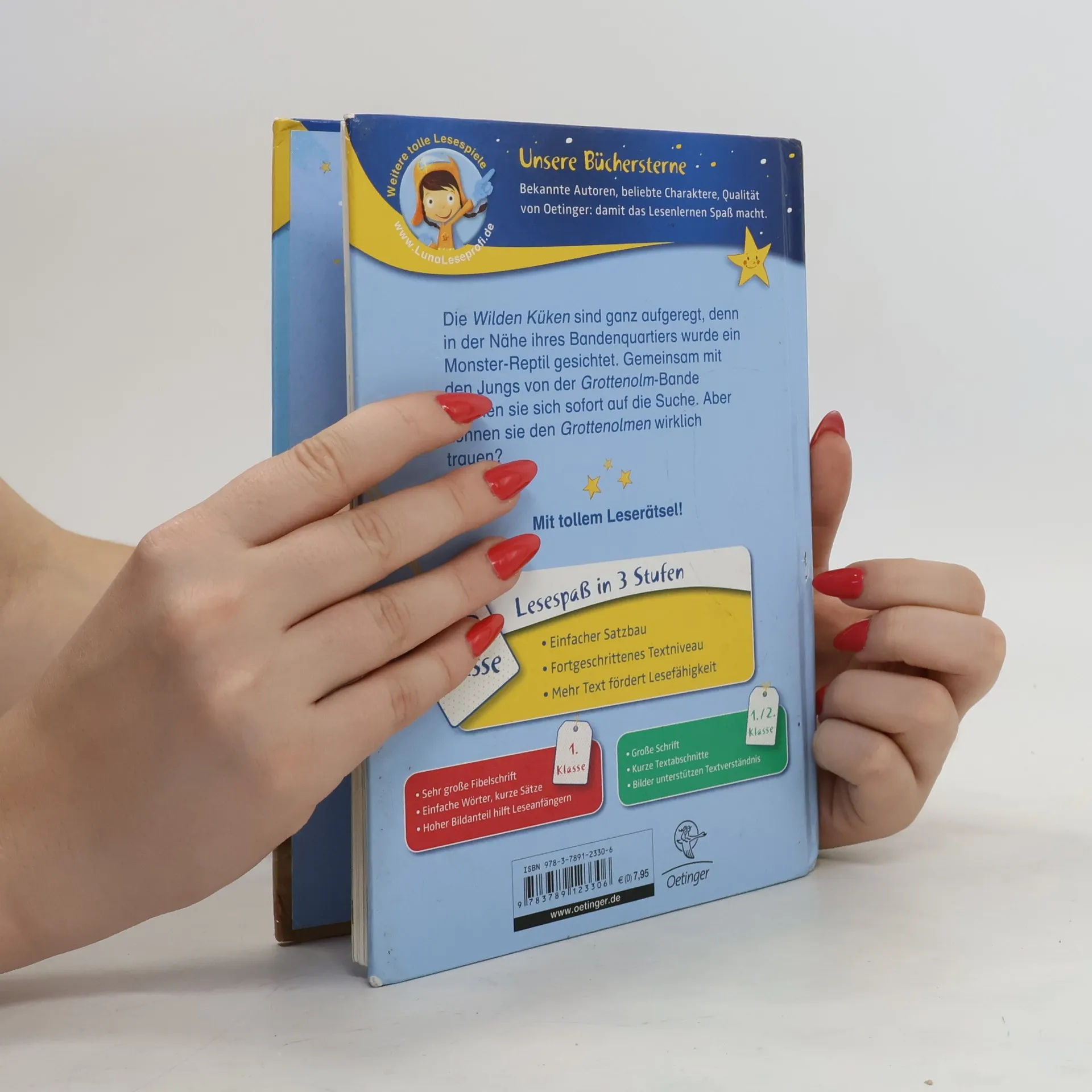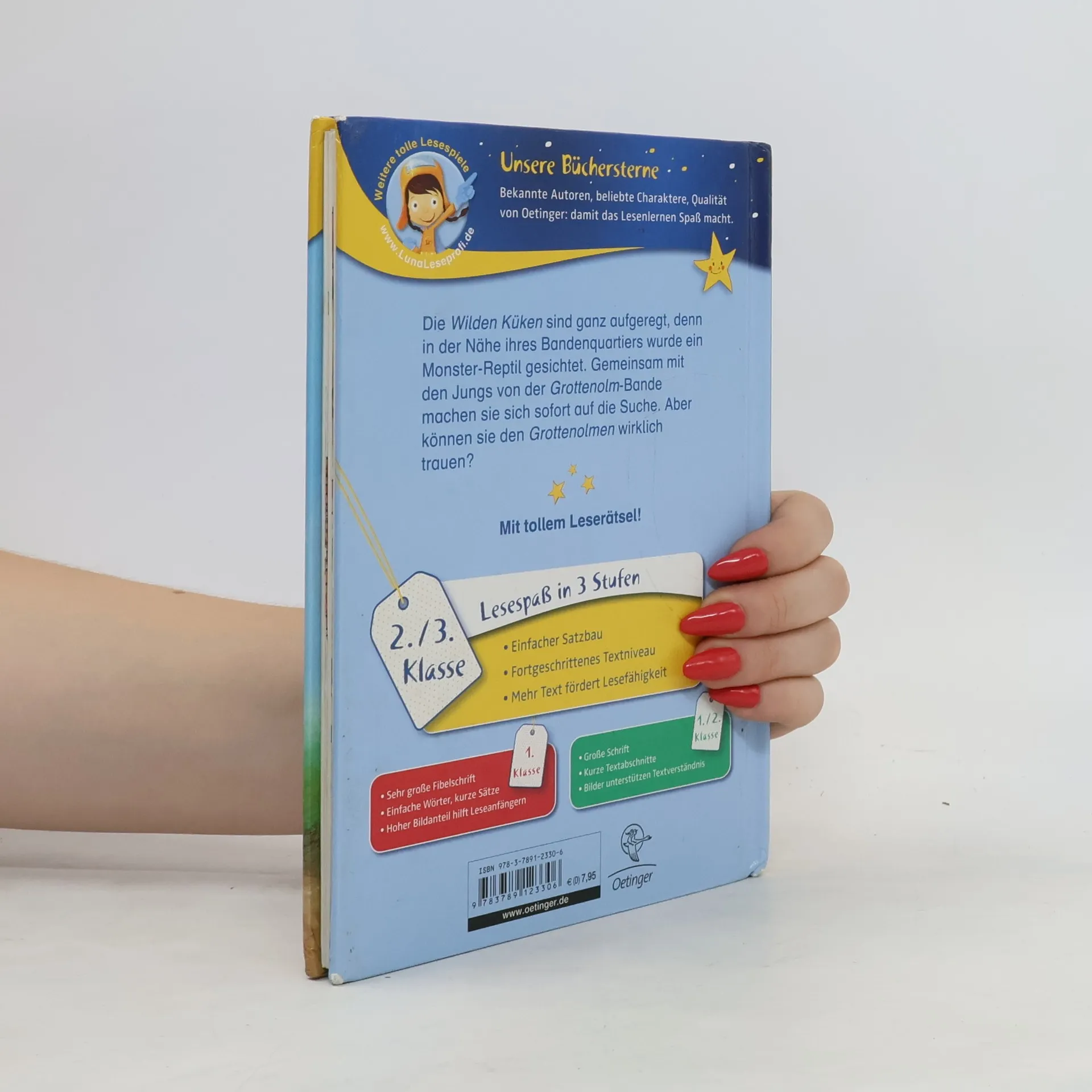 Im 3. Band der Reihe (vgl. zuletzt "Achtung Party!") sorgt das Gerücht von einem Monster-Reptil im Stadtpark für Aufregung und gibt Anlass für allerlei Neckereien zwischen den Banden der Küken und Olme, für Streiche, Rache und Versöhnung. Die gemeinsame Monsterjagd beider Banden bleibt erfolglos, es gibt sogar neuen Streit zwischen Ole und Lilli. Als dann aber Ole spurlos verschwunden ist, ist den Küken klar, dass alle gemeinsam suchen nach ihrem Motto: keine alleine, alle oder keine - das kann ja auch mal für 2 Banden gelten. Beim Versöhnungsspaziergang findet Bandenhund Sneaker das Monster, eine verängstigte Echse, im Gebüsch. Die Zeitungsmeldung am nächsten Tag, dass 2 Freunde das Monster-Reptil gefunden haben, gefällt Lilli sehr. Die spannende Geschichte für die 3. Lesestufe ist zwar in 11 Kapitel unterteilt, aber mit 54 Seiten trotz vieler Farbillustrationen und einfacher Sätze recht anspruchsvoll. Reihenüblich sind die didaktische Begleitung, das Leserätsel, dessen Lösung zu einer Internet-Seite führt, und die Ausstattung. Auch einzeln verständlich. Empfohlen