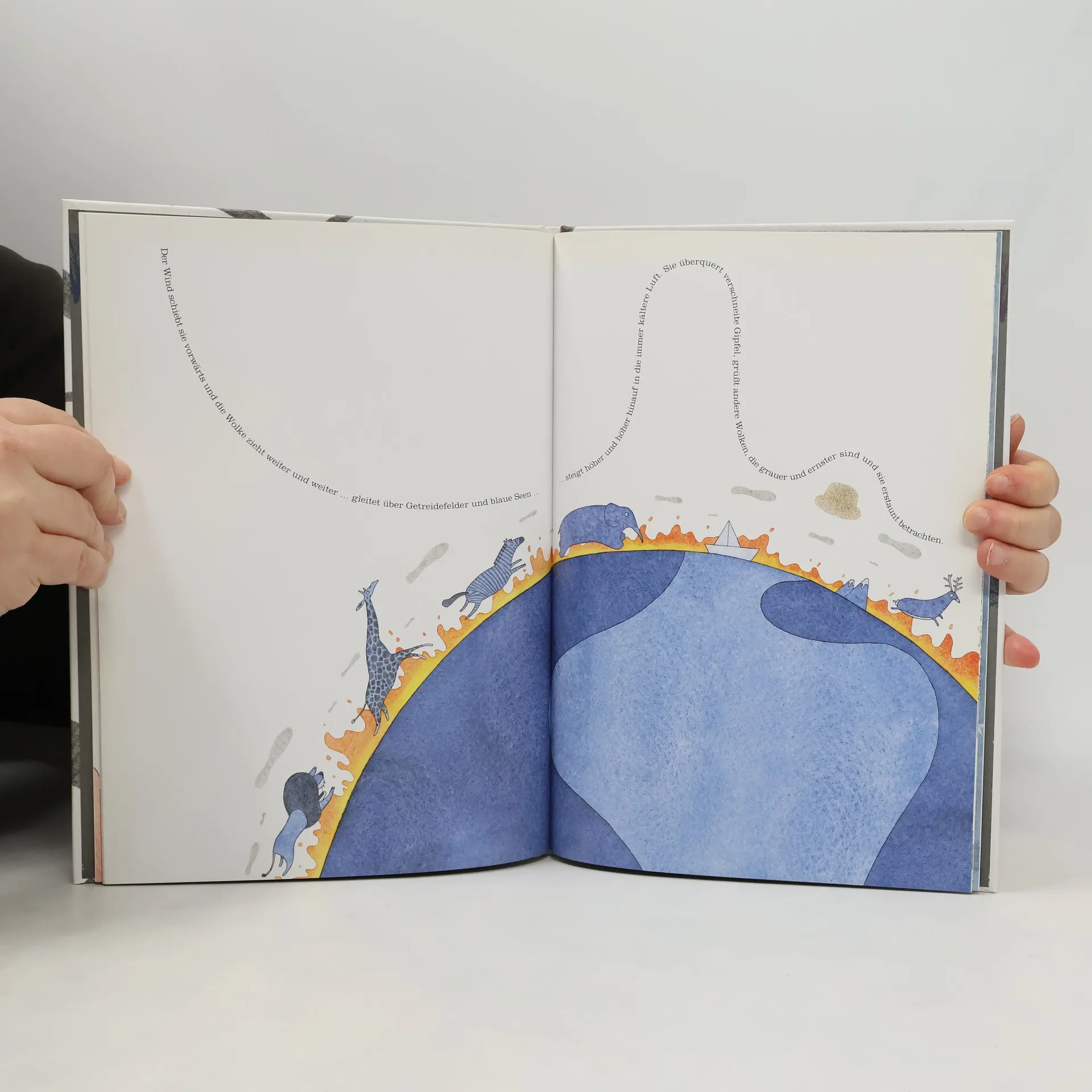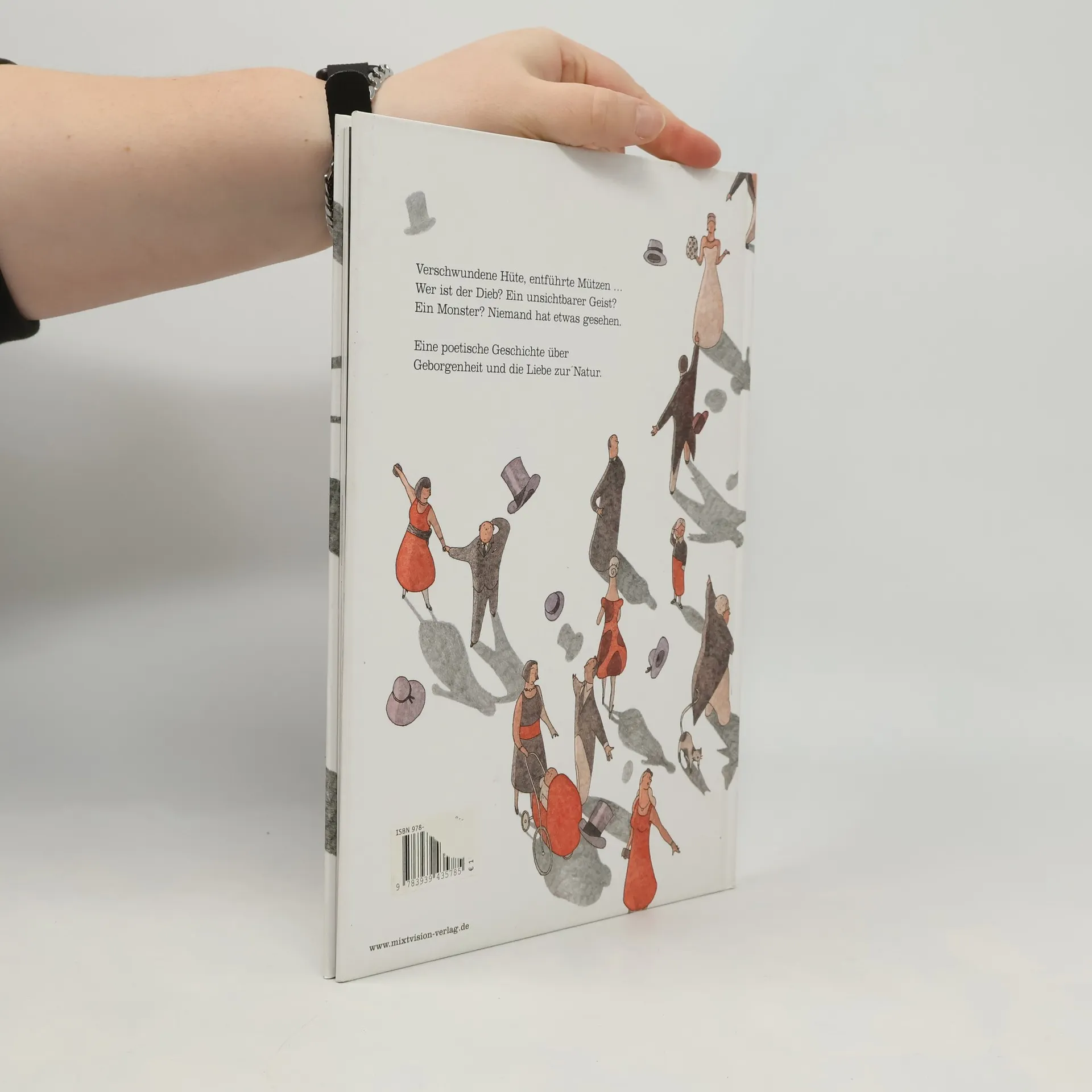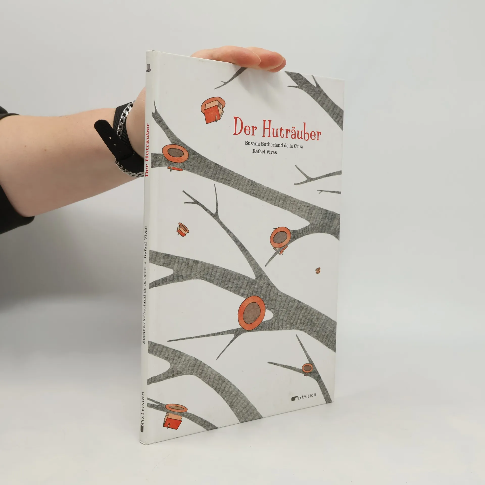 Als die Vögel nach dem Winter in ihre Heimat zurückkehren, ist alles verwüstet: Ein Brand hat den Wald und ihre Nistplätze zerstört. Doch da taucht plötzlich eine riesige bunte Wolke am Horizont auf! Der Wind hat den Dorfbewohnern ihre Hüte, Mützen und Zylinder von den Köpfen gerissen und lässt sie als Nester auf die verkohlten Äste regnen ... Die Spanierin Susana Sutherland de la Cruz erzählt in ihrem Bilderbuch Der Huträuber in stillen Worten eine berührende Fabel über Heimat und Geborgenheit. Ebenso dezent wie der Text sind auch Rafael Vivas Illustrationen: Mal erzählen sie die Geschichte weiter, mal nehmen sie sich zurück und lassen mit viel Weißflächen Raum für die Fantasie der Leser und Betrachter. Abgerundet wird das Layout durch typographische Spielereien, die dem Text besonderen Schwung verleihen.