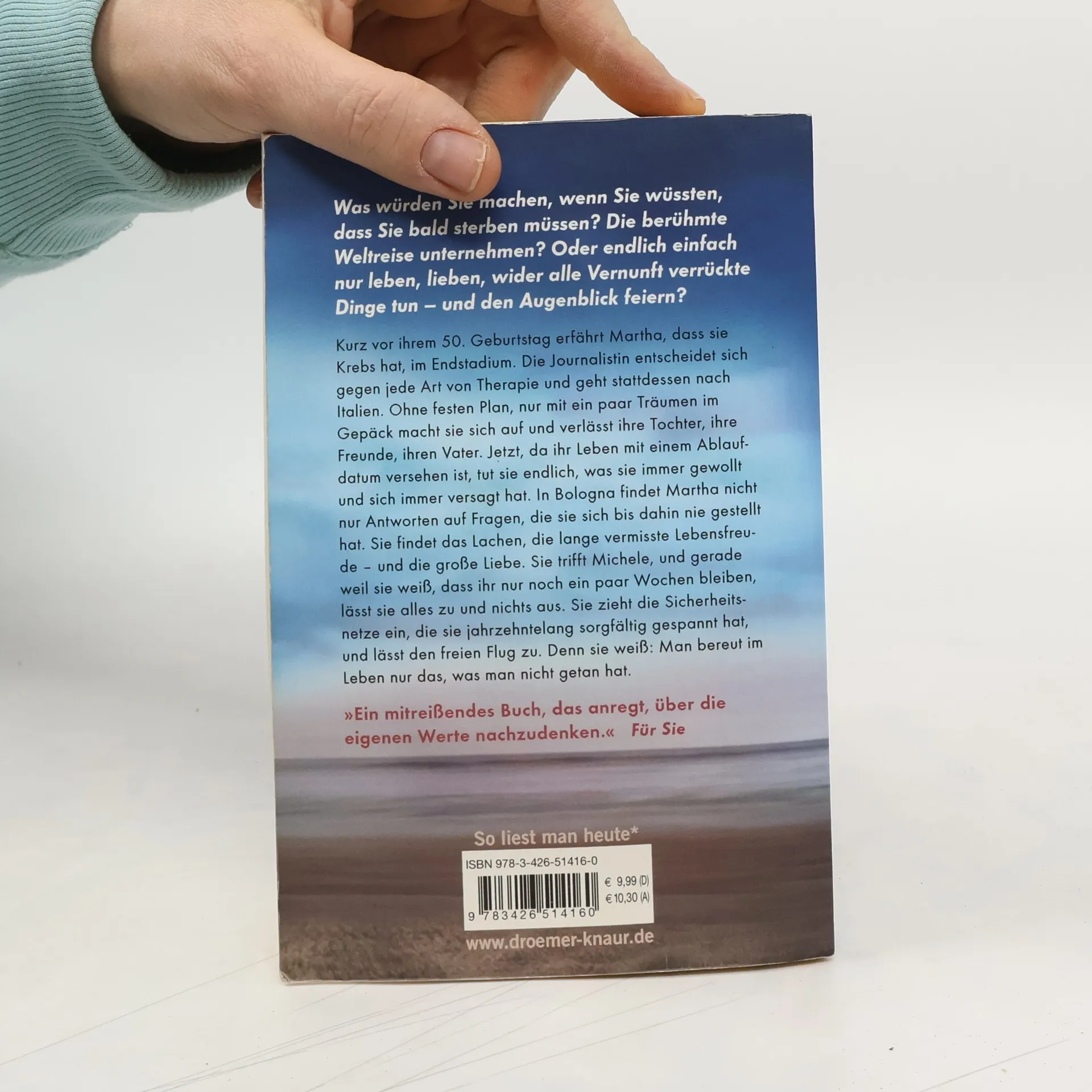 Als die Journalistin Martha an ihrem 50. Geburtstag von ihrer eigenen Feier verschwindet, stehen ihre Freunde und ihre Tochter Lina vor einem Rätsel: Warum hat sie ohne ein Wort das Haus verlassen? Ohne festen Plan, nur mit ein paar Träumen im Gepäck hat sie sich aufgemacht – und findet in Italien die Antworten auf Fragen, die sie sich bis dahin nie gestellt hat. Sie findet das Lachen, die lange vermisste Lebensfreude – und lernt Michele kennen. Mit ihm erlebt sie die ganz große Liebe – zum letzten Mal in ihrem Leben, denn was weder ihre Freunde noch ihre Familie wissen: Sie hat nicht mehr lange zu leben und will endlich jeden Tag so auskosten, als sei es der letzte.