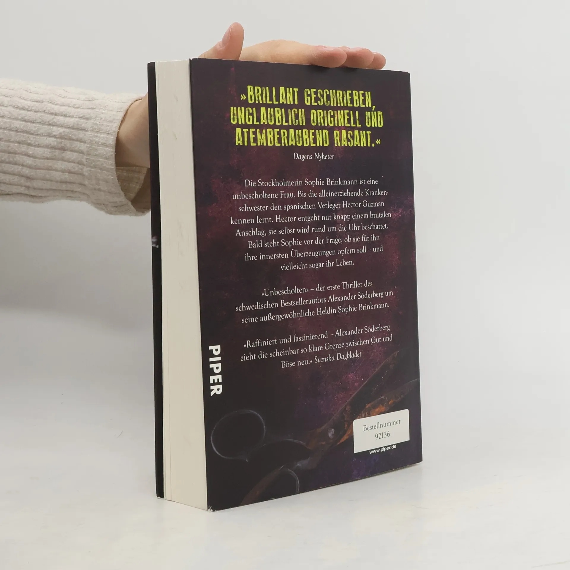 Gut und Böse. Für Sophie Brinkmann, Stockholmer Krankenschwester und alleinerziehende Mutter, gibt es eine klare Grenze. Bis sie Hector Guzman kennenlernt – und Kommissarin Gunilla Strandberg sie bittet, ihn zu bespitzeln. Plötzlich tauchen unangenehme Fragen auf: Wer ist Hector Guzman wirklich, der sich ihr als charmanter Verleger vorgestellt hat? Und wie weit würde Sophie gehen, um ihrem neuen Freund zu helfen? Doch erst als Hector entführt und Sophies Sohn Albert lebensgefährlich verletzt wird, begreift sie, dass das alles keine Gewissensfrage mehr ist – sondern eine auf Leben und Tod ... Nichts und niemand ist sicher in »Unbescholten« – denn es gibt keinen Unterschied zwischen richtig und falsch. Der Schwede Alexander Söderberg schickt seine Heldin auf eine atemlose Flucht vor dem Bösen.
