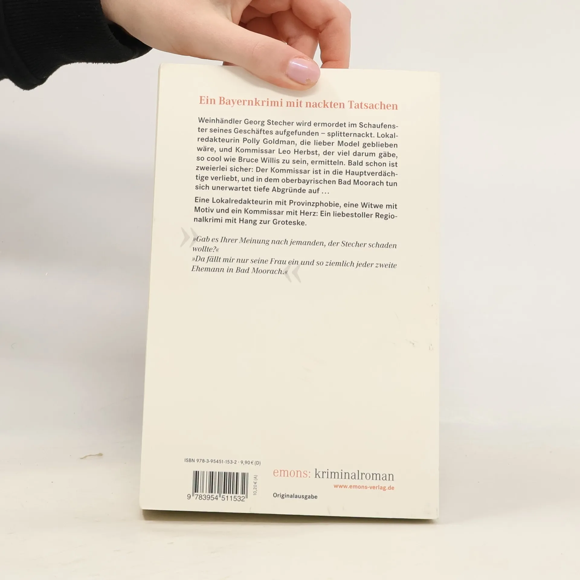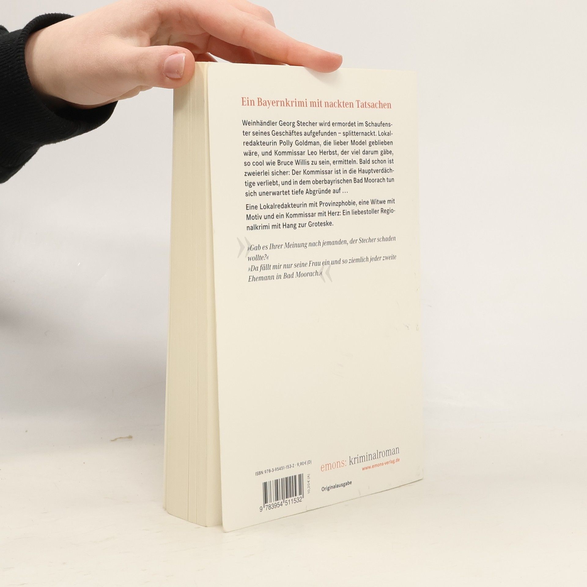 Weinhändler Georg Stecher wird ermordet im Schaufenster seines Geschäftes aufgefunden - splitternackt. Lokalredakteurin Polly Goldmann, die lieber Model geblieben wäre, und Kommissar Leo Herbst, der viel darum gäbe, so cool wie Bruce Willis zu sein, ermitteln. Bald schon ist zweierlei sicher: Der Kommissar ist in die Hauptverdächtige verliebt, und in dem oberbayrischen Bad Moorach tun sich unerwartet tiefe Abgründe auf.