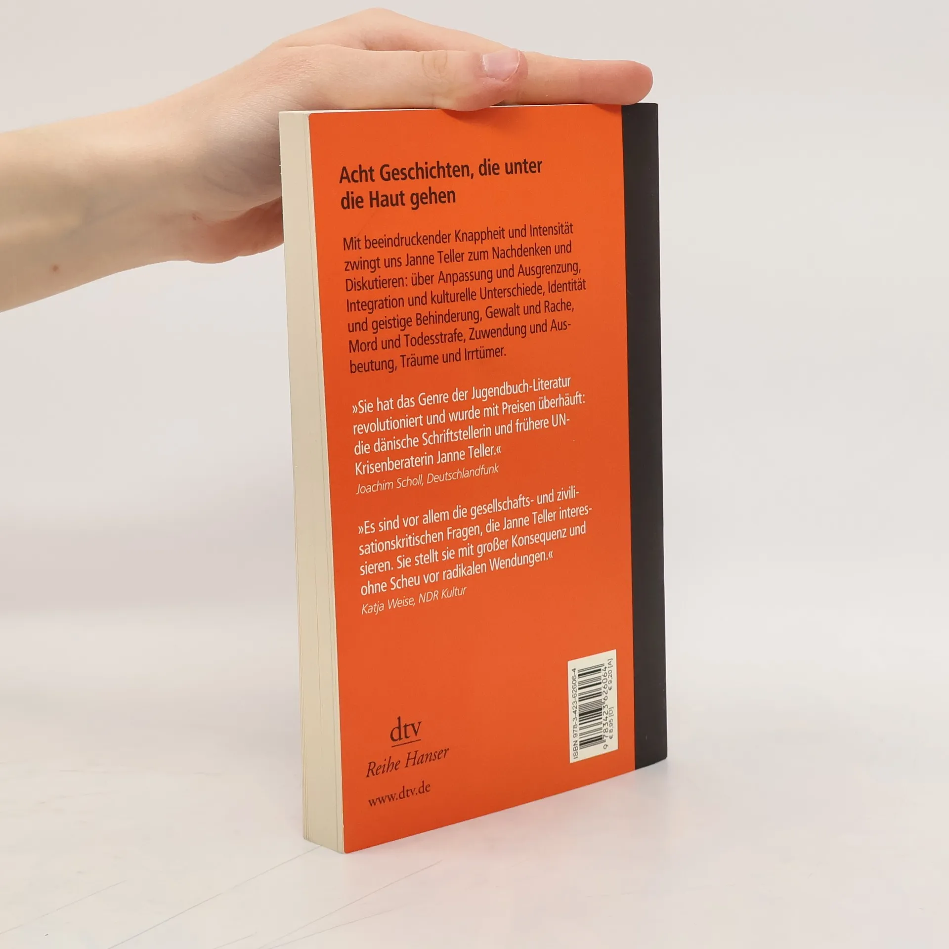 Acht Geschichten, die unter die Haut gehen. Was bringt einen jungen Mann dazu, grundlos brutale Gewalt anzuwenden? Kann man Intoleranz und Extremismus verstehen? Wann darf Rache ein Motiv sein? In acht Geschichten, die unter die Haut gehen, erzählt Janne Teller von Anpassung und Ausgrenzung, von Identität und kulturellen Unterschieden, von geistiger Behinderung, von Träumen und Irrtümern. Selten eignet sich Literatur besser zum Nachdenken und Diskutiere