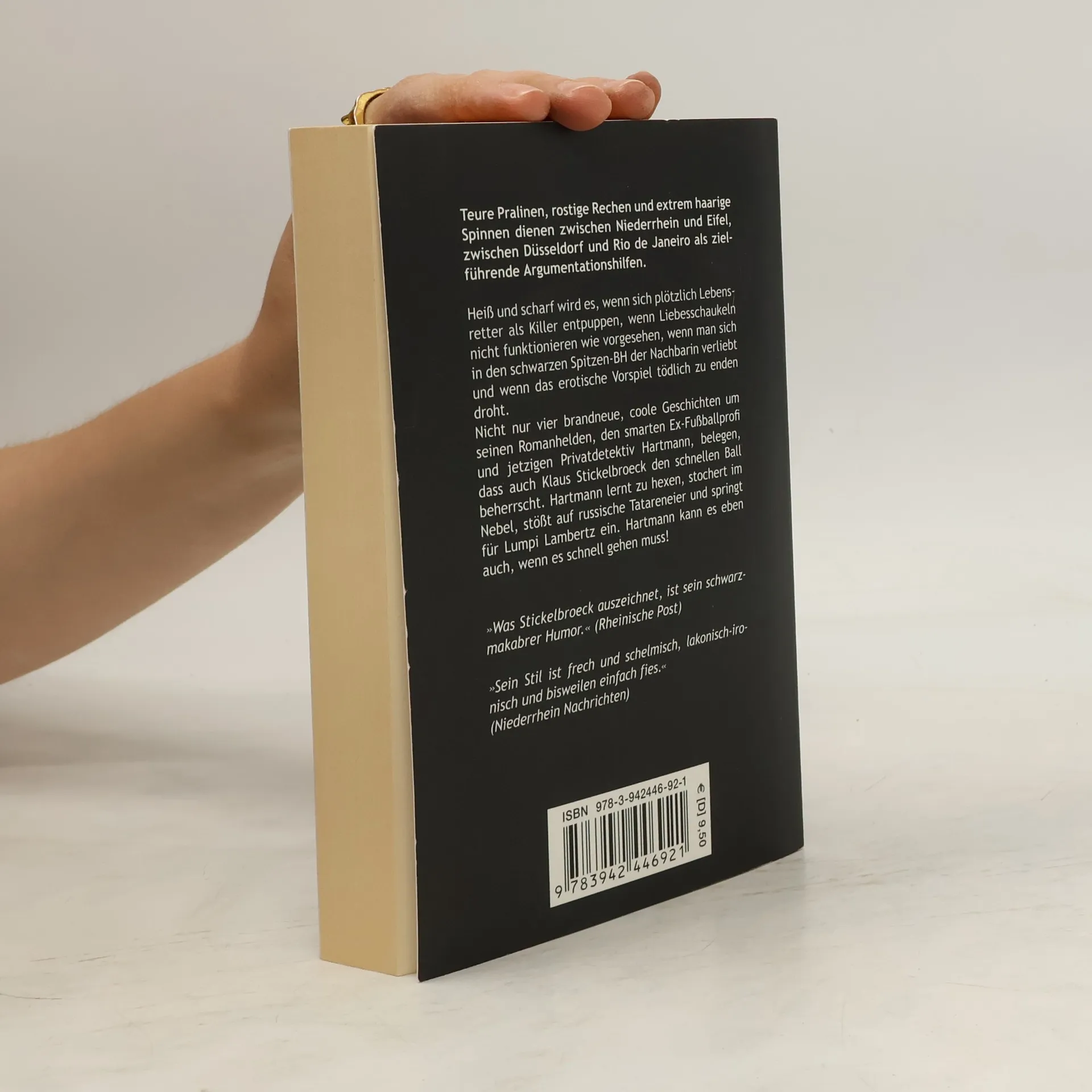 Teure Pralinen, rostige Rechen und extrem haarige Spinnen dienen zwischen Niederrhein und Eifel, zwischen Düsseldorf und Rio de Janeiro als zielführende Argumentationshilfen. Heiß und scharf wird es, wenn sich plötzlich Lebensretter als Killer entpuppen, wenn Liebesschaukeln nicht funktionieren wie vorgesehen, wenn man sich in den schwarzen Spitzen-BH der Nachbarin verliebt und wenn das erotische Vorspiel tödlich zu enden droht. Nicht nur vier brandneue, coole Geschichten um seinen Romanhelden, den smarten Ex-Fußballprofi und jetzigen Privatdetektiv Hartmann, belegen, dass auch Klaus Stickelbroeck den schnellen Ball beherrscht. Hartmann lernt Hexen, stochert im Nebel, stößt auf russische Tatareneier und springt für Lumpi Lambertz ein. Hartmann kann es eben auch, wenn es schnell gehen muss!