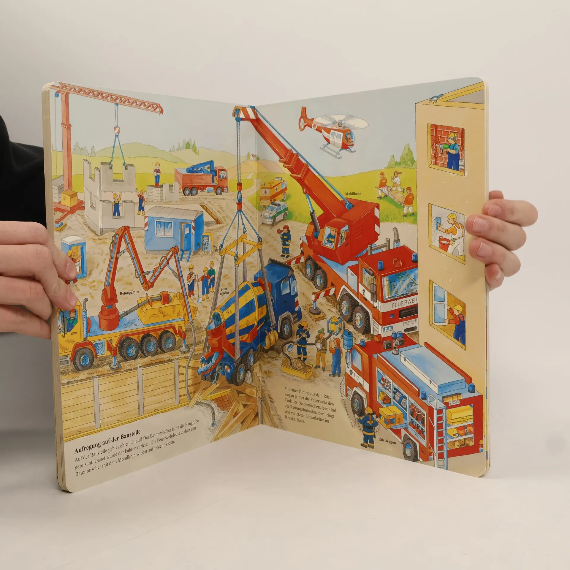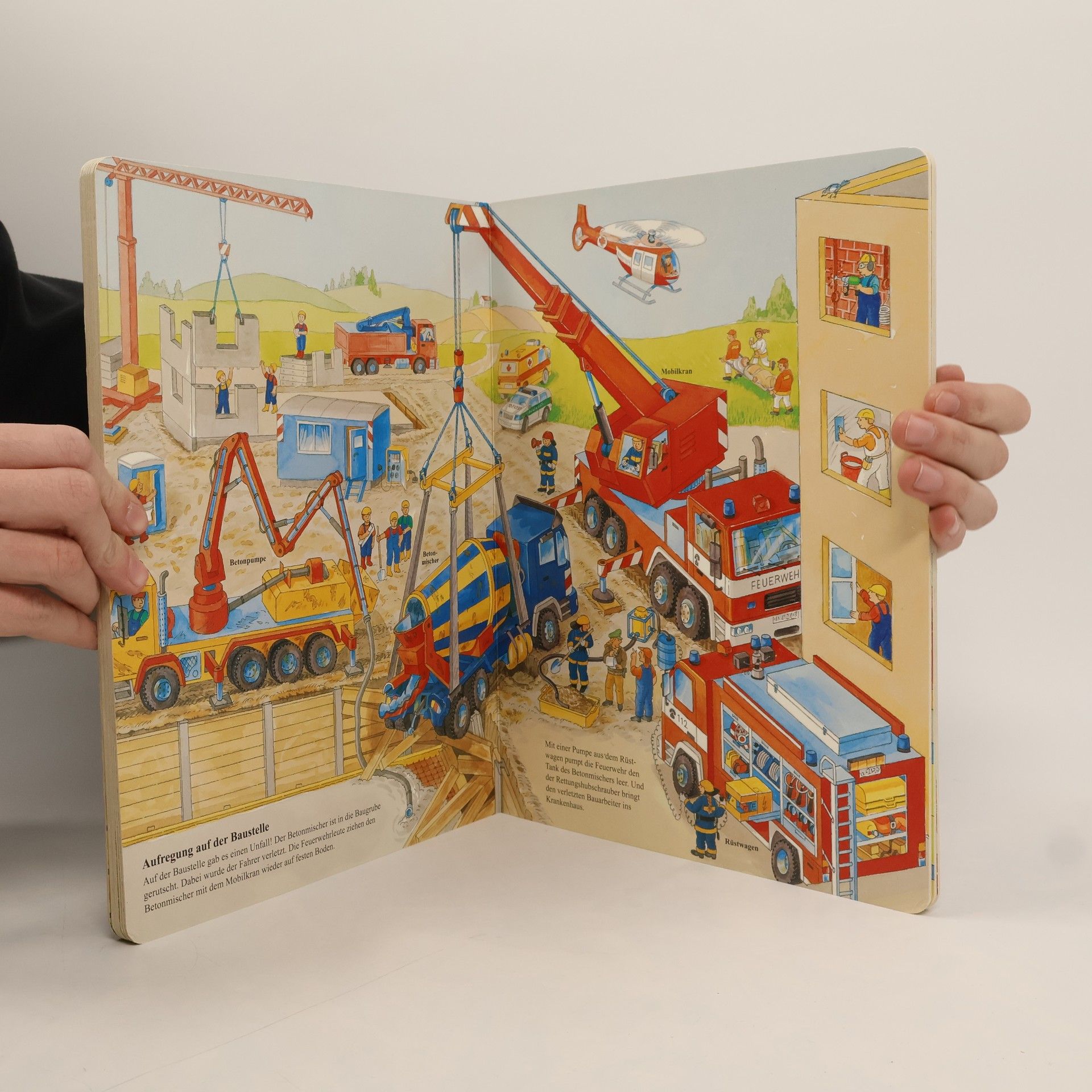 So viele spannende Fahrzeuge zum Suchen, Entdecken und Benennen! Ein Transportlaster und ein Betonmischer fahren zur Baustelle und die Feuerwehrfahrzeuge zu einem Einsatz: Mit dem Drehleiterwagen und dem Löschgruppenfahrzeug löscht die Feuerwehr einen Brand. Aber in der Stadt gibt es natürlich auch noch Tankwagen, Müllautos, einen Traktor mit Anhänger, Züge und Schiffe zu sehen: Hier findet jeder sein Lieblingsfahrzeug!