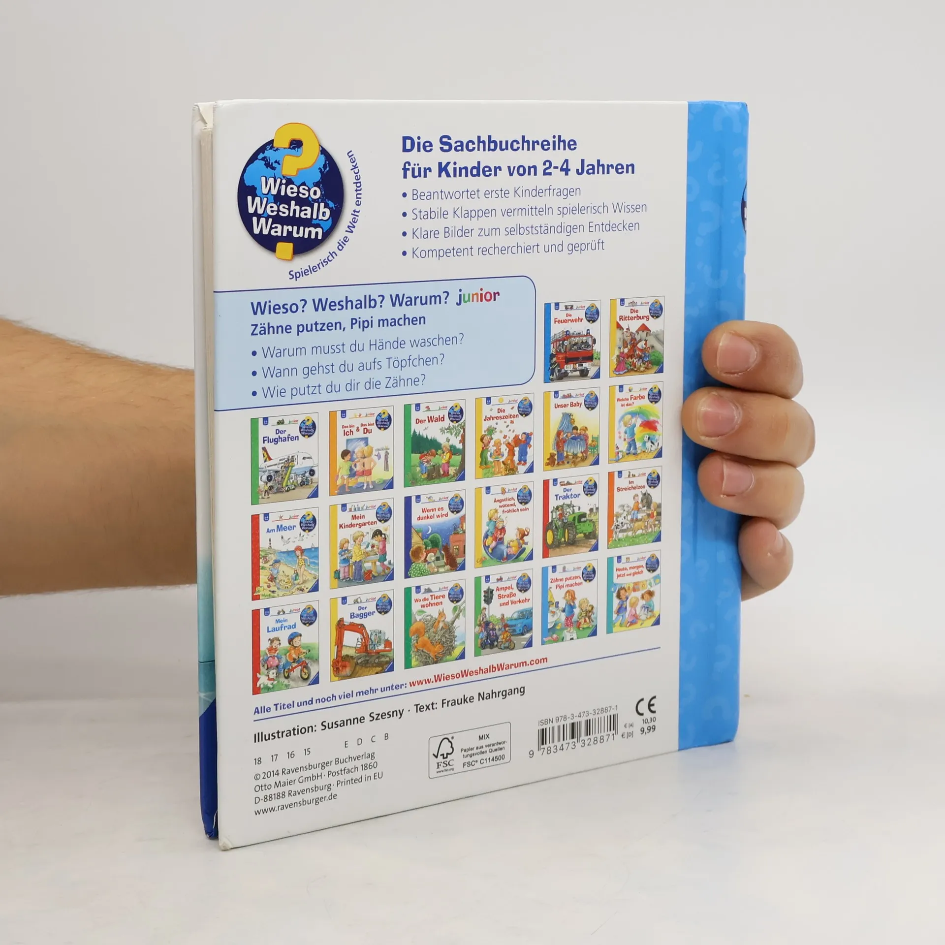 Das Abenteuer Badezimmer kann beginnen: Warum musst du Hände waschen? Wie putzt du dir die Zähne? Wann gehst du aufs Töpfchen? Hier lernen Kinder die tägliche Routine im Badezimmer spielerisch kennen. Gleichzeitig gibt das Buch klare und verständliche Antworten darauf, warum Körperpflege so wichtig ist. So verlieren Kinder die Scheu vor Seife und Schaum und aus Badetagen werden Lieblingstage! Wieso? Weshalb? Warum? junior Die Sachbuchreihe für Kinder von 2-4 Jahren Jeden Tag entdecken Kinder etwas Neues – und haben viele Fragen. Wann kommt die Feuerwehr? Was machen die Tiere im Winter? Warum muss ich Zähne putzen? Die beliebte Sachbuchreihe Wieso? Weshalb? Warum? junior beantwortet die Fragen der Kinder auf Augenhöhe. Sie beleuchtet unterschiedlichste Themen aus ihrer Alltags- und Interessenswelt altersgerecht und mit viel Liebe zum Detail. Die Reihe ist speziell auf kleine Hände und die Bedürfnisse der Kleinsten angepasst. Klare und liebevolle Bilder, kurze Sachtexte sowie handliche Klappen, die Bewegungen veranschaulichen und überraschende und lustige Einblicke gewähren, ermöglichen Kindern, sich ihre Themen selbst zu erschließen. Der Spaß am eigenhändigen Entdecken, die liebevolle Umsetzung und die hochwertige Ausstattung garantieren langanhaltende Freude an jedem Buch.