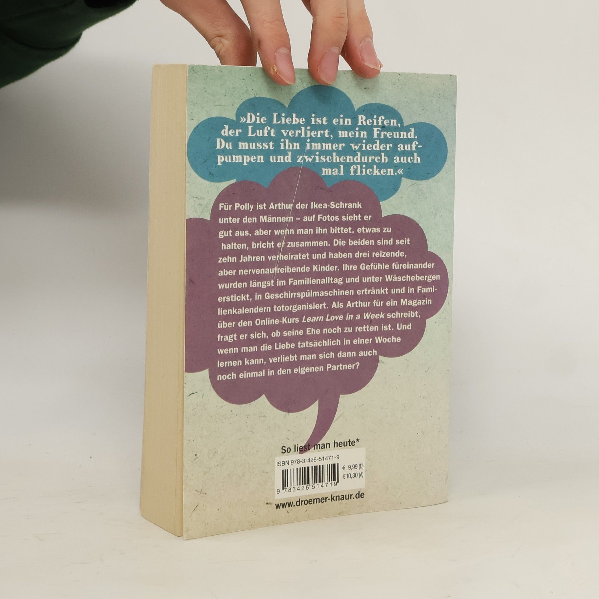 „Die Liebe ist ein Reifen, der Luft verliert, mein Freund. Du musst ihn immer wieder aufpumpen und zwischendurch auch mal flicken.“ Für Polly ist Arthur der Ikea-Schrank unter den Männern – auf Fotos sieht er gut aus, aber wenn man ihn bittet, etwas zu halten, bricht er zusammen. Die beiden sind seit zehn Jahren verheiratet und haben drei reizende, aber nervenaufreibende Kinder. Ihre Gefühle füreinander wurden längst im Alltag und unter Wäschebergen erstickt, in Geschirrspülmaschinen ertränkt und in Familienkalendern totorganisiert. Als Arthur für ein Magazin über den Online-Kurs „Learn Love In A Week“ schreibt, fragt er sich, ob seine Ehe noch eine Chance hat. Und wenn man die Liebe tatsächlich in einer Woche lernen kann, verliebt man sich dann auch noch einmal in den eigenen Partner?