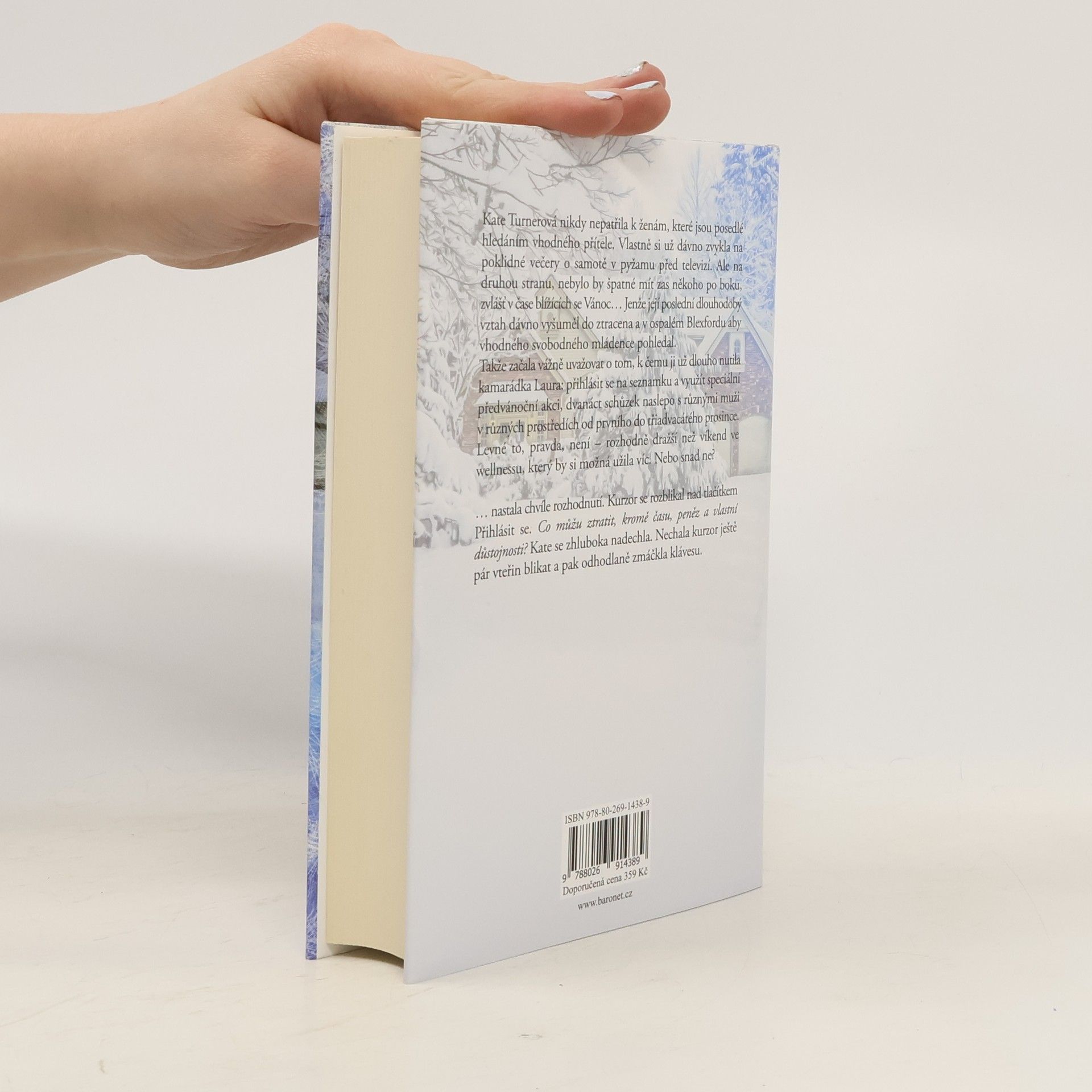 Kate Turnerová nikdy nepatřila k ženám, které jsou posedlé hledáním vhodného přítele. Vlastně si už dávno zvykla na poklidné večery o samotě v pyžamu před televizí. Ale na druhou stranu, nebylo by špatné mít zas někoho po boku, zvlášť v čase blížících se Vánoc… Jenže její poslední dlouhodobý vztah dávno vyšuměl do ztracena a v ospalém Blexfordu aby vhodného svobodného mládence pohledal. Takže začala vážně uvažovat o tom, k čemu ji už dlouho nutila kamarádka Laura: přihlásit se na seznamku a využít speciální předvánoční akci, dvanáct schůzek naslepo s různými muži v různých prostředích od prvního do třiadvacátého prosince. Levné to, pravda, nebylo – rozhodně dražší než víkend ve wellnessu, který by si možná užila víc. Nebo snad ne? Nastala chvíle rozhodnutí. Kurzor se rozblikal nad tlačítkem Přihlásit se. Co můžu ztratit, kromě času, peněz a vlastní důstojnosti? Kate se zhluboka nadechla. Nechala kurzor ještě pár vteřin blikat a pak odhodlaně zmáčkla klávesu.