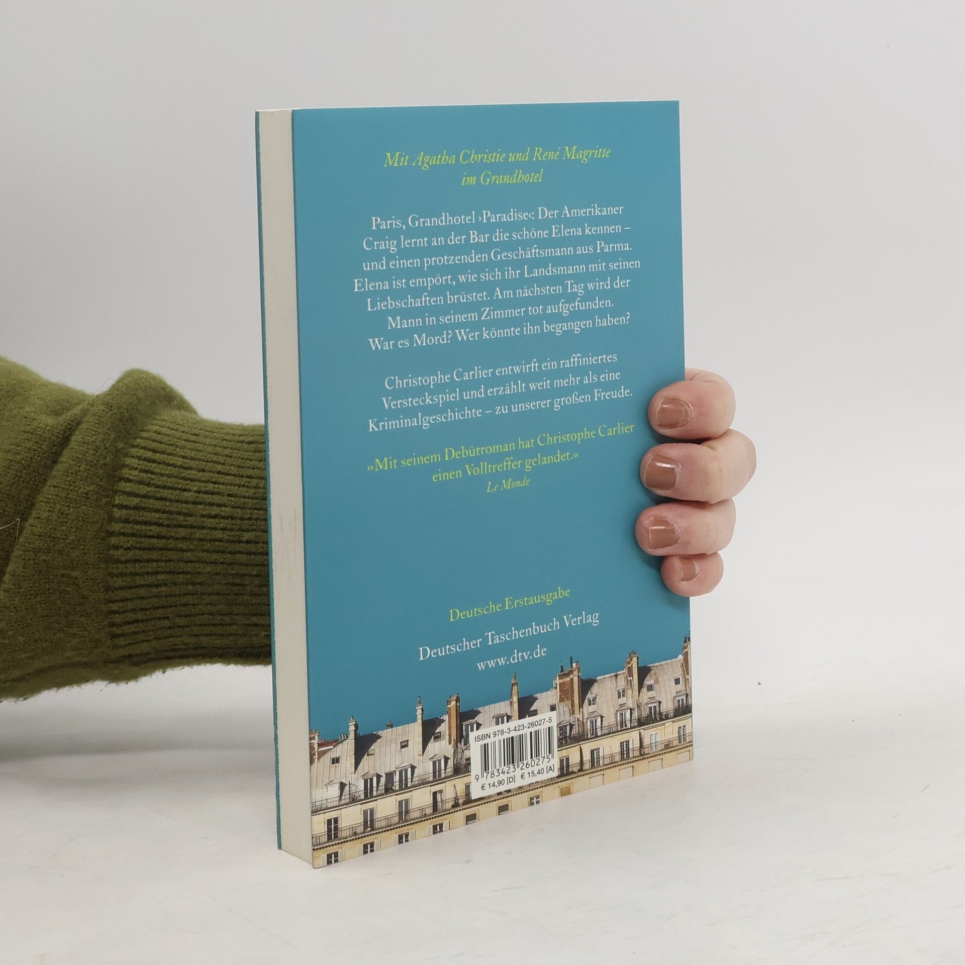 Mit Agatha Christie und René Magritte an der Hotelbar Das Pariser Grandhotel Paradise ist eine Welt für sich. Craig, ein amerikanischer Literaturwissenschaftler, lernt dort an der Bar die schöne Italienerin Elena kennen – und einen protzenden Geschäftsmann aus Parma. Elena ist empört, wie sich ihr Landsmann mit seinen Liebschaften brüstet. Am nächsten Tag wird der Mann in seinem Zimmer tot aufgefunden. War es Mord? Im Hotel dreht sich nun alles um Wahrheit und Betrug, Liebe und Eifersucht. Jeder verdächtigt jeden. Christophe Carlier hat ein raffiniertes Versteckspiel entworfen. Lustvoll, mit vielen literarischen Anspielungen erzählt er weit mehr als eine Kriminalgeschichte. Ausgezeichnet mit dem 'Prix du premier roman'.