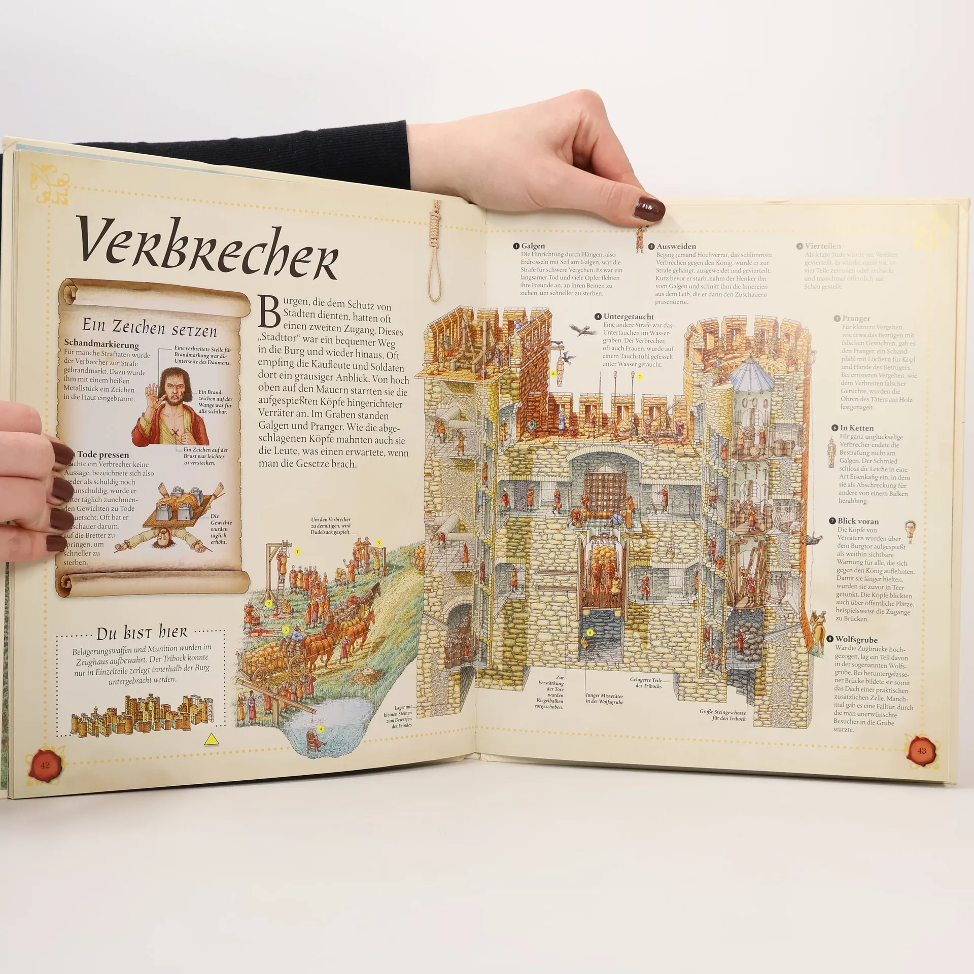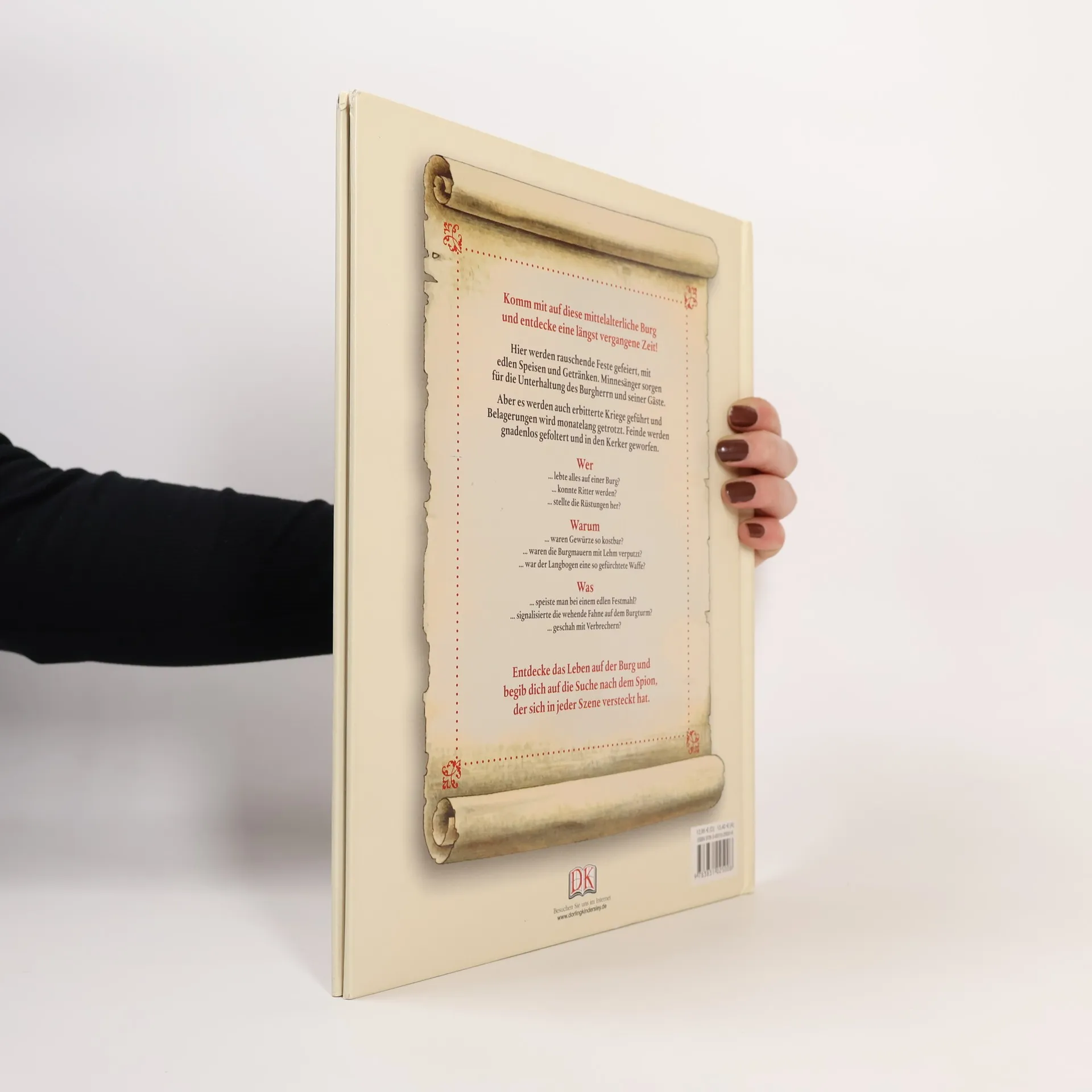 Mittelalter hautnah: Mit diesem Buch taucht man stundenlang in die Welt der Ritter und Burgbewohner ein! 10 große Querschnitt-Zeichnungen, die mit viel Liebe zum Detail gestaltet sind, zeigen die Räumlichkeiten der Burg, ihre Bewohner und jeden noch so geheimen Winkel - vom tiefsten Kerker bis zur höchsten Zinne. Kleine Leser werden ausführlich über den Alltag auf der Burg informiert, z. B. wie man sich gegen feindliche Angriffe verteidigt hat oder wie große Feste gefeiert wurden. Auf dieser spannenden Zeitreise ins Mittelalter lernen Kinder, wie es war, zu dieser Zeit zu leben. Mit jedem Mal Lesen können sie immer wieder neue, spannende Details entdecken. Als besonderes Extra versteckt sich in jeder Burgszene ein Spion, der gefunden werden will. Das macht Spaß und lädt Kinder ein, sich in die detailreichen Illustrationen zu vertiefen! Ab 6 Jahren