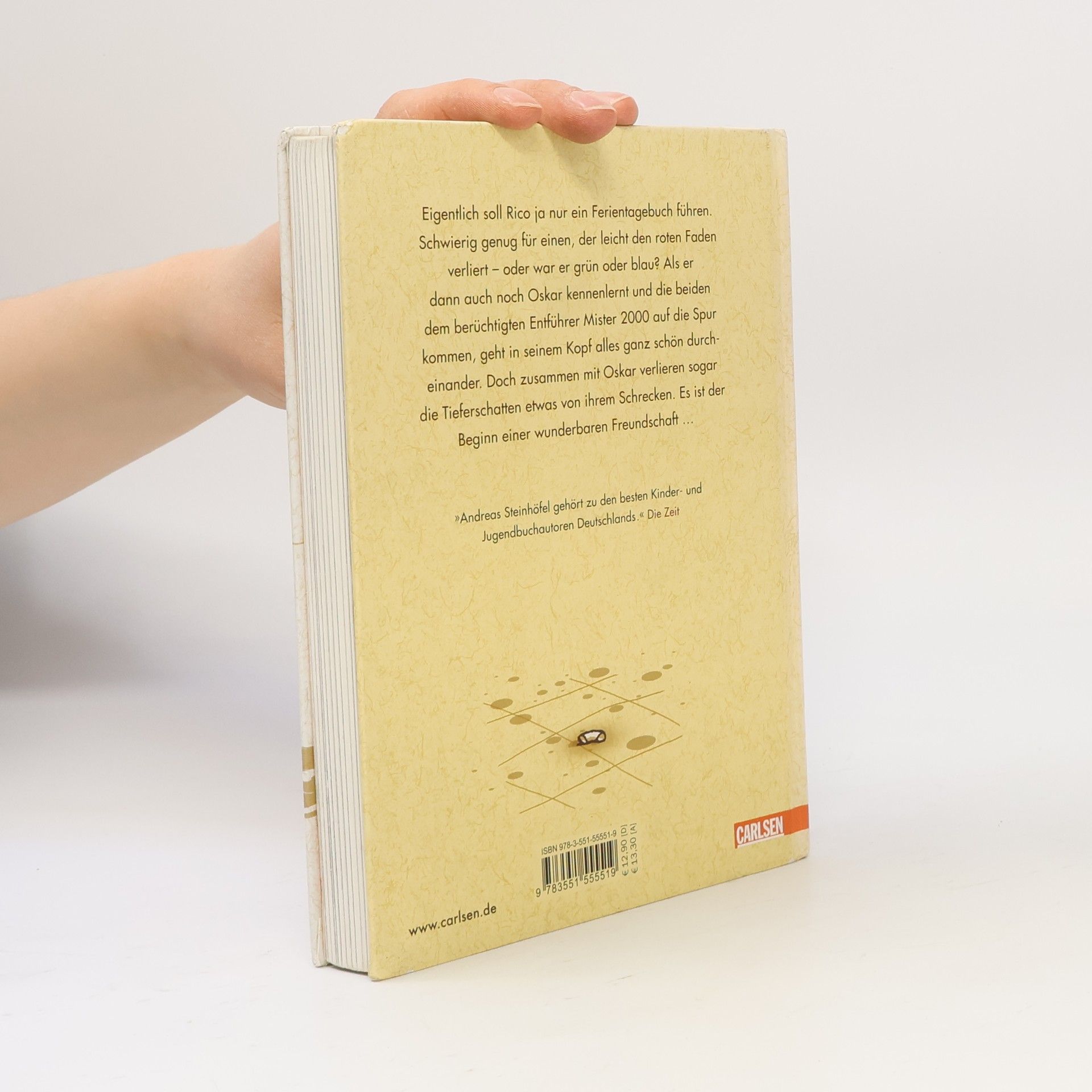 Eigentlich soll Rico ja nur ein Ferientagebuch führen. Schwierig genug für einen, der leicht den roten oder den grünen oder auch den blauen Faden verliert. Aber als er dann auch noch Oskar mit dem blauen Helm kennen lernt und die beiden dem berüchtigten ALDI-Kidnapper auf die Spur kommen, geht es in seinem Kopf ganz schön durcheinander. Doch zusammen mit Oskar verlieren sogar die Tieferschatten etwas von ihrem Schrecken. Es ist der Beginn einer wunderbaren Freundschaft ... Alle Bücher über Rico und Oskar:Rico, Oskar und der Diebstahlstein Rico, Oskar und das Herzgebreche Rico, Oskar und die TieferschattenRico, Oskar und das Vomhimmelhoch Kindercomics:Rico & Oskar – Fische aus Silber Rico & Oskar – Die Regenhütte