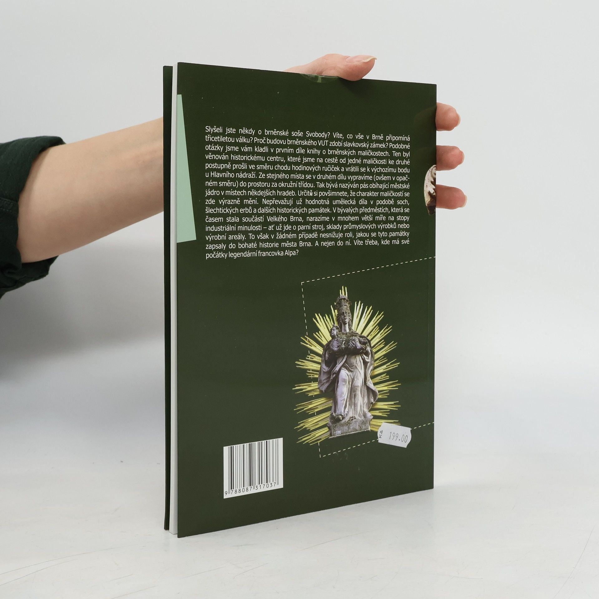 Slyšeli jste někdy o brněnské soše Svobody? Víte, co vše v Brně připomíná třicetiletou válku? Proč budovu brněnského VUT zdobí slavkovský zámek? Podobné otázky jsme vám kladli v prvním díle knihy o brněnských maličkostech. Ten byl věnován historickému centru, které jsme na cestě od jedné maličkosti ke druhé postupně prošli ve směru chodu hodinových ručiček a vrátili se k výchozímu bodu u Hlavního nádraží. Ze stejného místa se v druhém dílu vypravíme (ovšem v opačném směru) do prostoru za okružní třídou. Tak bývá nazýván pás obíhající městské jádro v místech někdejších hradeb. Určitě si povšimnete, že charakter maličkostí se zde výrazně mění. Nepřevažují už hodnotná umělecká díla v podobě soch, šlechtických erbů a dalších historických památek. V bývalých předměstích, která se časem stala součástí Velkého Brna, narazíme v mnohem větší míře na stopy industriální minulosti – ať už jde o parní stroj, sklady průmyslových výrobků nebo výrobní areály. To však v žádném případě nesnižuje roli, jakou se tyto památky zapsaly do bohaté historie města Brna. A nejen do ní. Víte třeba, kde má své počátky legendární francovka Alpa?