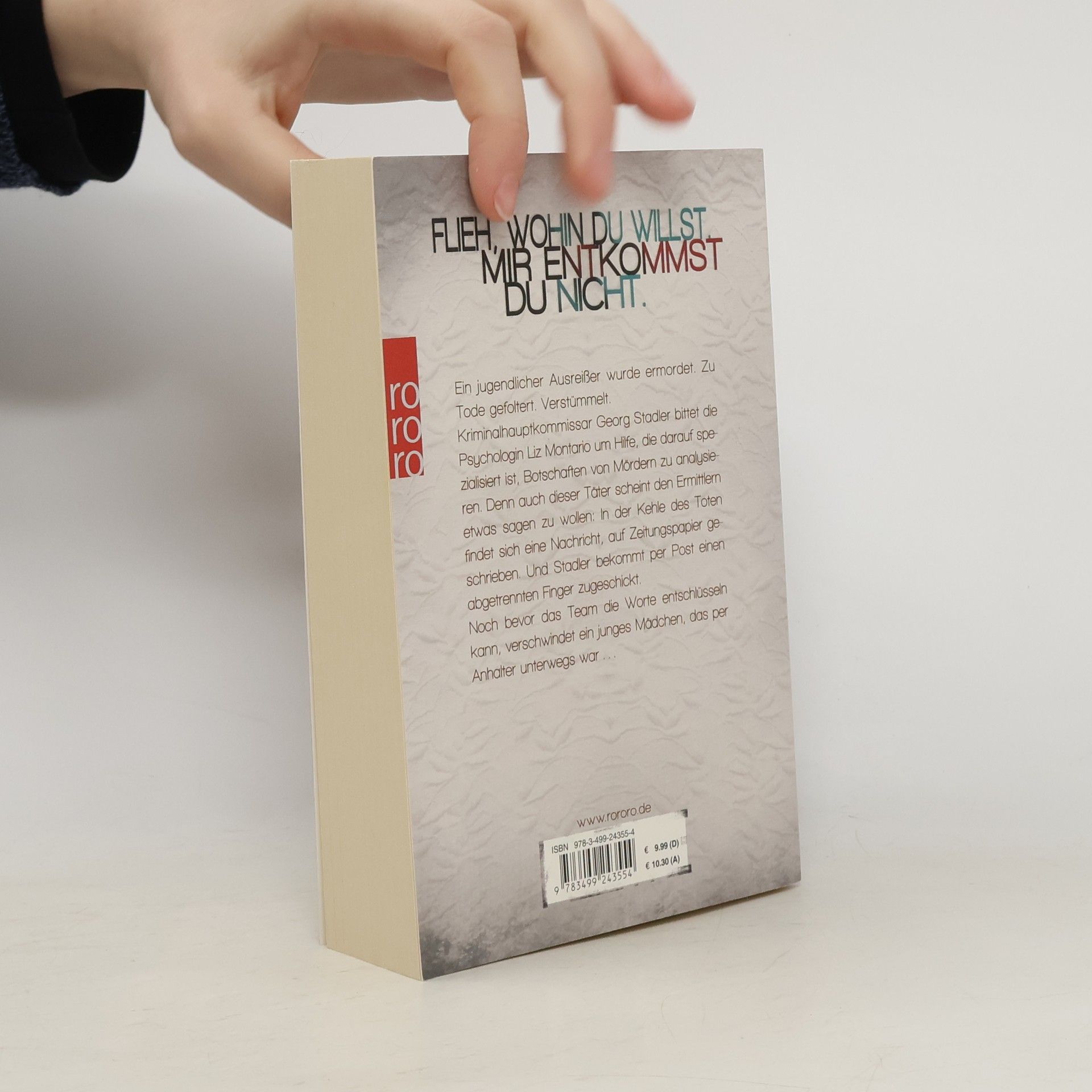 Flieh, wohin du willst. Mir entkommst du nicht. Ein jugendlicher Ausreißer wurde ermordet. Zu Tode gefoltert. Verstümmelt. Kriminalhauptkommissar Georg Stadler bittet die Psychologin Liz Montario um Hilfe, die darauf spezialisiert ist, Botschaften von Mördern zu analysieren. Denn auch dieser Täter scheint den Ermittlern etwas sagen zu wollen: In der Kehle des Toten findet sich eine Nachricht, auf Zeitungspapier geschrieben. Und Stadler bekommt per Post einen abgetrennten Finger zugeschickt. Noch bevor das Team die Worte entschlüsseln kann, verschwindet ein junges Mädchen, das per Anhalter unterwegs war …