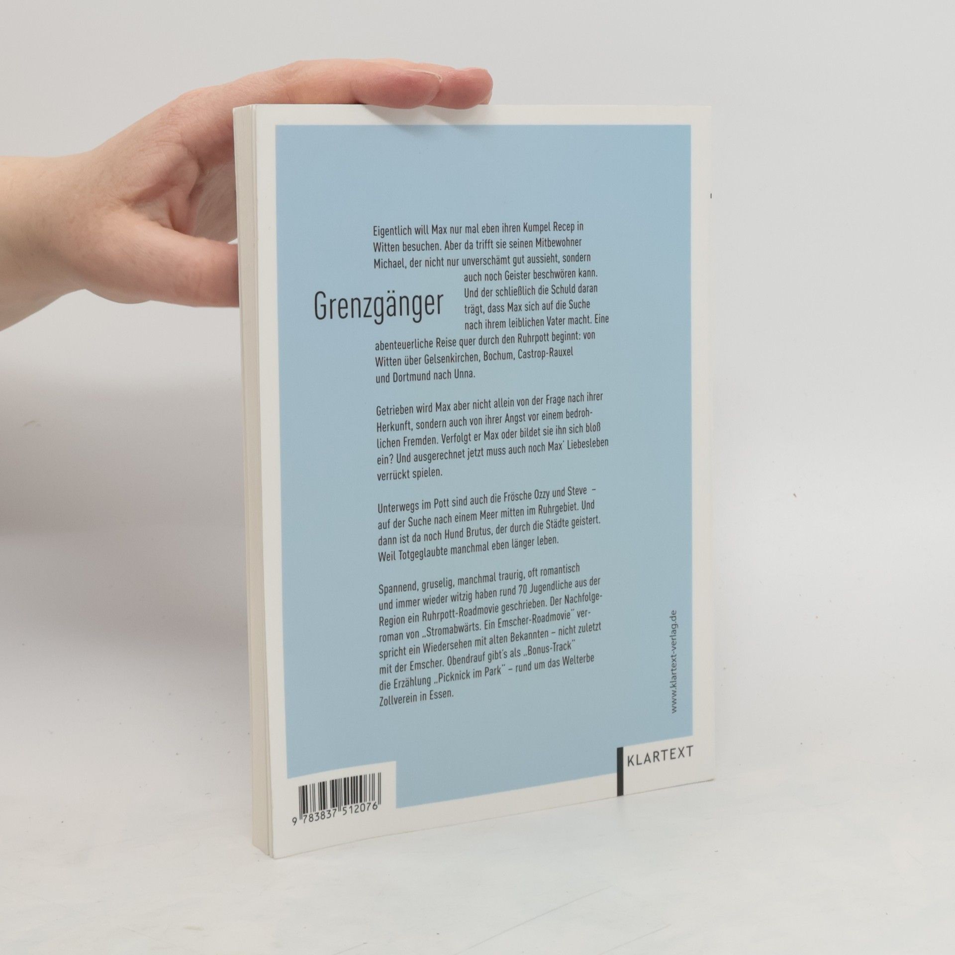 Eigentlich will Max nur mal eben ihren Kumpel Recep in Witten besuchen. Aber da trifft sie seinen Mitbewohner Michael, der nicht nur unverschämt gut aussieht, sondern auch noch Geister beschwören kann. Und der schließlich die Schuld daran trägt, dass Max sich auf die Suche nach ihrem leiblichen Vater macht. Eine abenteuerliche Reise quer durch den Ruhrpott beginnt: von Witten über Gelsenkirchen, Bochum, Castrop-Rauxel und Dortmund nach Unna. Getrieben wird Max aber nicht allein von der Frage nach ihrer Herkunft, sondern auch von ihrer Angst vor einem bedrohlichen Fremden. Verfolgt er Max oder bildet sie ihn sich bloß ein? Und ausgerechnet jetzt muss auch noch Max’ Liebesleben verrückt spielen. Unterwegs im Pott sind auch die Frösche Ozzy und Steve – auf der Suche nach einem Meer mitten im Ruhrgebiet. Und dann ist da noch Hund Brutus, der durch die Städte geistert. Weil Totgeglaubte manchmal eben länger leben. Spannend, gruselig, manchmal traurig, oft romantisch und immer wieder witzig haben rund 70 Jugendliche aus der Region ein Ruhrpott-Roadmovie geschrieben. Der Nachfolgeroman von „Stromabwärts. Ein Emscher-Roadmovie“ verspricht ein Wiedersehen mit alten Bekannten – nicht zuletzt mit der Emscher. Obendrauf gibt’s als „Bonus-Track“ die Erzählung „Picknick im Park“ – rund um das Welterbe Zollverein in Essen.