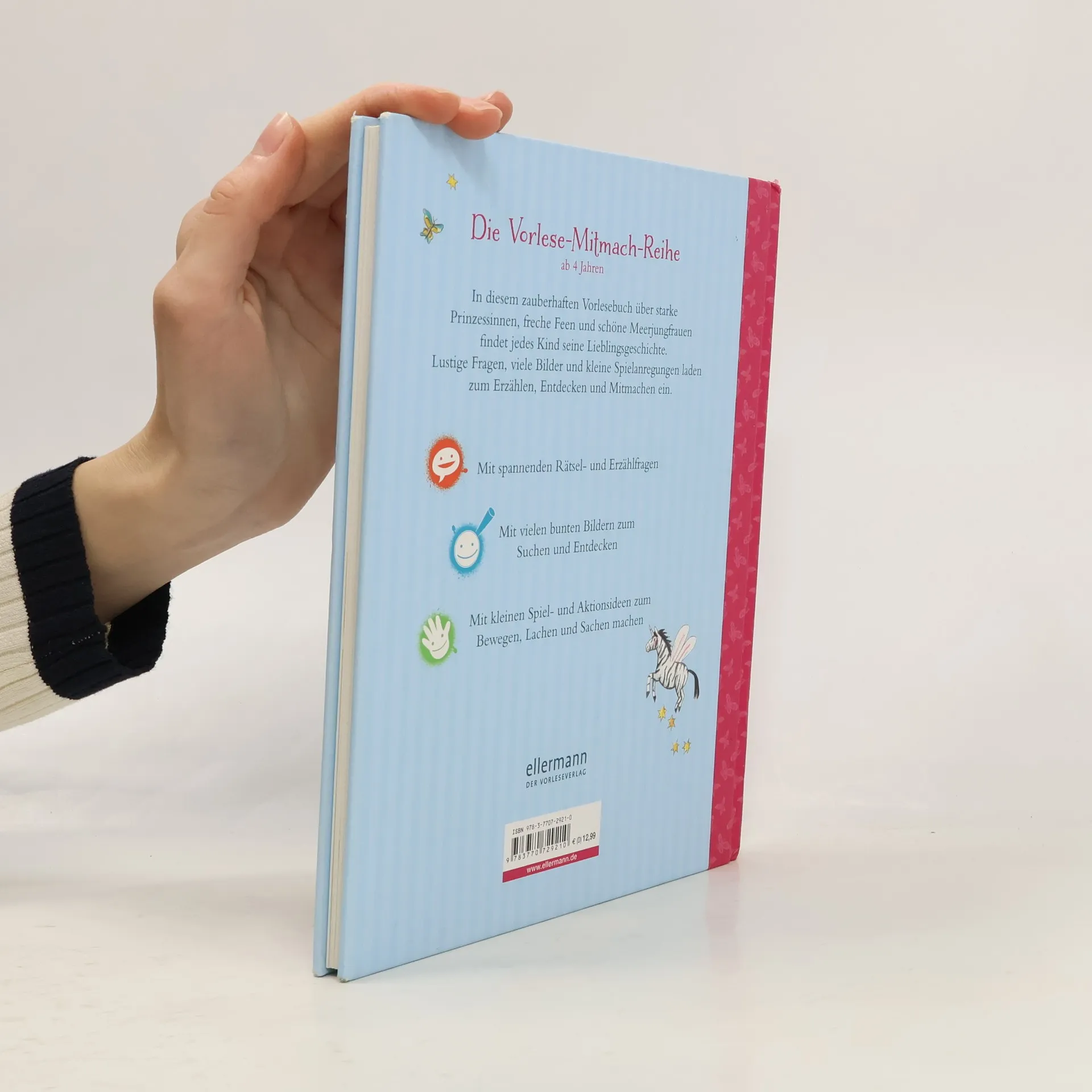 Die Vorlese-Mitmach-Reihe - Vorlesen mal anders Perfekt für kleine Geschichtenfans: Hier kommen zauberhafte Abenteuer zum Mitmachen. Denn während Mama oder Papa vorlesen, können die Kinder sich eifrig einbringen. Durch farbenfrohe Symbole ist im Buch klar erkennbar, ob es gerade etwas zum Erzählen, zum Entdecken oder zum Aktiv-werden gibt. Und das Beste: Dabei dreht sich alles um die Lieblingsfiguren Prinzessin, Fee, Meerjungfrau und viele mehr. Das neue interaktive Konzept mit Vorlesetipps am Ende des Buches fördert die Sprachkompetenz und macht Spaß. Durch altersgerechte Gesprächsideen, Fragen und Rätsel werden Vorleser und ihre kleinen Zuhörer animiert, die Geschichten selbst mitzugestalten. Mit spannenden Rätsel- und Erzählfragen. Mit vielen bunten Bildern zum Suchen und Entdecken. Mit kleinen Spiel- und Aktionsideen zum Bewegen, Lachen und Sachen machen.