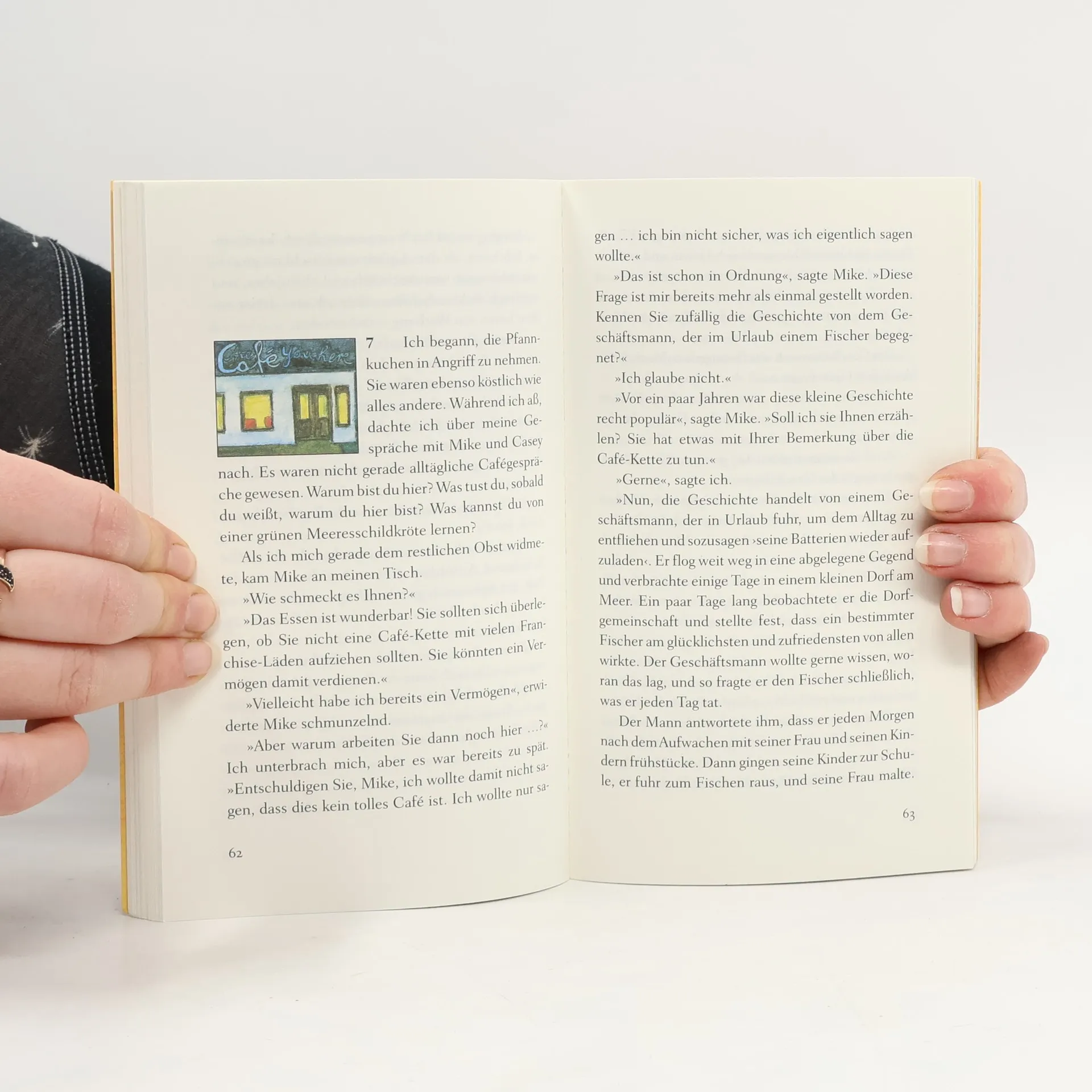 Humorvoll und anrührend Ein kleines Café mitten im Nirgendwo wird zum Wendepunkt im Leben von John, einem Werbemanager, der stets in Eile ist. Eigentlich will er nur kurz Rast machen, doch dann entdeckt er auf der Speisekarte neben dem Menü des Tages drei Fragen: »Warum bist du hier? Hast du Angst vor dem Tod? Führst du ein erfülltes Leben?« Wie seltsam – doch einmal neugierig geworden, will John mithilfe des Kochs, der Bedienung und eines Gastes dieses Geheimnis ergründen. Die Fragen nach dem Sinn des Lebens führen ihn gedanklich weit weg von seiner Vorstandsetage an die Meeresküste von Hawaii. Dabei verändert sich seine Einstellung zum Leben und zu seinen Beziehungen, und er erfährt, wie viel man von einer weisen grünen Meeresschildkröte lernen kann. So gerät diese Reise letztlich zu einer Reise zum eigenen Selbst. Ein ebenso lebendig geschriebenes, humorvolles wie anrührendes Buch. Durchgehend vierfarbig, mit Illustrationen von Root Leeb.