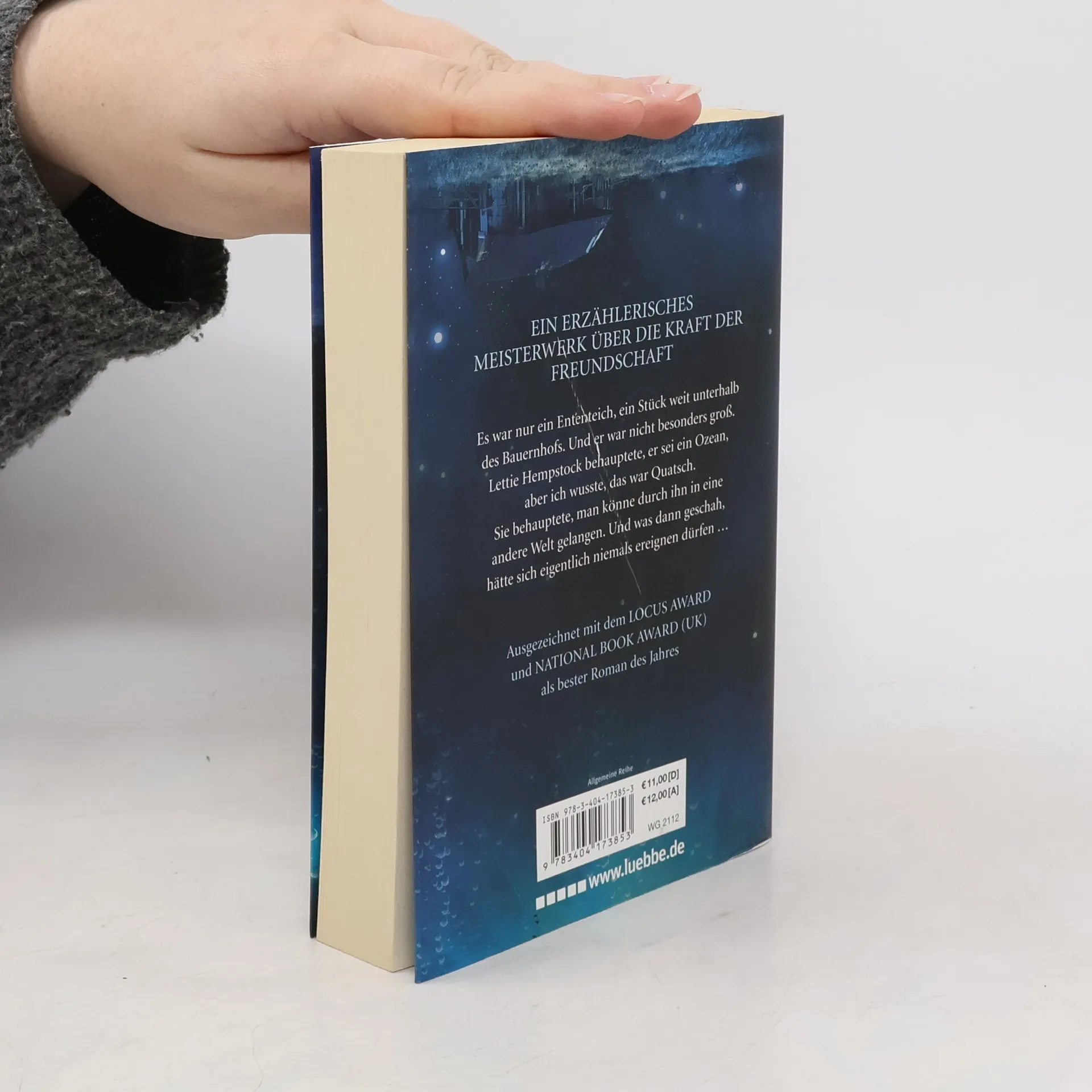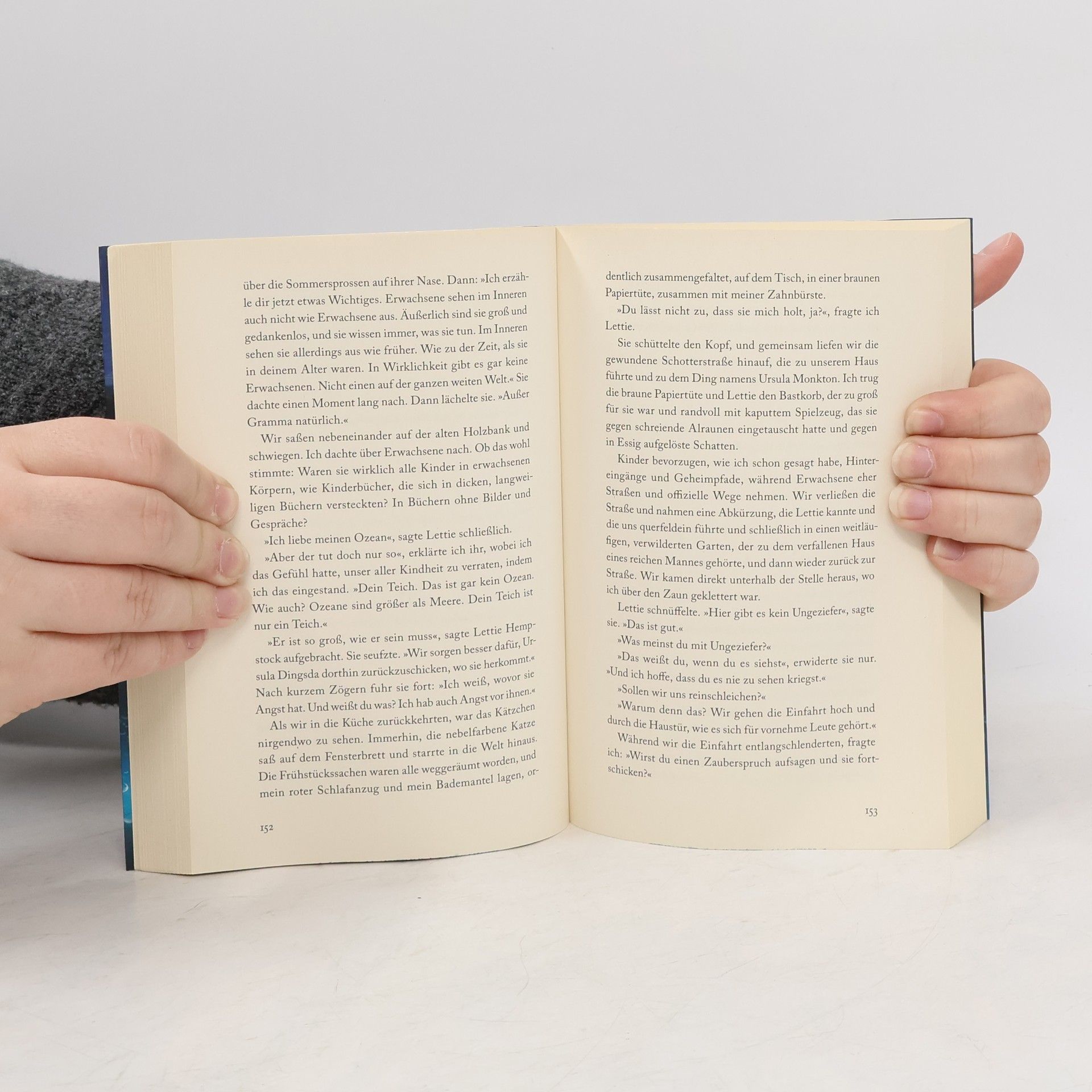 Es war nur ein Ententeich, ein Stück weit unterhalb des Bauernhofs. Und er war nicht besonders groß. Lettie Hempstock behauptete, er sei ein Ozean, aber ich wusste, das war Quatsch. Sie behauptete, man könne durch ihn in eine andere Welt gelangen. Und was dann geschah, hätte sich eigentlich niemals ereignen dürfen ...