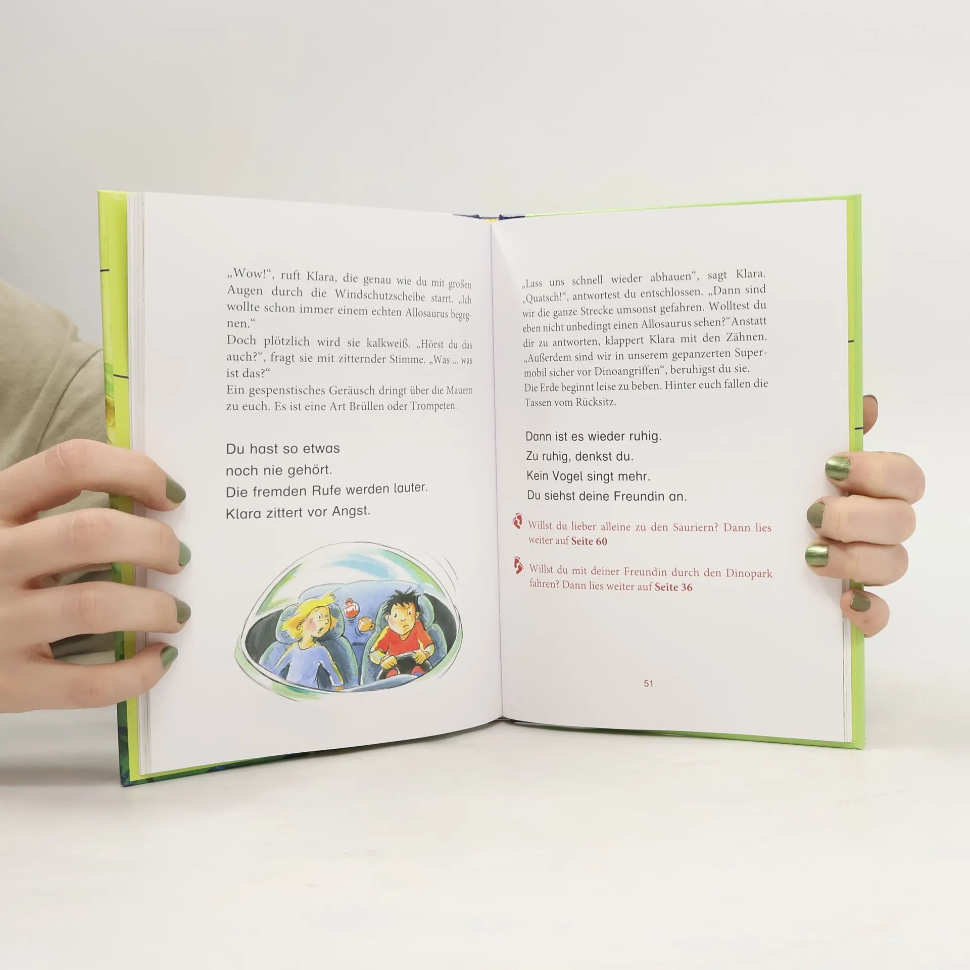 Die erfolgreiche Kinderbuchreihe ab 6 Jahren mit bewährtem Konzept für das gemeinsame Lesenlernen und -übenDie erfolgreiche Kinderbuchreihe ab 6 Jahren mit bewährtem Konzept für das gemeinsame Lesenlernen und -üben Schon lange haben deine Freundin Klara und du sich auf dieses Abenteuer gefreut: Gemeinsam wollt ihr den Dinopark erkunden. Doch vergesst nicht, nicht jeder Dinosaurier ist so niedlich wie er aussieht ... Jetzt gilt es, einen kühlen Kopf zu bewahren! Denn auf dieser Expedition bist DU der Held, der von Seite zu Seite aufs Neue entscheidet, was als nächstes passiert – und die verschiedenen Dinosaurier hautnah erlebt! Wenn das Lesen für Leseanfänger noch mühsam ist, heißt es in vielen Familien: »Lass uns gemeinsam lesen. Erst ich ein Stück, dann du. Wir wechseln uns ab.« Deswegen ist unsere beliebte Erstleser-Reihe »Erst ich ein Stück, dann du« speziell für das gemeinsame Lesen konzipiert: * Leseabschnitte für die erfahrenen Vorleser und die Leseanfänger wechseln sich ab * längere Passagen für Vorleser in kleiner Schrift * kurze Texte für Leseanfänger in Fibelschrift So macht gemeinsames Lesenlernen Spaß! Das perfekte Geschenk zur Einschulung für Jungs und Mädchen! Ausstattung: Mit fbg. Illustrationen