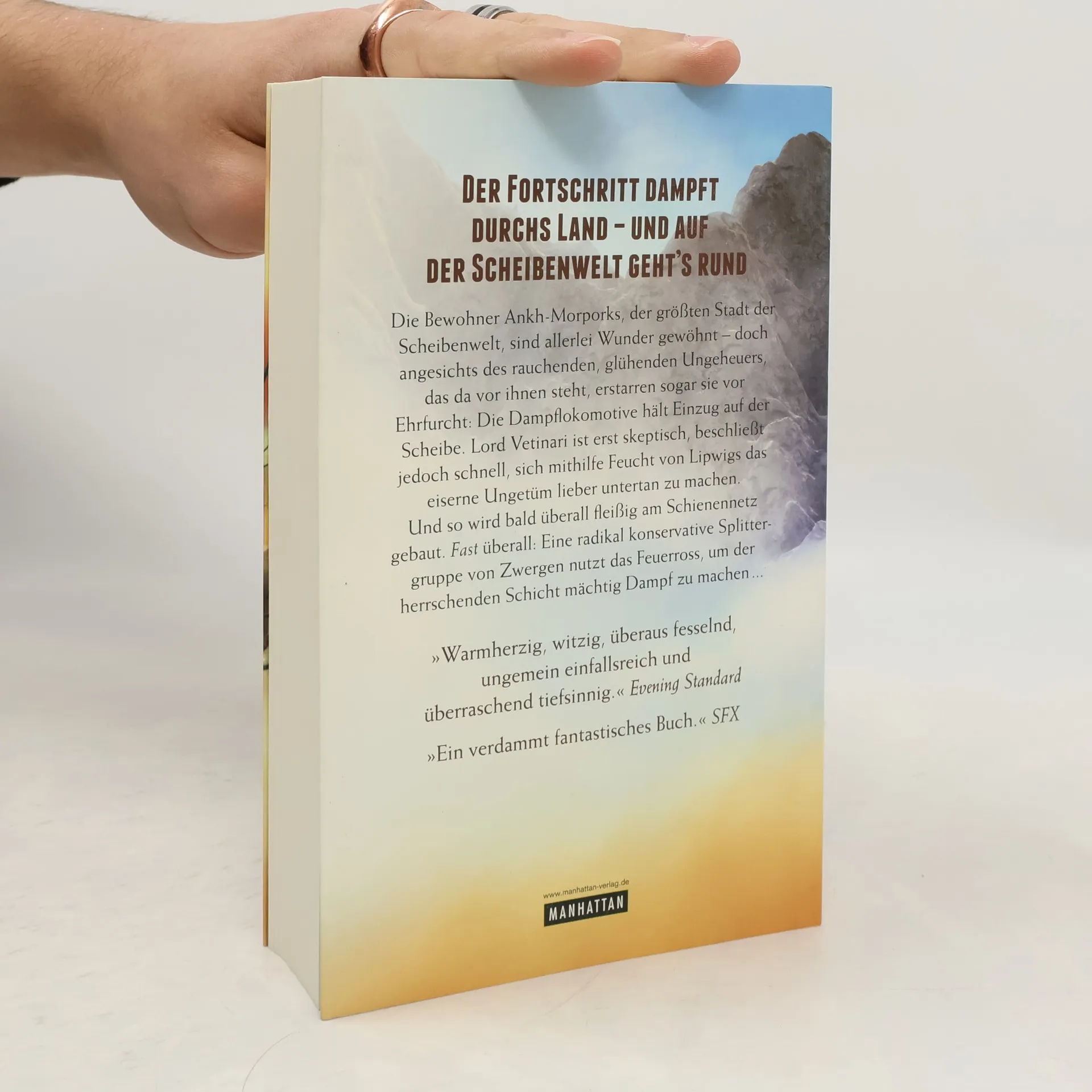Der neue große Scheibenwelt-Roman von Terry Pratchett. Ankh-Morpork, die größte Stadt der Scheibenwelt, war schon immer ein wahrer Hexenkessel – doch andernorts floss das Leben eher gemütlich dahin. Bis dank des Erfindungsreichtums eines jungen Ingenieurs die Dampflokomotive Einzug auf der Scheibe hält. Lord Vetinari ist erst skeptisch, beschließt jedoch schnell, sich das eiserne Ungetüm lieber Untertan zu machen. Er beauftragt Feucht von Lipwig – Herr der Post, der Königlichen Münze und der Königlichen Bank – nun auch das Verkehrswesen ins Rollen zu bringen. Bald wird überall fleißig am Schienennetz gebaut. Doch nicht jedermann weiß den rollenden Fortschritt zu schätzen. Und so nutzt eine radikal konservative Splittergruppe von Zwergen, die sowieso unzufrieden mit der Gesamtsituation ist, das Feuerross, um der herrschenden Schicht mächtig Dampf zu machen …