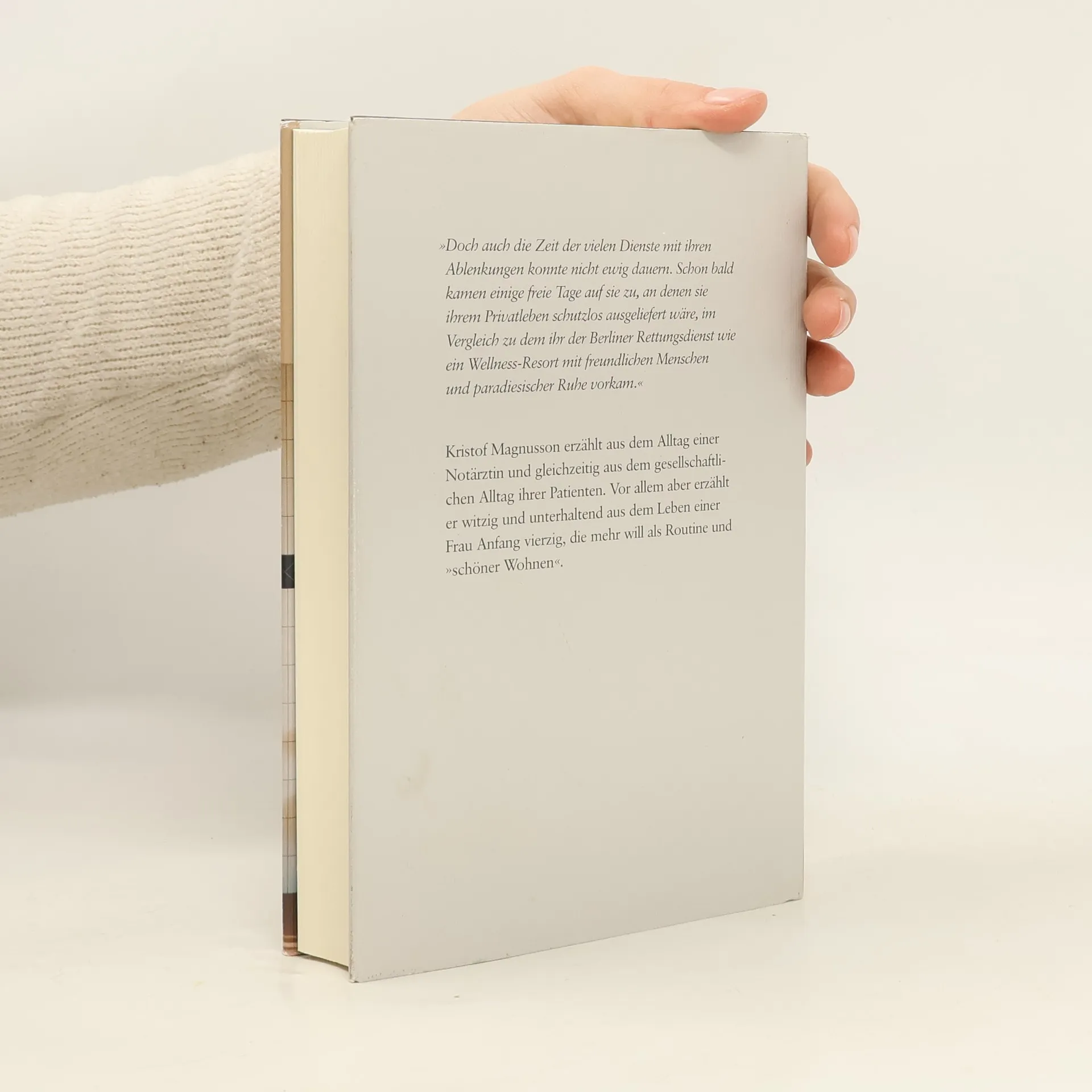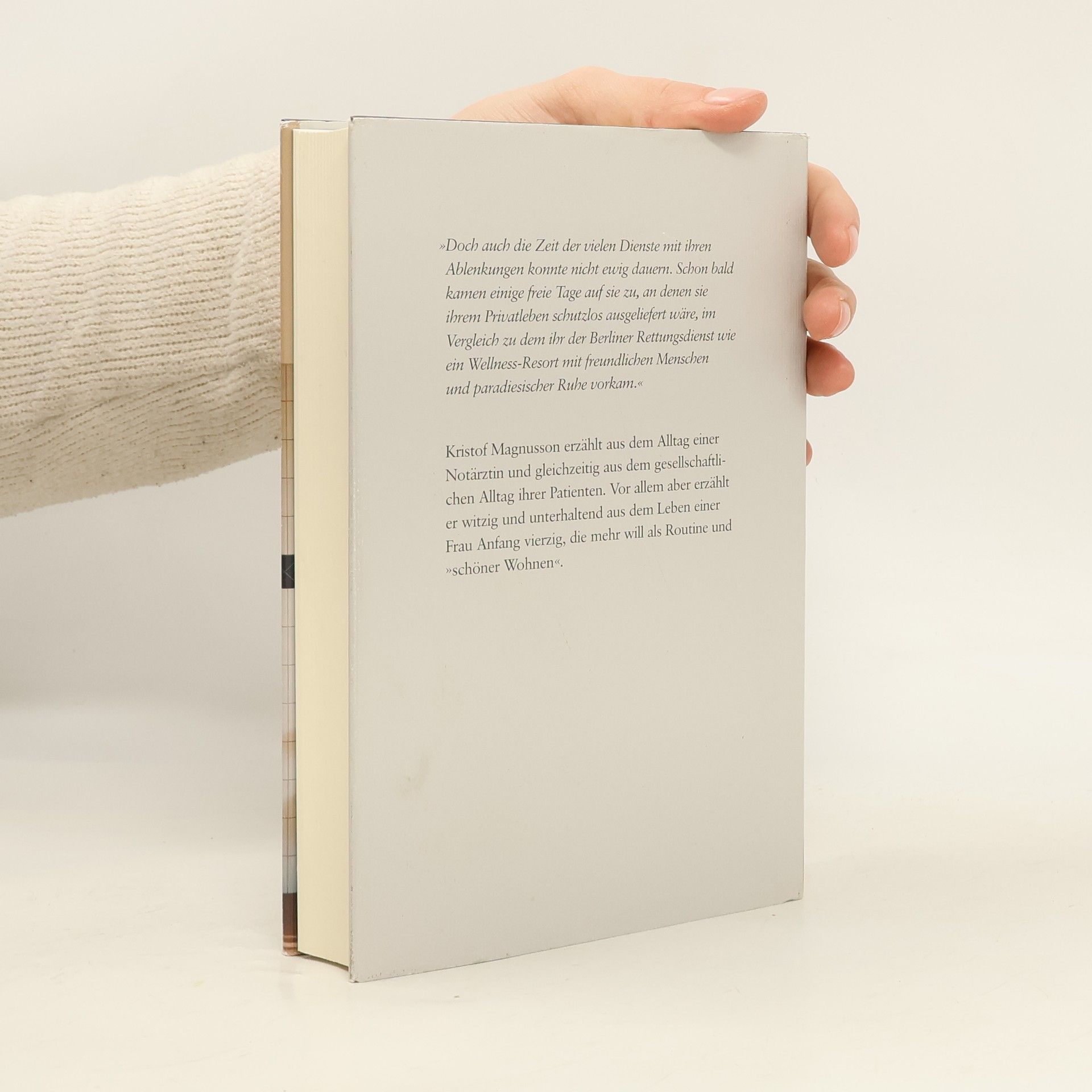 Anita Cornelius ist Notärztin an einem großen Berliner Krankenhaus und liebt ihren Beruf. Sich auf unerwartete Situationen einzustellen, entspricht ihrem Temperament. Auch wenn es bei ihren Einsätzen nicht immer so aufregend zugeht, wie man sich das vorstellt. Anita ist das recht. Sie kann helfen. Und ab und zu sogar jemandem etwas Gutes tun. Adrian, ihr Exmann, ist Arzt am selben Krankenhaus. Sie haben sich erst vor kurzem in bestem Einvernehmen getrennt, und Lukas, ihr vierzehnjähriger Sohn, lebt bei seinem Vater und dessen neuer Freundin Heidi. Hätte Anita Adrian nicht zufällig bewusstlos auf der Krankenhaustoilette gefunden, zugedröhnt mit einem Narkosemittel, und hätte Heidi nicht dauernd diese flotten Sprüche losgelassen, dass jeder seines Glückes Schmied ist, dass Arme und Kranke oft genug selbst an ihrem Zustand schuld sind, dann könnte sich Anita weiter vormachen: alles ist in bester Ordnung. Ist es aber nicht. Weder privat noch beruflich. Kristof Magnusson erzählt mit großer Kenntnis aus dem Alltag einer Notärztin und gleichzeitig aus dem Alltag ihrer Patienten. Vor allem aber erzählt er witzig und unterhaltend aus dem Leben einer Frau Anfang vierzig, die mehr will als Routine und 'schöner Wohnen'.