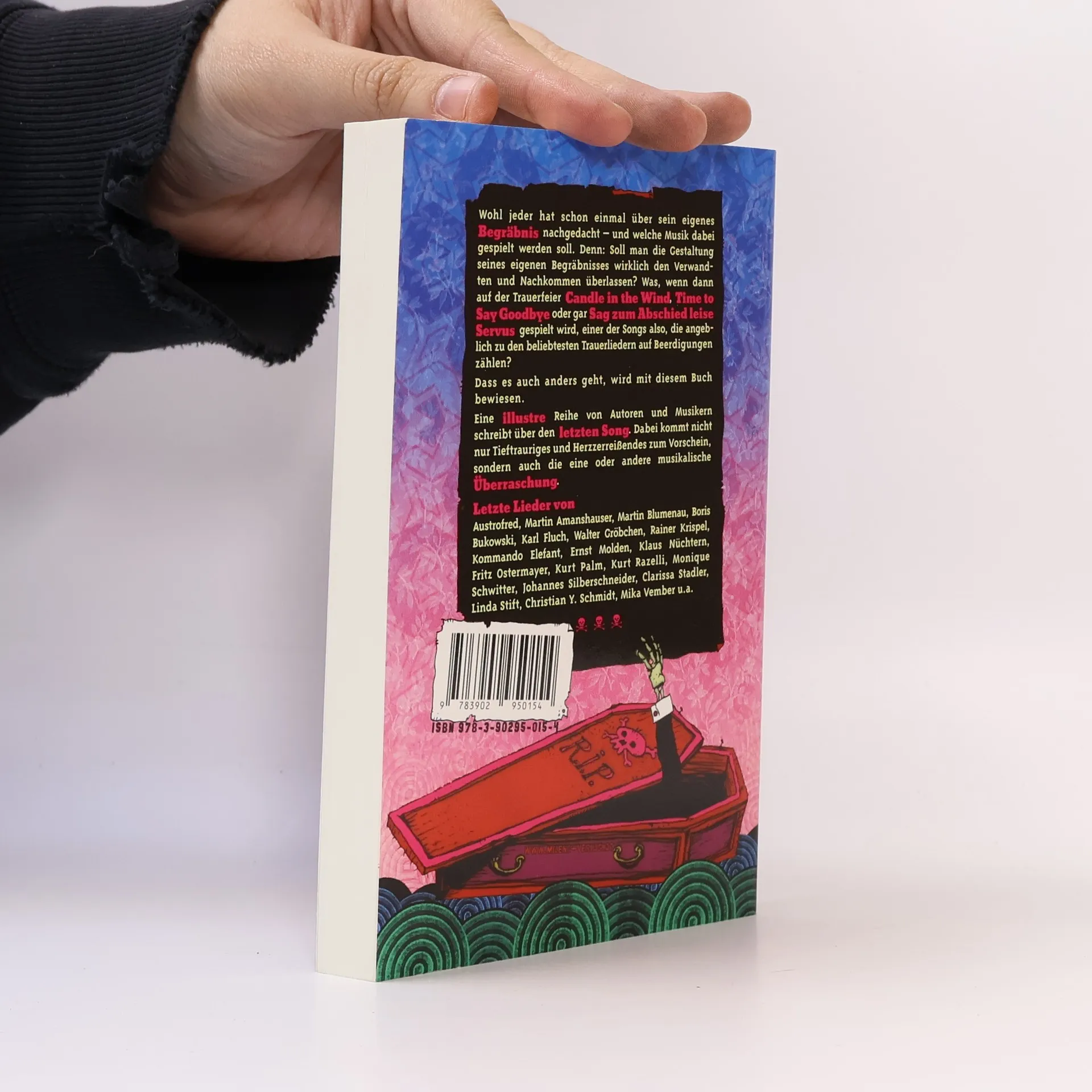 Soll man die Gestaltung seines eigenen Begräbnisses wirklich den Verwandten und Nachkommen überlassen? Was, wenn dann auf der Trauerfeier „Candle in the Wind“, „Time to Say Goodbye“ oder gar „Sag zum Abschied leise Servus“ gespielt wird, einer der Songs also, die angeblich zu den beliebtesten Trauerliedern auf Beerdigungen zählen? Dass es auch anders geht, wird mit diesem Buch bewiesen. Denn wohl jeder hat schon einmal über sein eigenes Begräbnis nachgedacht – und welche Musik dabei gespielt werden soll. Genau das macht nun eine illustre Reihe von Autoren und Autorinnen in diesem Buch und schreibt über den letzten Song. Dabei kommt nicht nur Tieftrauriges und Herzzerreißendes zum Vorschein, sondern auch die eine oder andere musikalische Überraschung. Letzte Lieder von Austrofred, Martin Amanshauser, Ernst M. Binder, Martin Blumenau, Leo Fischer (Titanic), Karl Fluch, Valerie Fritsch, Walter Gröbchen, Rainer Krispel, Kommando Elefant, Ernst Molden, Bernhard Moshammer, Klaus Nüchtern, Fritz Ostermayer, Michael Ostrowski, Kurt Palm, Wolfgang Paterno, Kurt Razelli, Monique Schwitter, Johannes Silberschneider, Clarissa Stadler, Linda Stift, Christian Y. Schmidt, Mika Vember u. a.